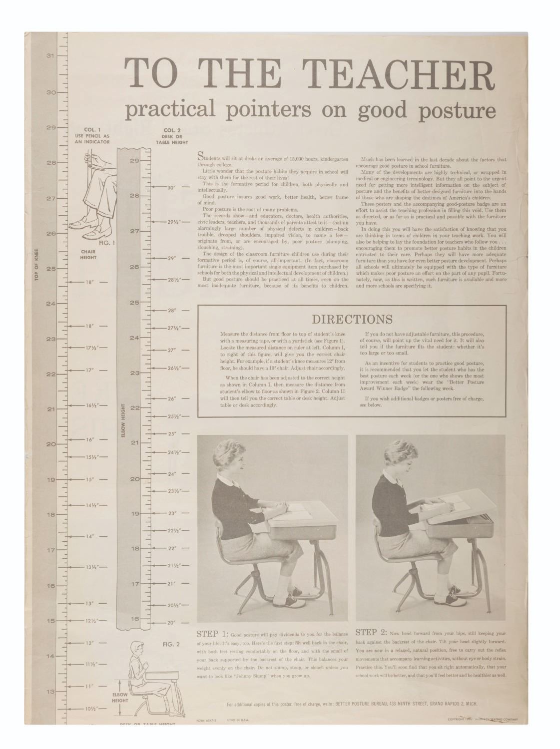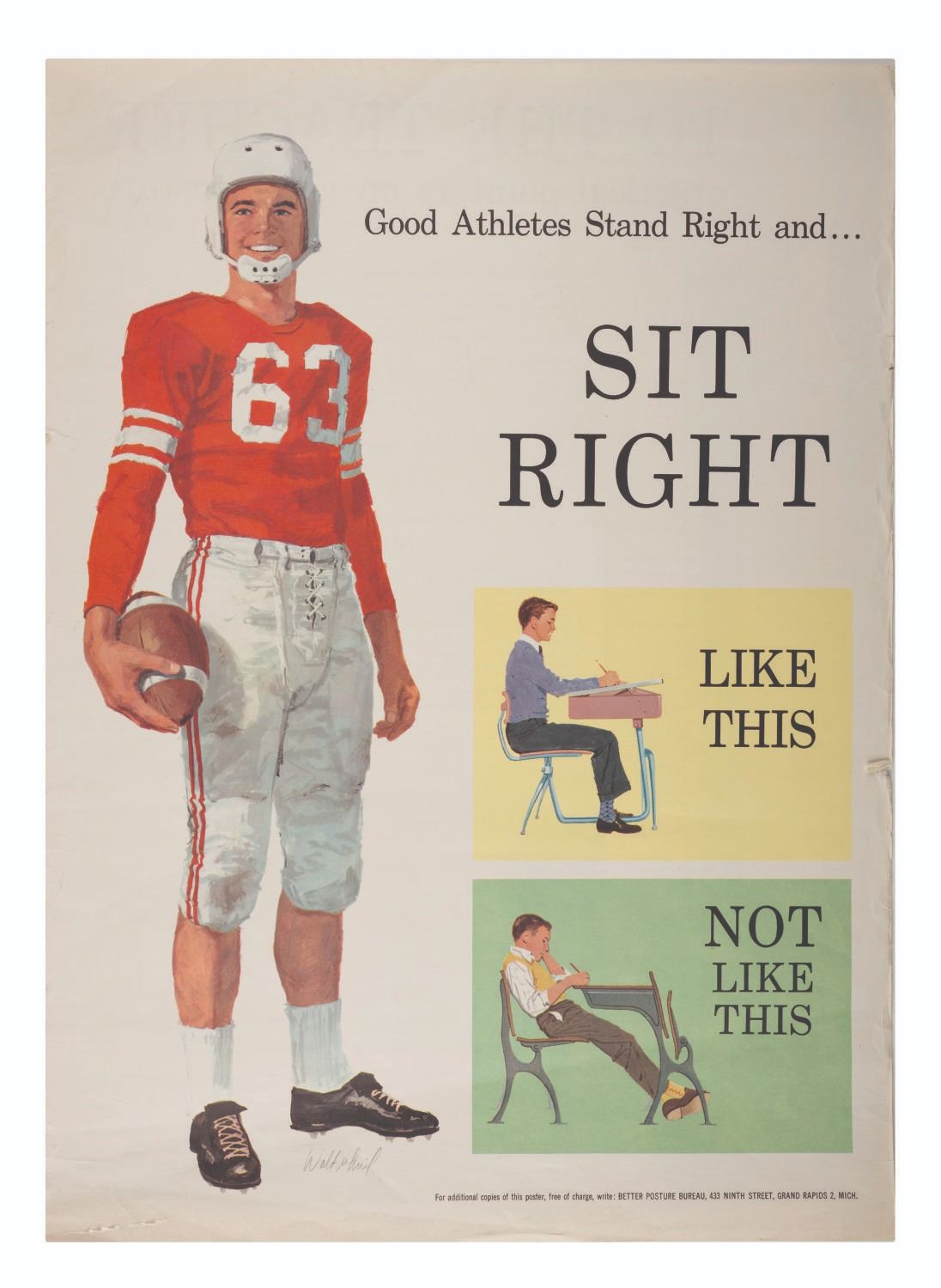(American Seating Company, 1960) A poster created by the American Seating Company, encouraging students to practice better posture like their favorite athletes. On the back are instructions and rulers to help teachers ensure that their students have proper posture. Measuring 14.5" x 20", the poster is in good condition with a 1.5" tear near the bottom left corner, edge wear, and yellowing from age.