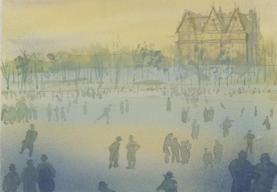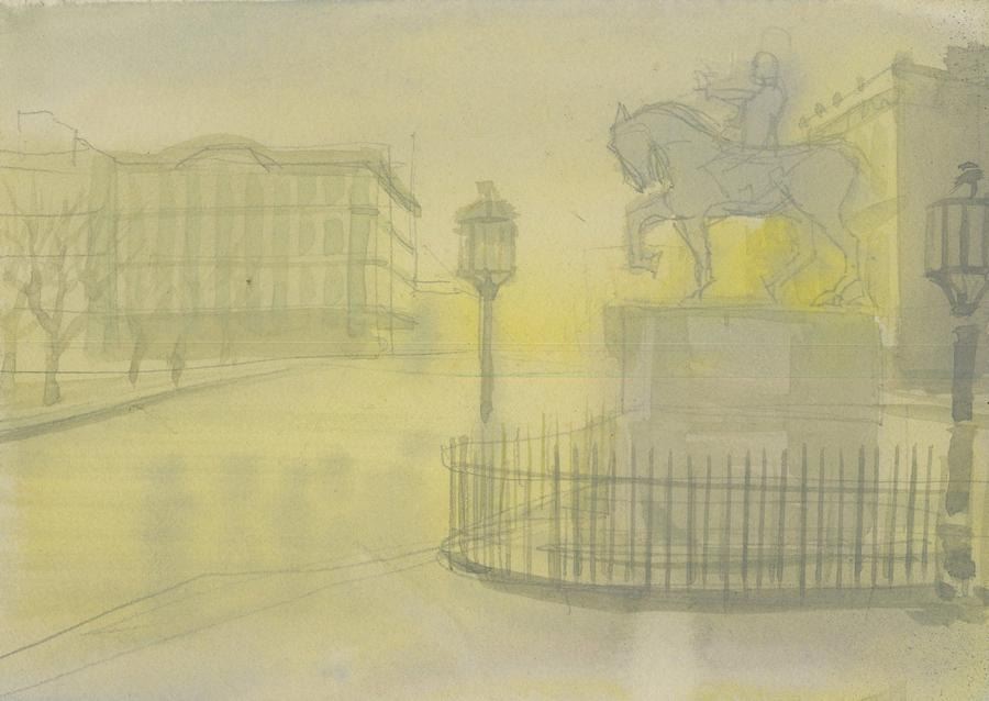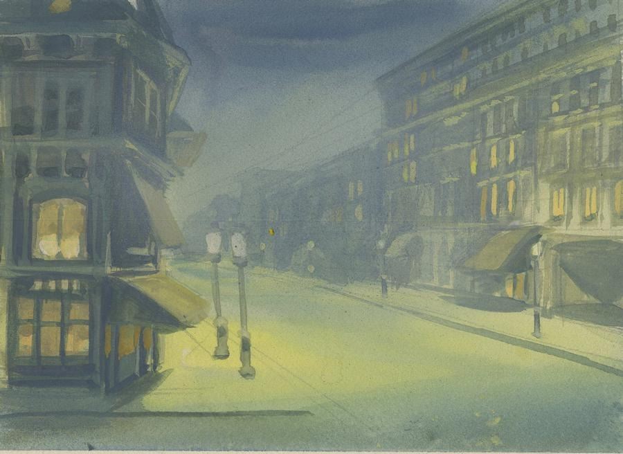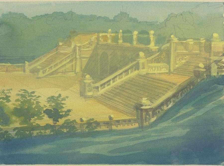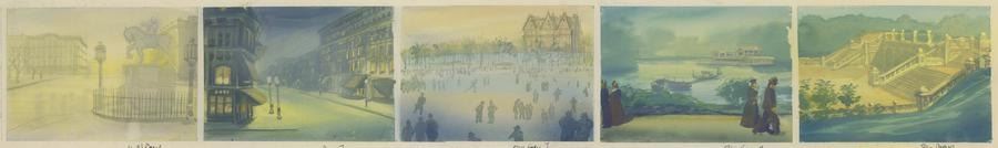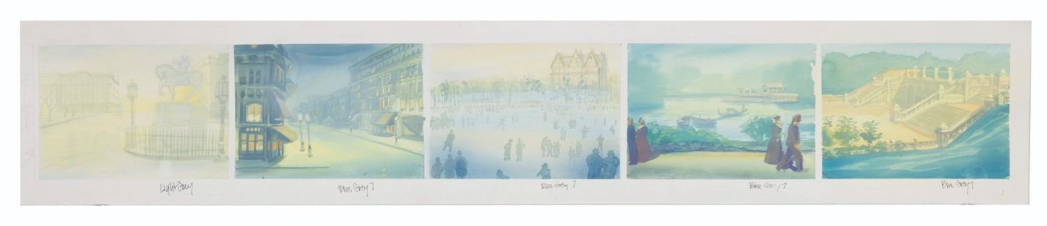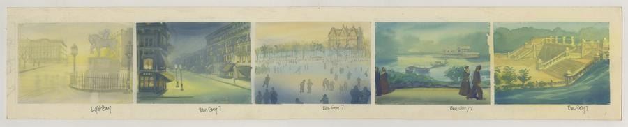 (Bluth, 1986) A five-panel background color key concept for the end credits of the Don Bluth Studios film"An American Tail." Color keys are preliminary paintings created to establish the color palette, style, and emotional tone of the final background for the film. Measuring 6" x 32.75", the background concept displays in very good condition with paper peeling throughout, light stains, and edge wear.