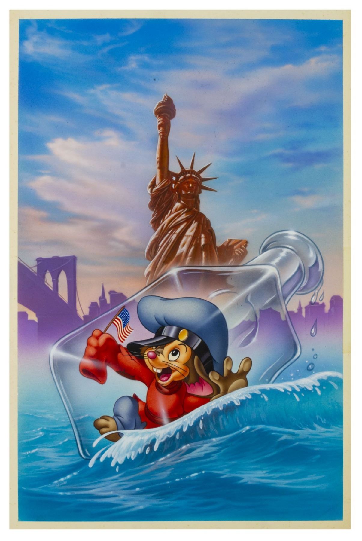 (Universal, 1986) An original painting created as a poster design for the animated feature film "An American Tail". This beautiful painting depicts Fievel in front of the Statue of Liberty. Accomplished in airbrush on art board, the painting measures 21"x14" and is in very good condition with minor wear from use, including some small spots of discoloration around the border. There is a protective sheet of paper hinged over the top of the artwork for its protection.