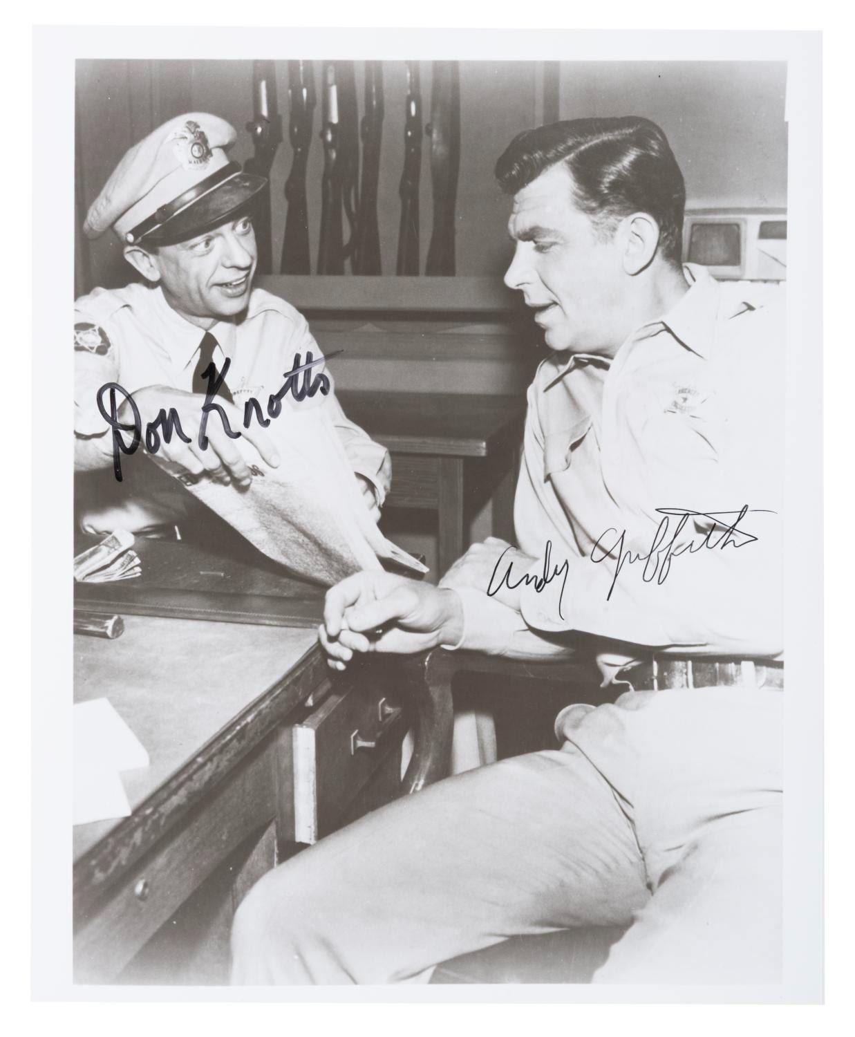 (Danny Thomas Enterprises, 1990s) A publicity photo from "The Andy Griffith Show " signed by the two stars, Andy Griffith (Andy Taylor) and Don Knotts (Barney Fife). Measuring 8 " x 10 ", the autographed photo is in fine condition.