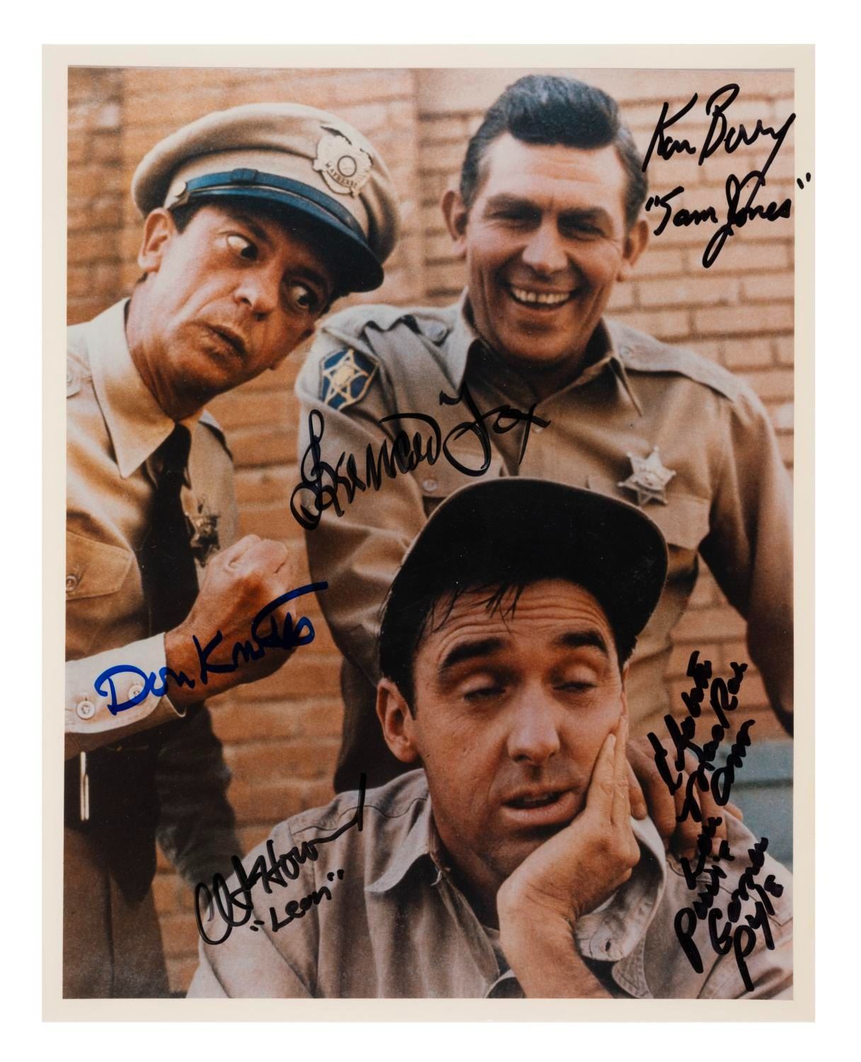(CBS, 1980s-90s) A “The Andy Griffith Show” color publicity photo of Don Knotts, Jim Nabors, and Andy Griffith, signed by five cast members. The autographs include Don Knotts (Barney Fife), Ken Berry (Sam Jones), Bernard Fox (Malcolm Merriweather), Clint Howard (Leon), and Elizabeth MacRae (Betty Parker). Measuring 8” x 10”, the signed photo is in very good condition with light scratches.