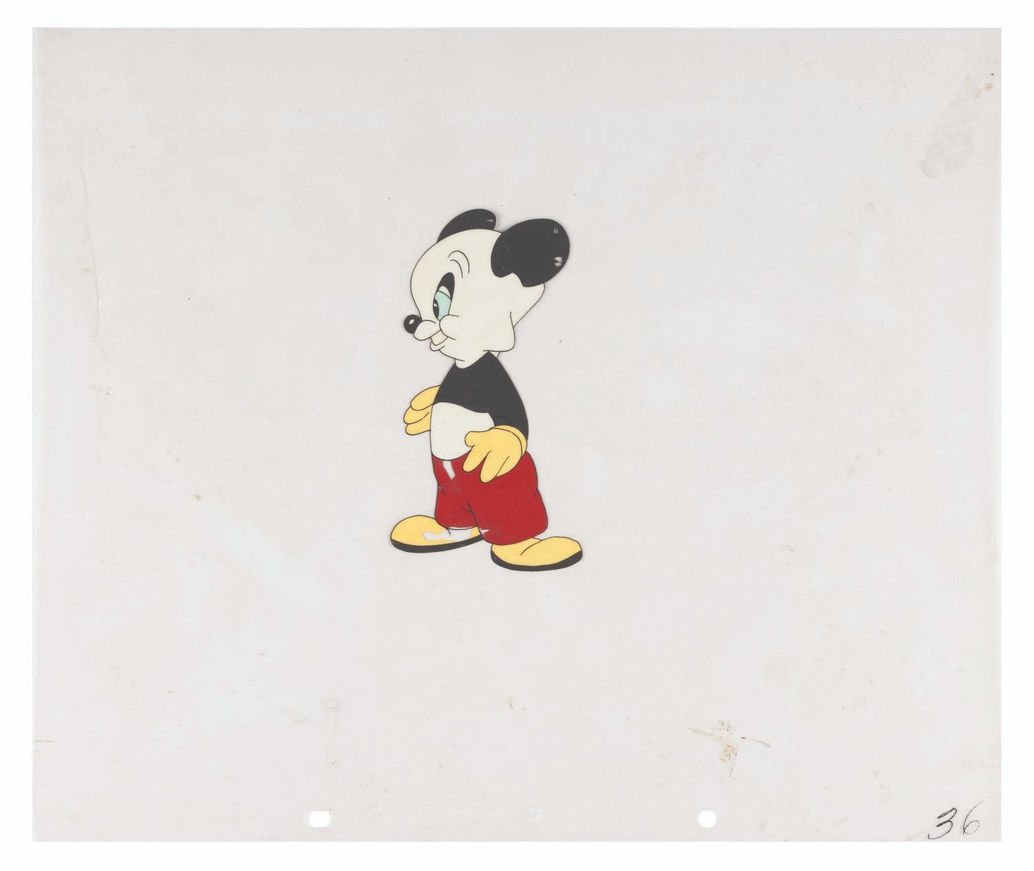 (Walter Lantz, 1946) An original production cel of Andy Panda from the 1946 short “The Wacky Weed,” directed by Donald Duck co-creator Dick Lundy. With a 2.5” x 4.75” character image size on a 9.75” x 12” cel, the piece displays in good condition despite paint chips, stains, creases, scratches throughout, and wear from age and handling.