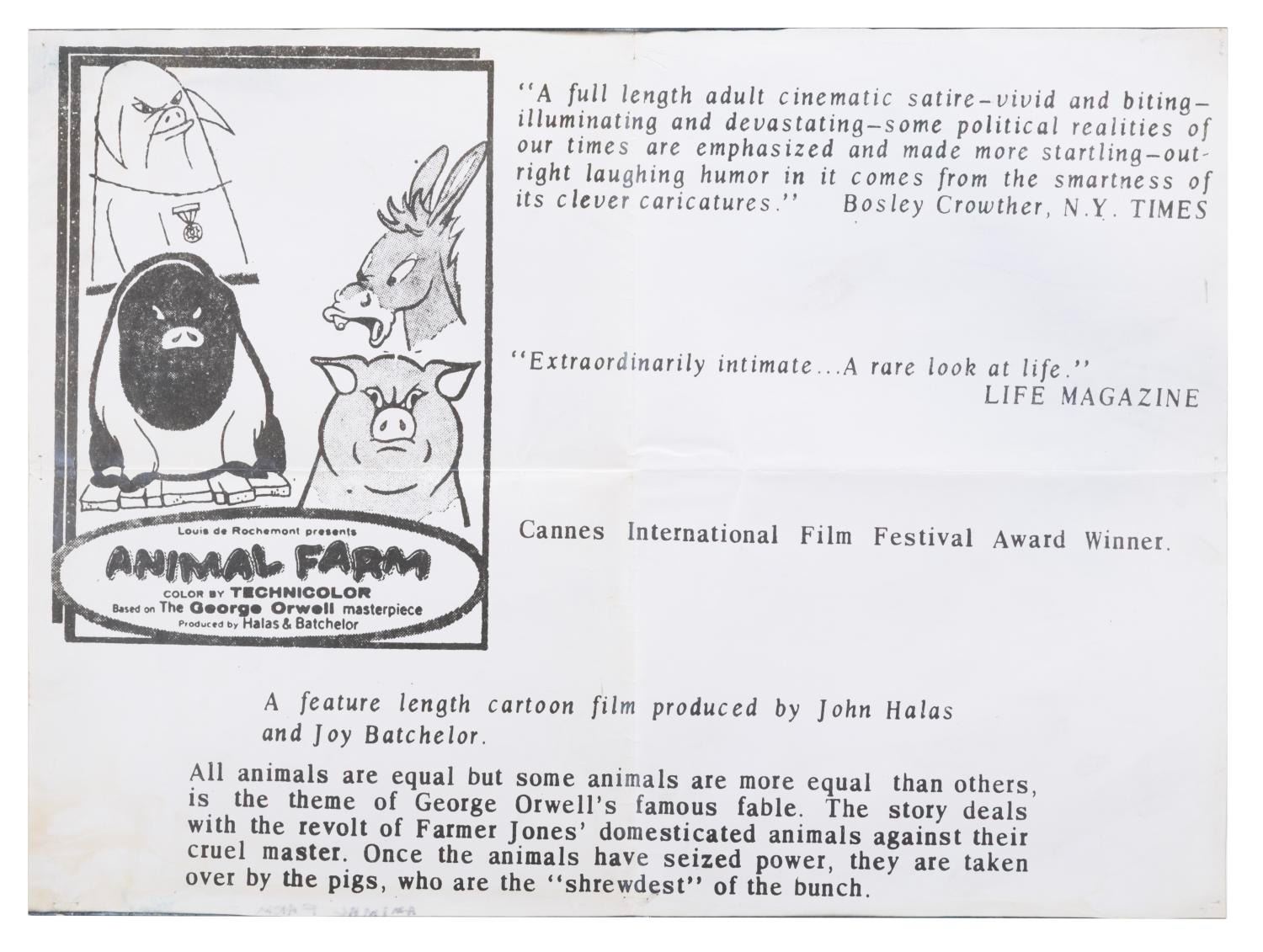 (British Pathe, 1954) A photostat poster with reviews and quotes about "Animal Farm, " printed to add below a poster in theaters. Measuring 18 " x 24.25 ", the poster is in good condition with original folds, staple holes at edges and corners, creases and wear, and ink showing through from the title written on the reverse of the bottom edge.