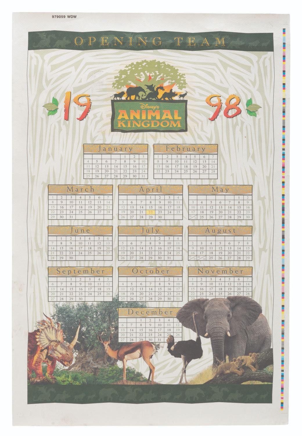 (Disney's Animal Kingdom, 1998) An uncut proof of a 1998 calendar poster gifted to the opening team of Disney's Animal Kingdom at Walt Disney World. With an image size of 22.75" x 34.25" and measuring 25.5" x 38" overall, the papyrus poster displays in good condition with stains, creases from storage, and handling wear.