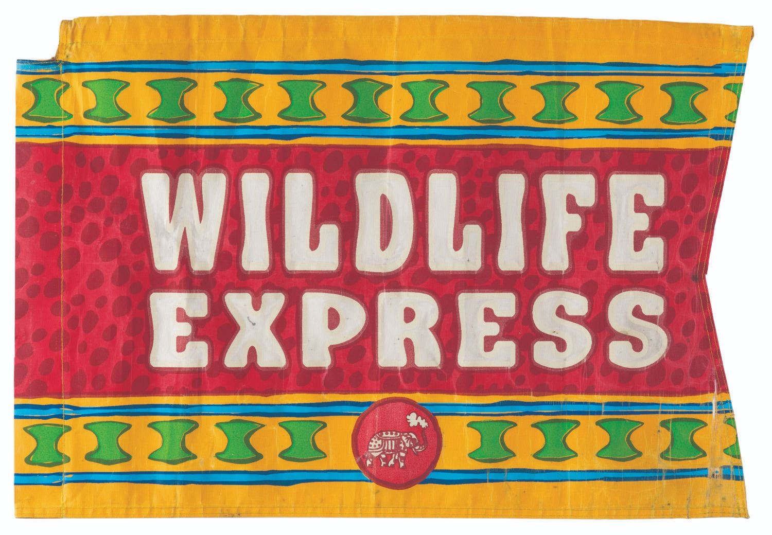(Disney's Animal Kingdom, 1998-2000s) A Wildlife Express Train flag, originally displayed near the front of the attraction's locomotive. Measuring 30.5" x 20.75" tall, the one-sided flag displays in good condition with discoloration, stains, tears up to 6" long, and wear from Park use.