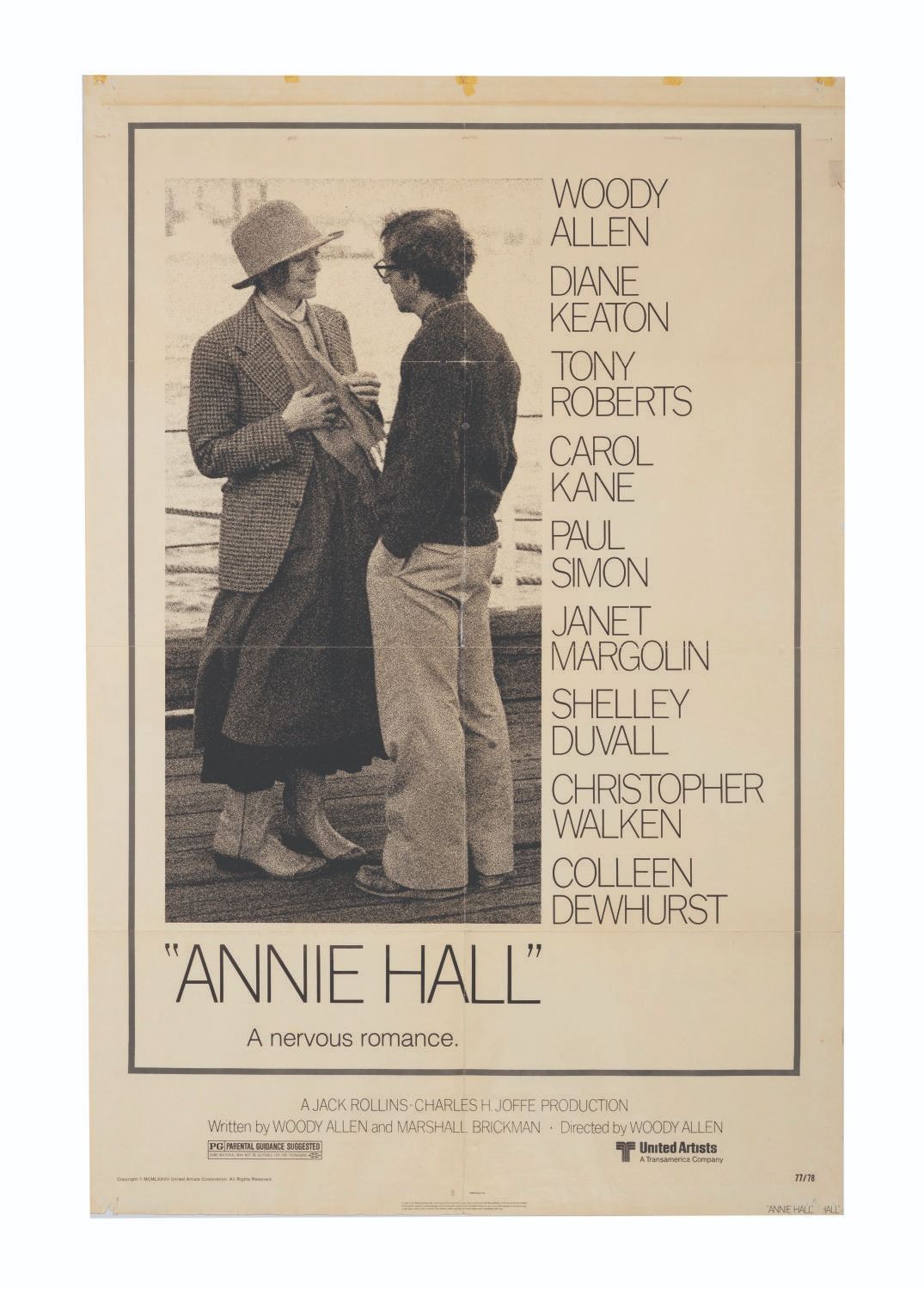 (United Artists, 1977) A One-Sheet for Woody Allen's Annie Hall, winner of the 1977 Academy Awards for Best Picture, Best Original Screenplay, Best Director, and Best Actress Diane Keaton. Measuring 27"x41, the poster is in fair condition, with multiple pinholes at the corners, tape marks, a large crease at the top, and some splitting and wear along fold lines and edges.