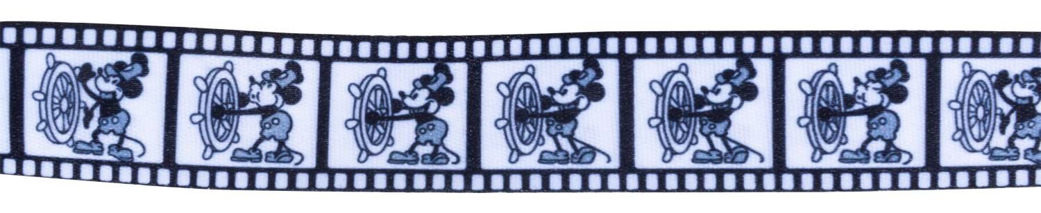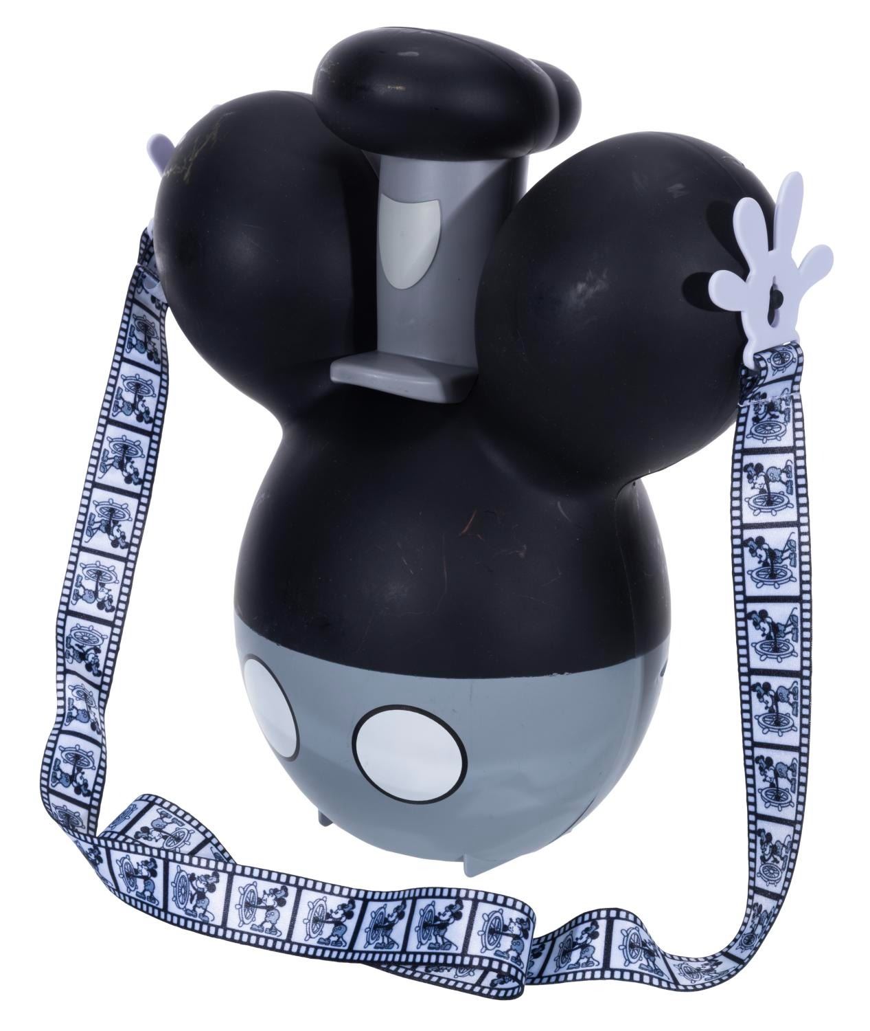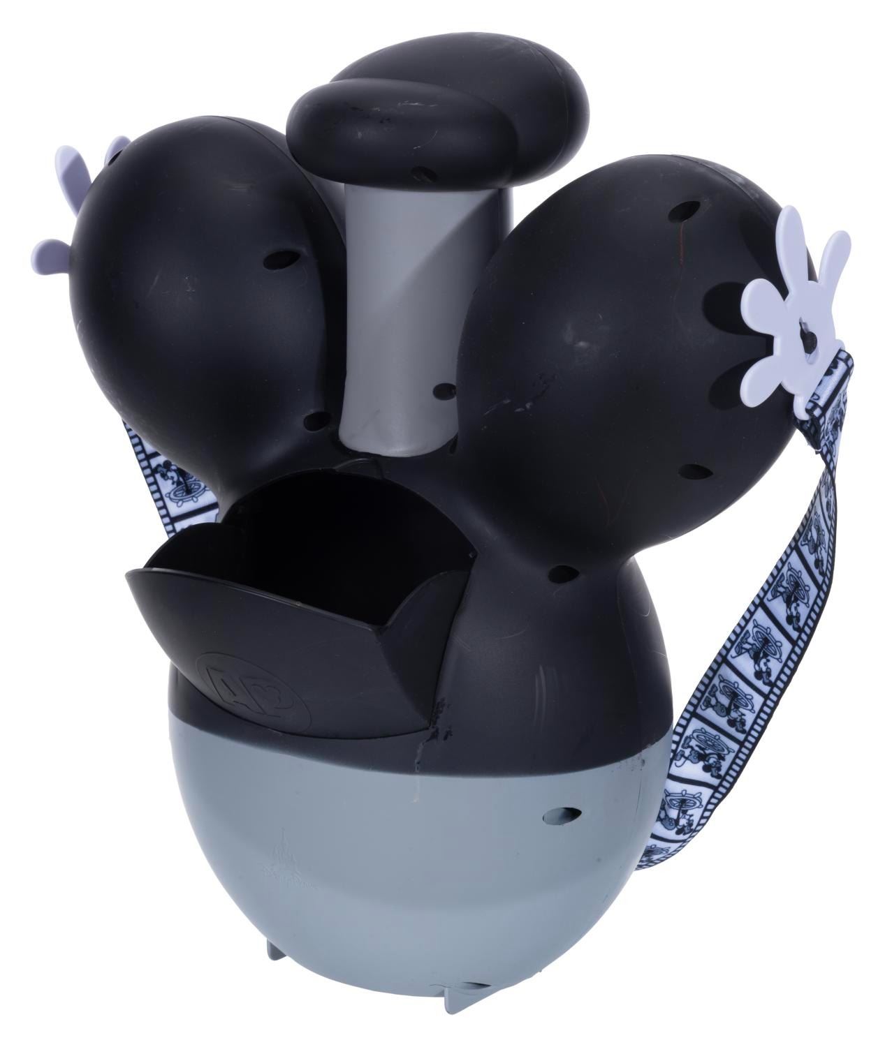 (Disneyland, Walt Disney World, 2019) An annual passholder exclusive Steamboat Willie popcorn bucket with a filmstrip-style strap. Measuring 10.5" x 5.5" x 11.5", the bucket displays in fair condition with soiling and heavy scuffs throughout.