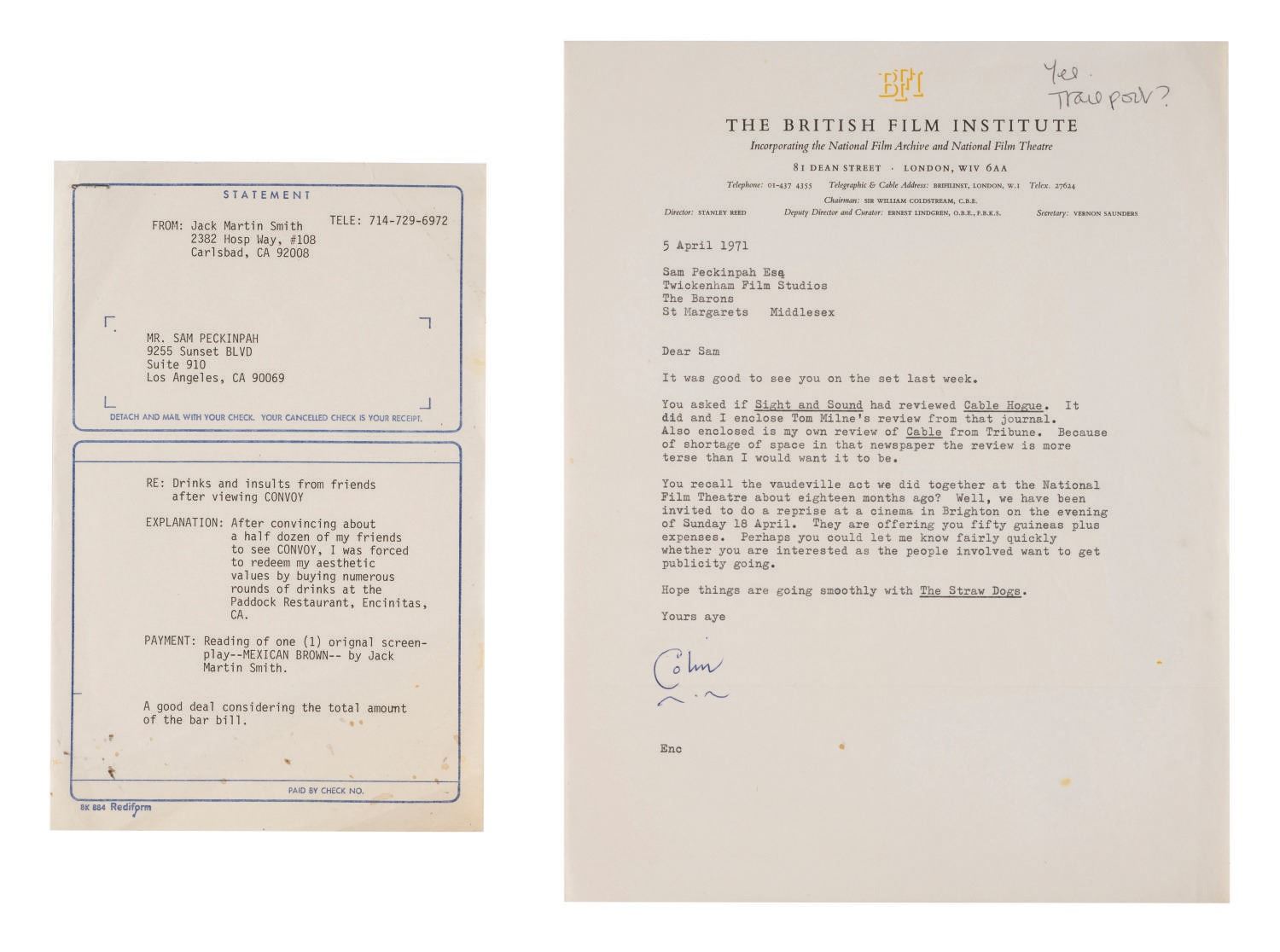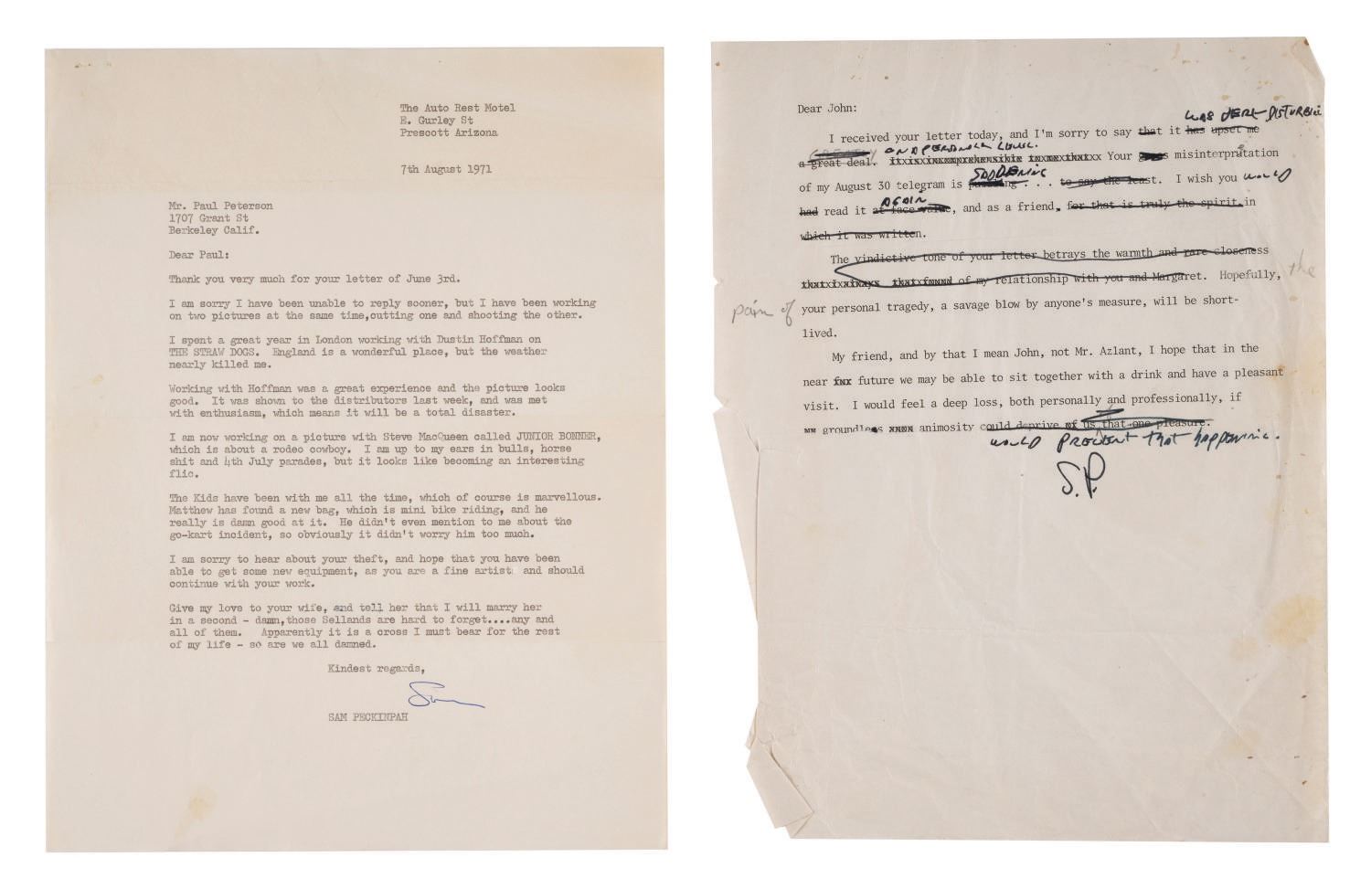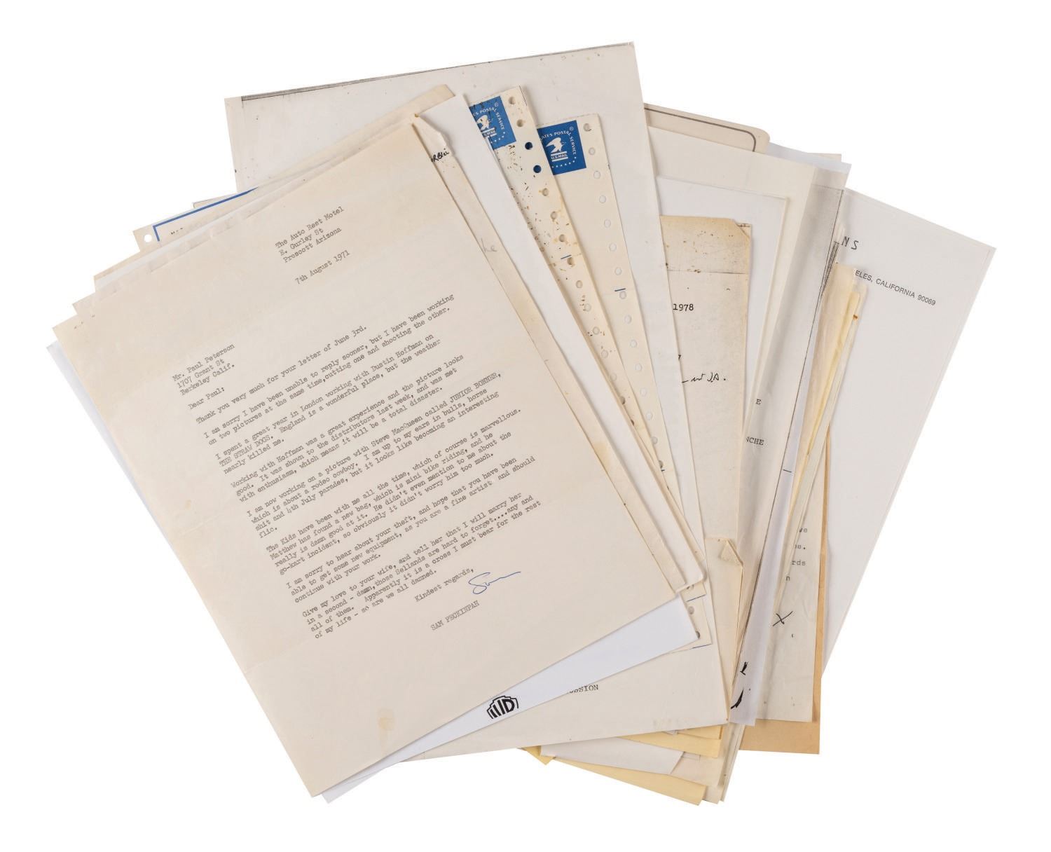 (Peckinpah, 1970s) A collection of (51) letters and communications between Sam Peckinpah and his personal assistant Paul Peterson, Swedish composer Sture Dahlstrom, and others. The lot includes many letters regarding reactions to "Convoy" and possible film projects. Of note is an original letter authorizing Paul Peterson to "conduct research for an original story and screenplay about cocaine and the illegal trafficking of cocaine." Measuring 8.5"x11" and under, the unique collection of ephemera is in very good condition, exhibiting mild creases and slight wear from use.