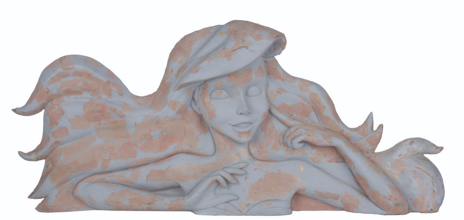 (Disney, 1990s-2000s) An Ariel from "The Little Mermaid" prototype casting for an unknown attraction sign or display. The fiberglass and plaster piece is unfinished, giving a peek into the process of creating signage for Disney attractions. Measuring 16" x 34", the piece is in good, mid-production condition.