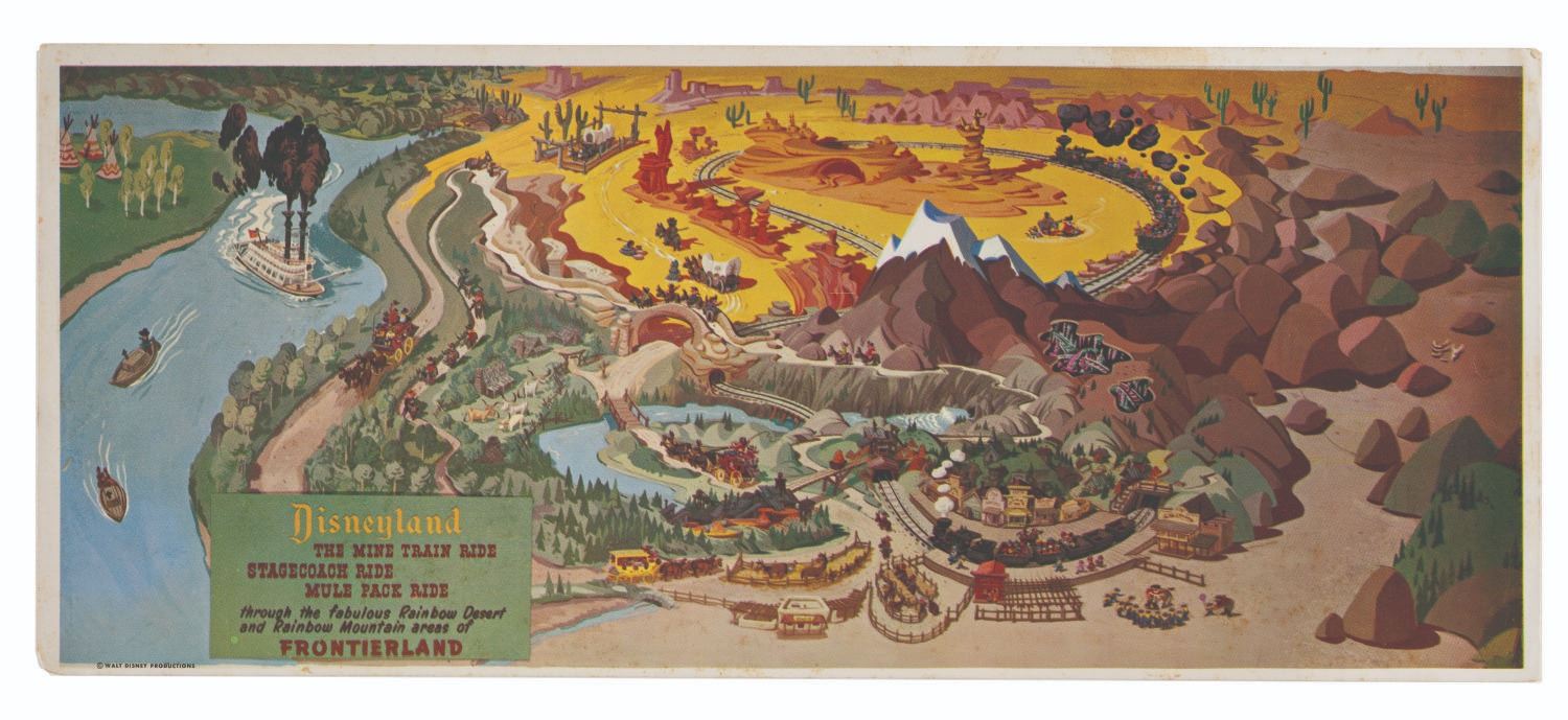 (Disneyland, 1956) A Disneyrama postcard featuring an artist's concept of the Frontierland expansion of 1956. The artwork was distributed exclusively through the Art Corner at Disneyland and depicts the Rainbow Desert, Rainbow Mountain, and Tom Sawyer Island areas, explorable by the Mine Train Ride, Mule Pack Rides, and Stagecoaches. Measuring 11.25"x4.75", this postcard is in good condition with a few creases, minor spots of yellowing and discoloration.