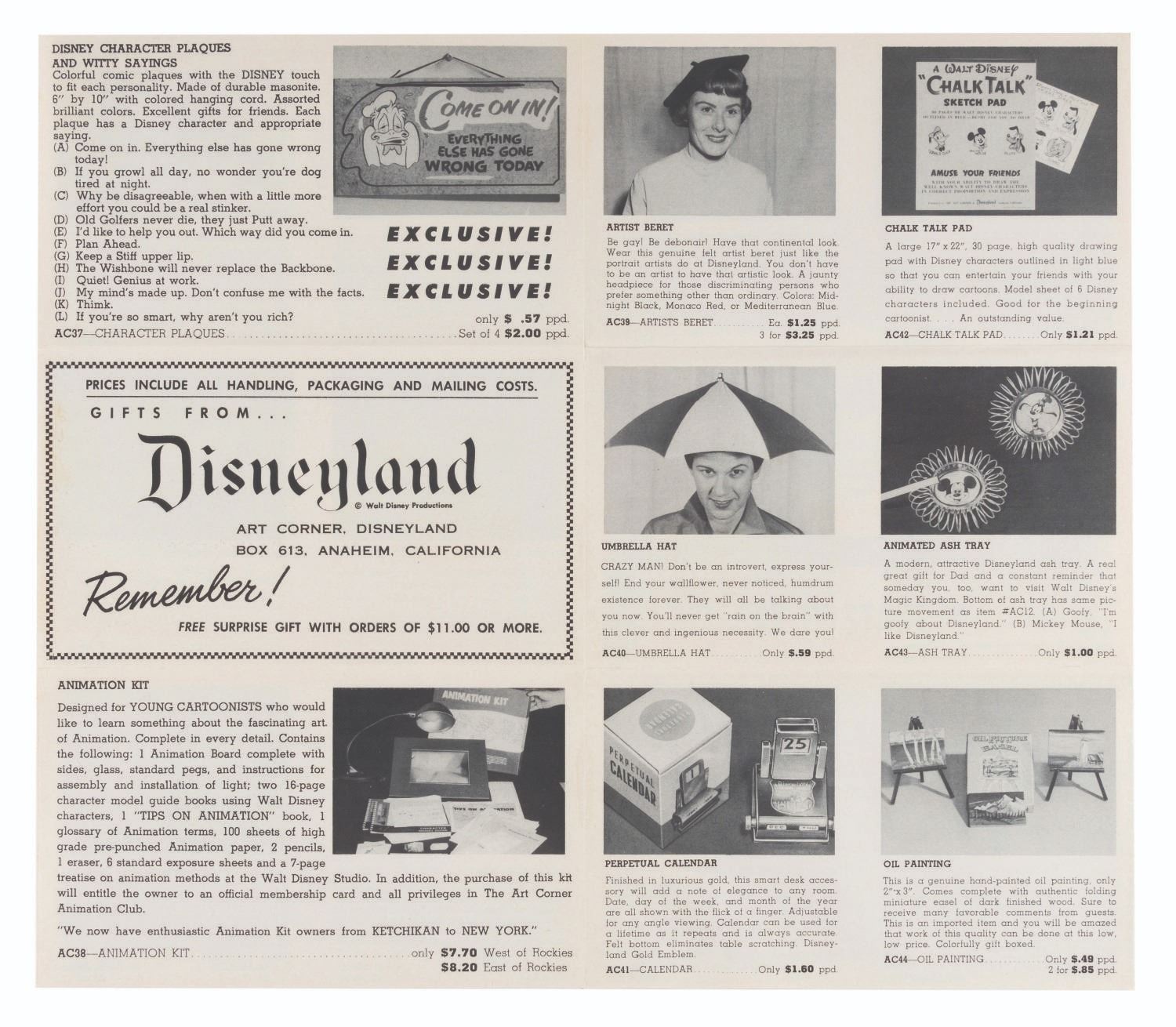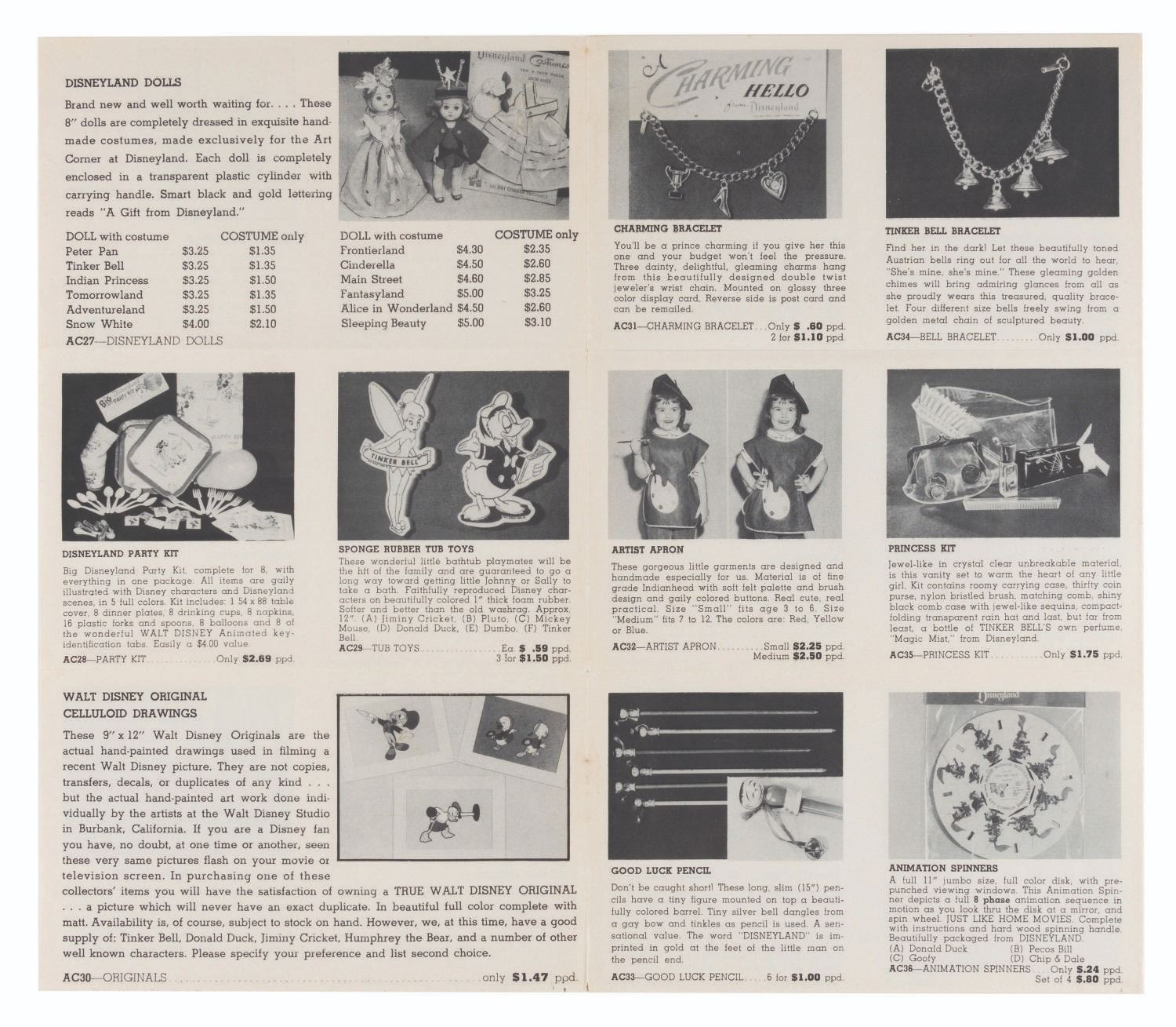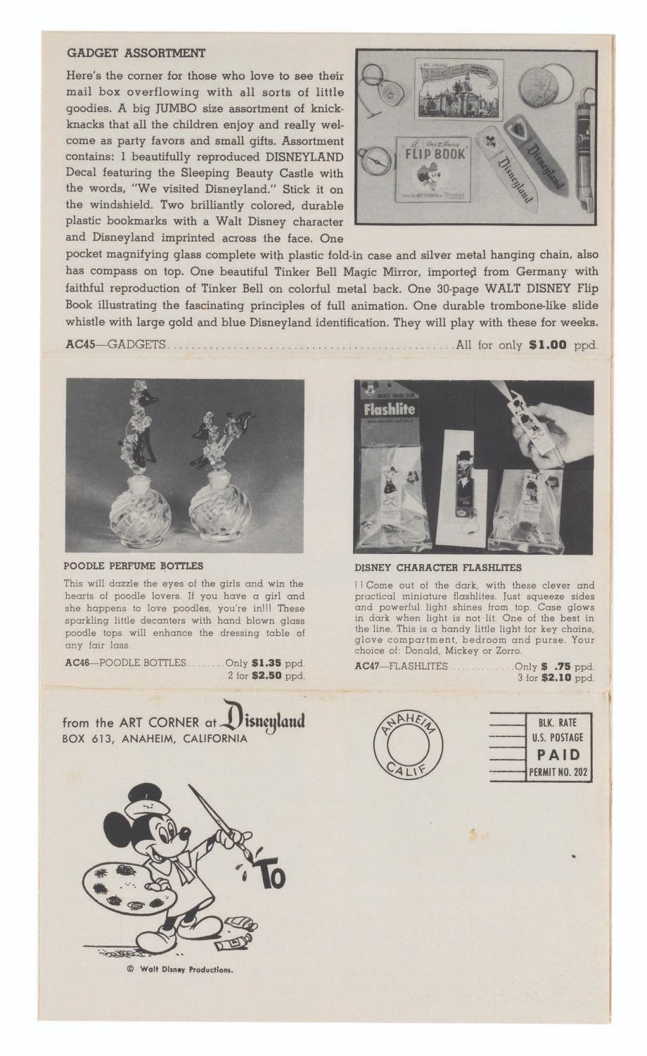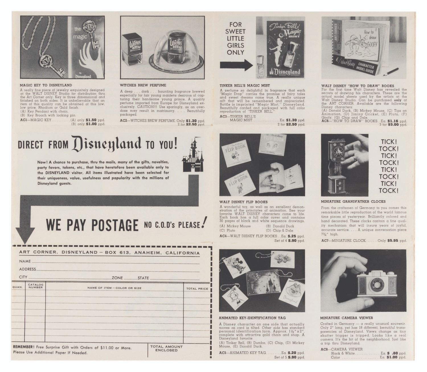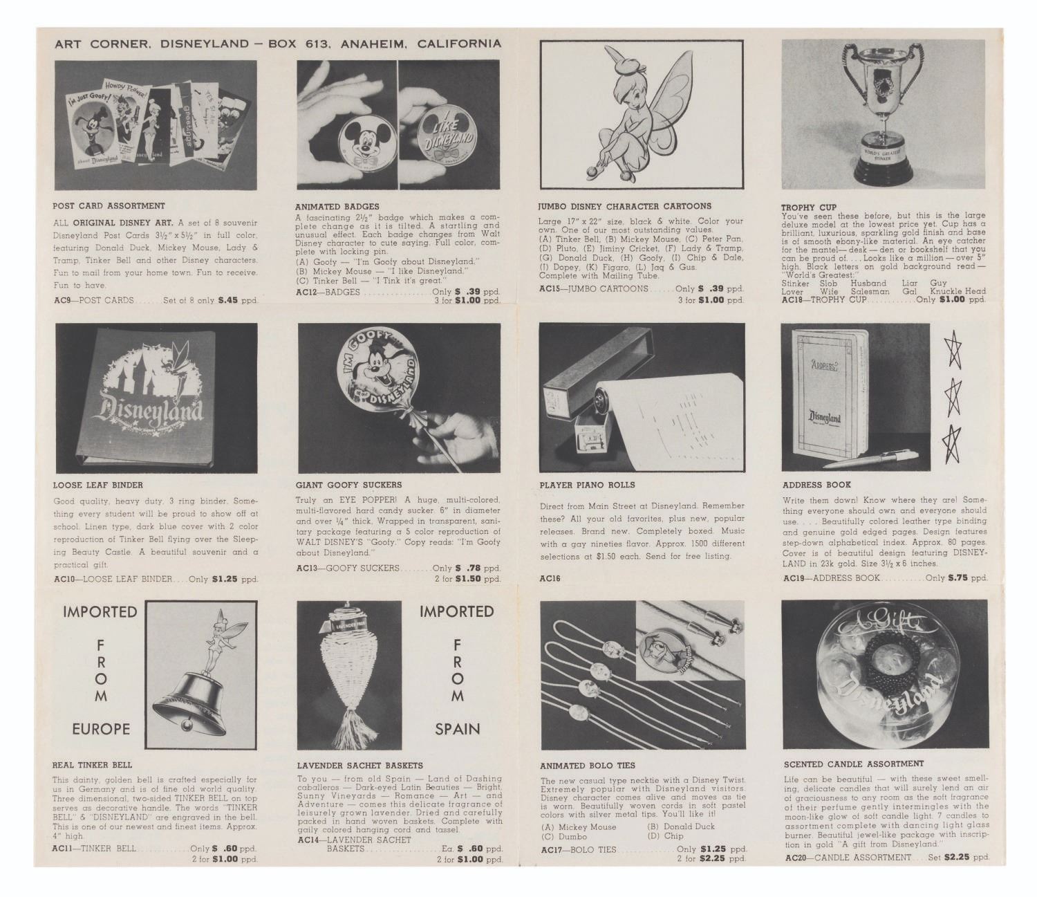 (Disneyland, 1950s) A rare mail-order catalog from the Disneyland Art Corner with photos and descriptions of items sold during the earliest years of operation. A small advertisement for full-color Disneyland souvenir maps is also included. Measuring 11.25" x 32.25" when unfolded and 3.75" x 6.5" folded, the double-sided brochure is in very good condition with minor edge-wear and some splitting along the fold lines.