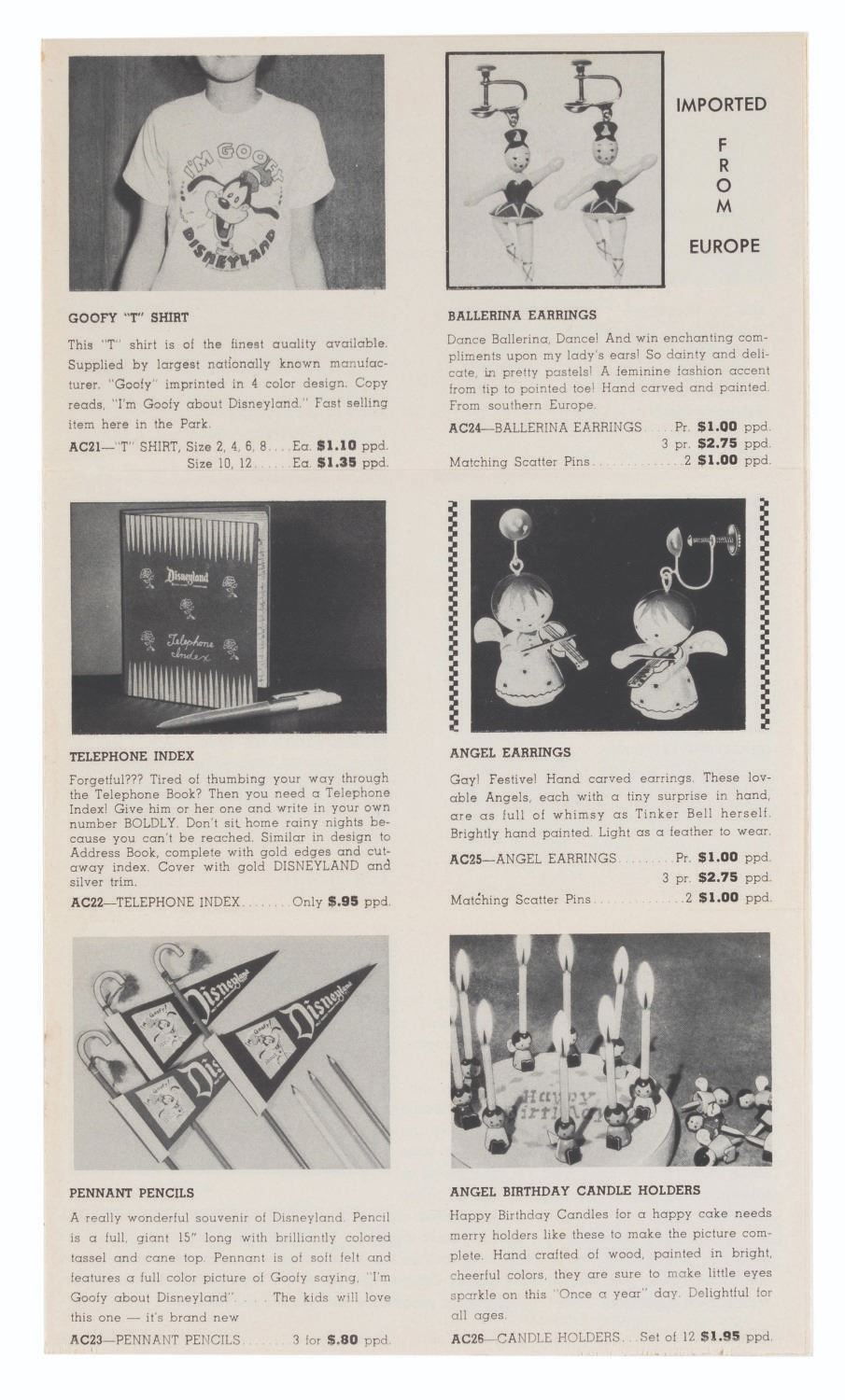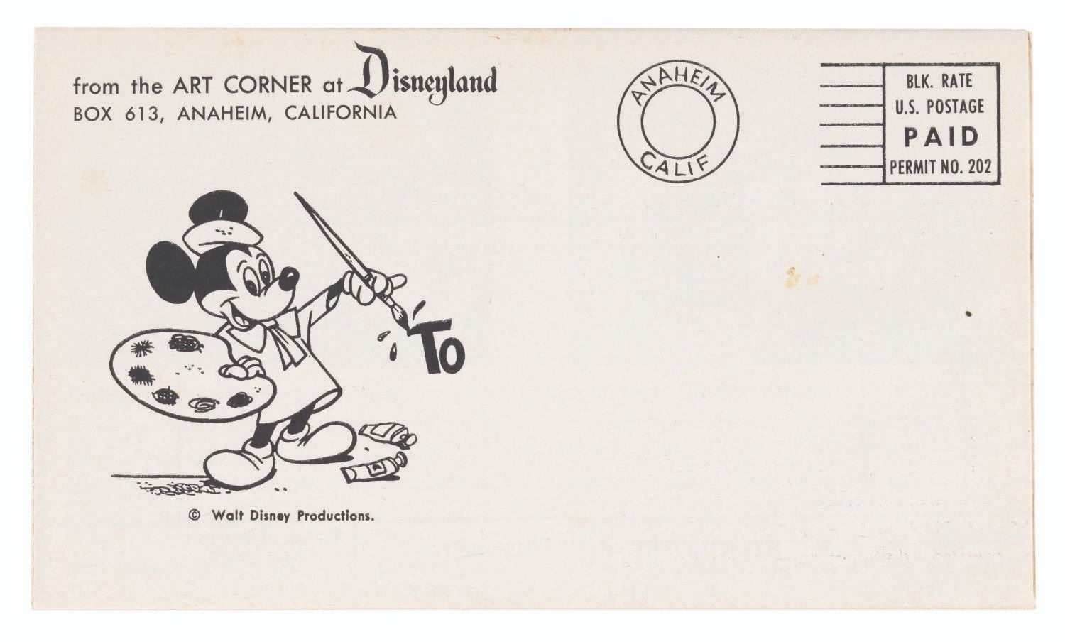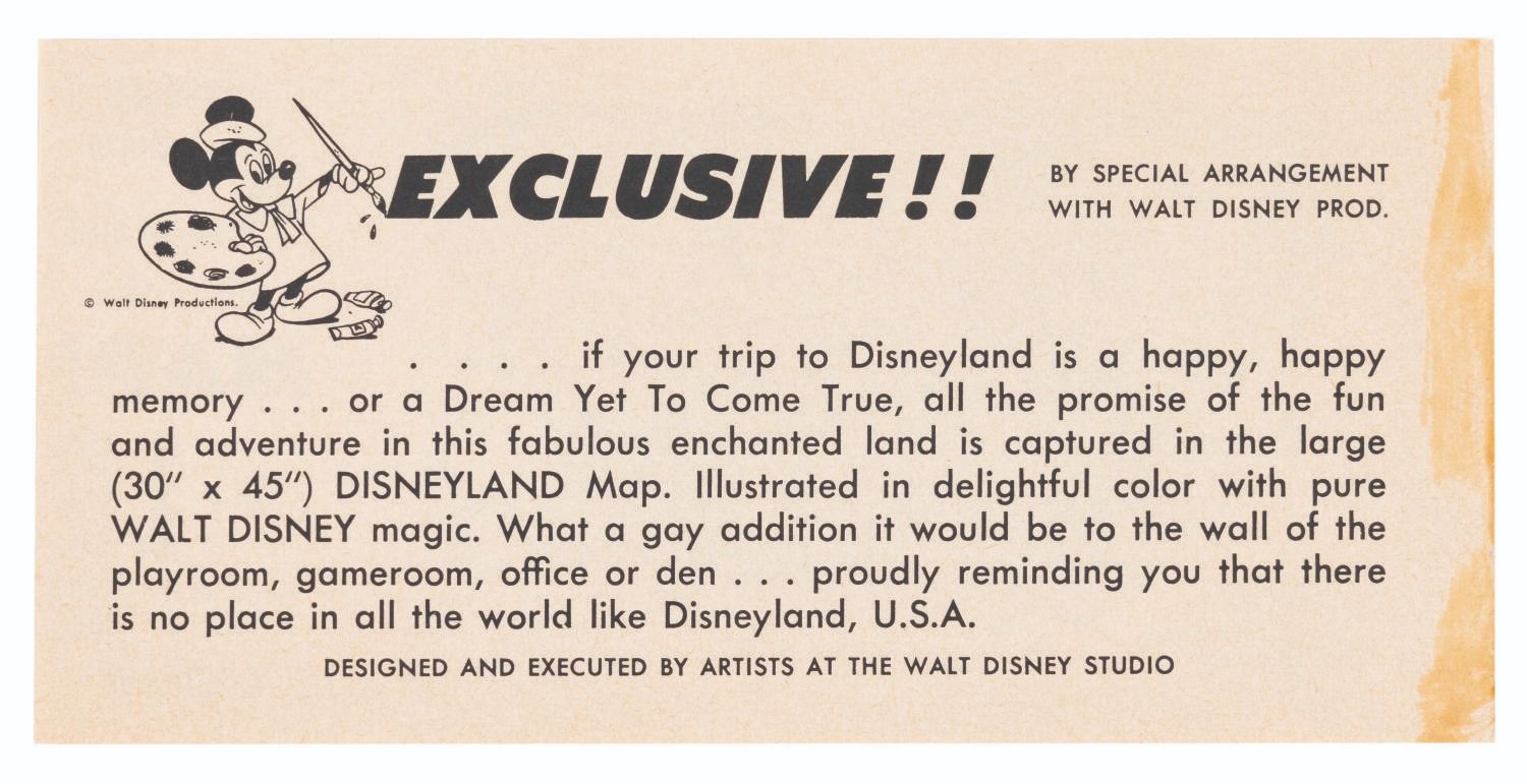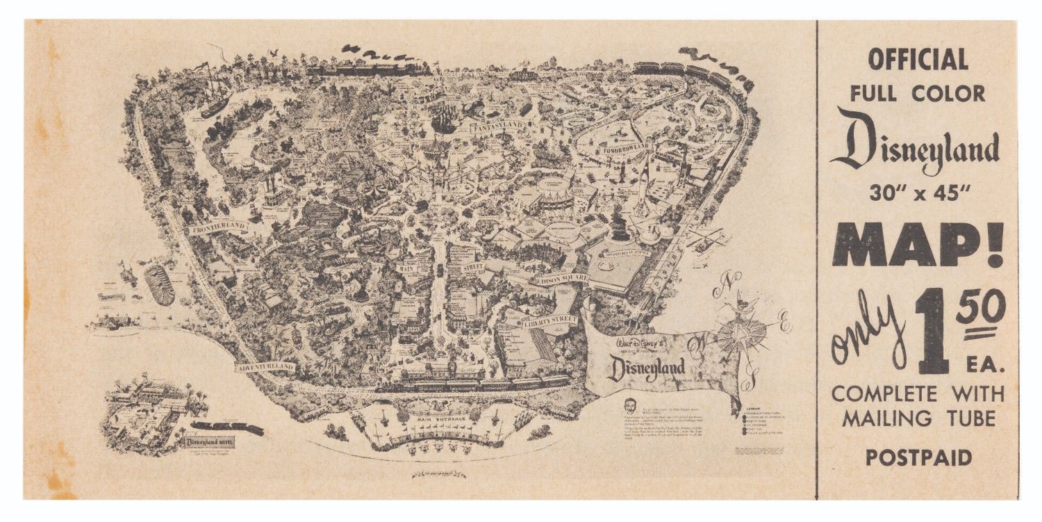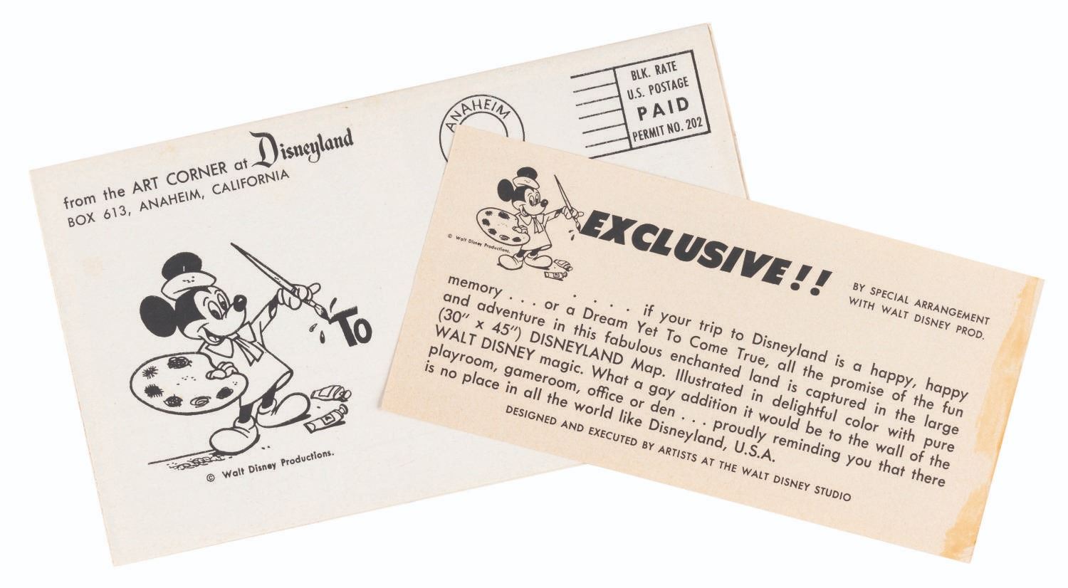 (Disneyland, 1950s) A rare mail-order catalog from the Disneyland Art Corner with photos and descriptions of items sold during the earliest years of operation. A small advertisement for full-color Disneyland souvenir maps is also included. Measuring 11.25" x 32.25" when unfolded and 3.75" x 6.5" folded, the double-sided brochure is in very good condition with minor edge-wear and some splitting along the fold lines.