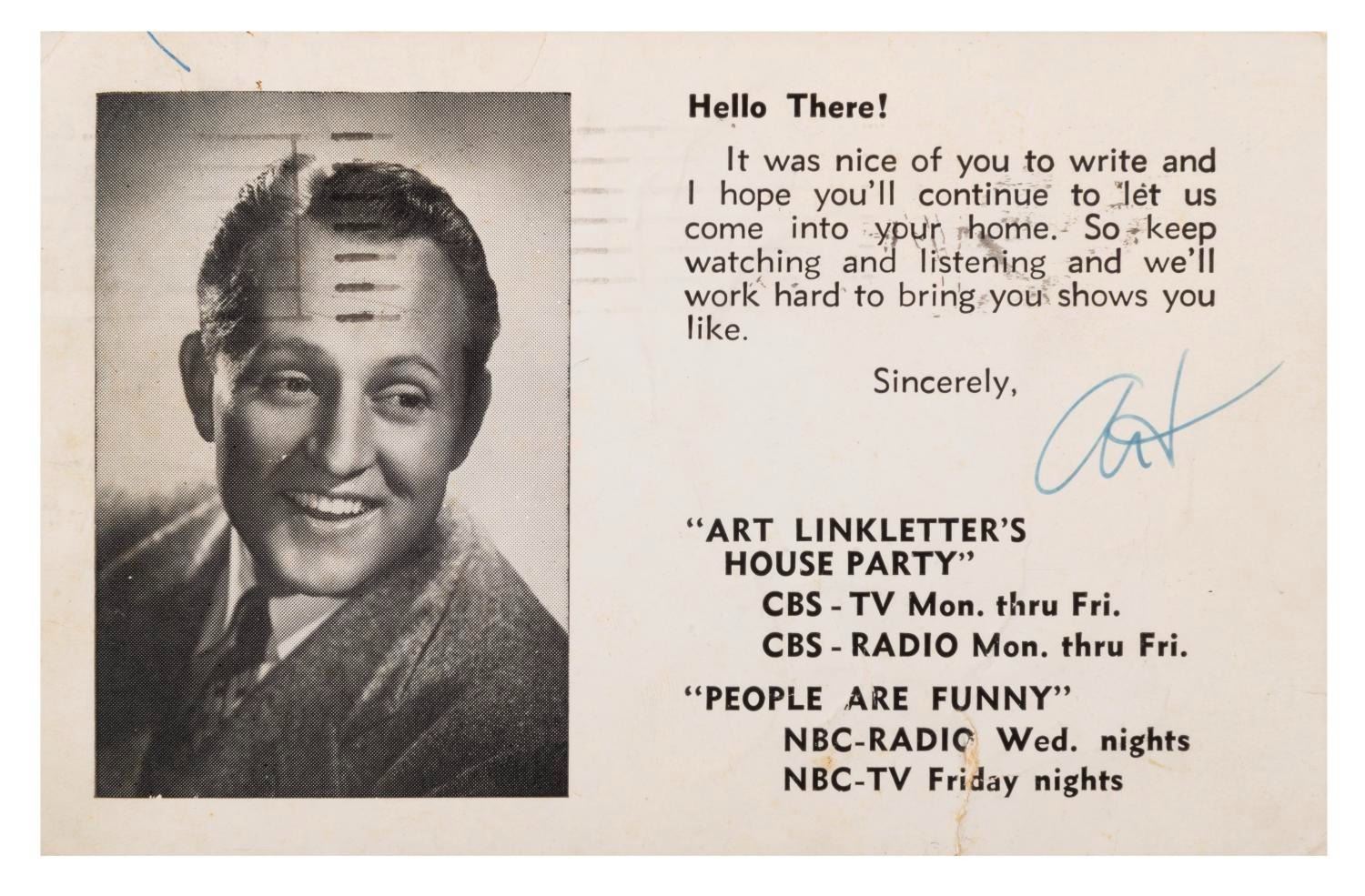 (Linkletter, 1959) A postcard signed by television host Art Linkletter. The card was sent with a simple "Art" signature in 1959 when his "House Party" and "People Are Funny" shows were airing on both TV and radio, and four years after he hosted the opening day telecast from Disneyland. Measuring 3.5" x 5.5", the card is in fair condition with much wear from mailing, including smudges, cancellation marks, and a 0.5" tear in the bottom edge.