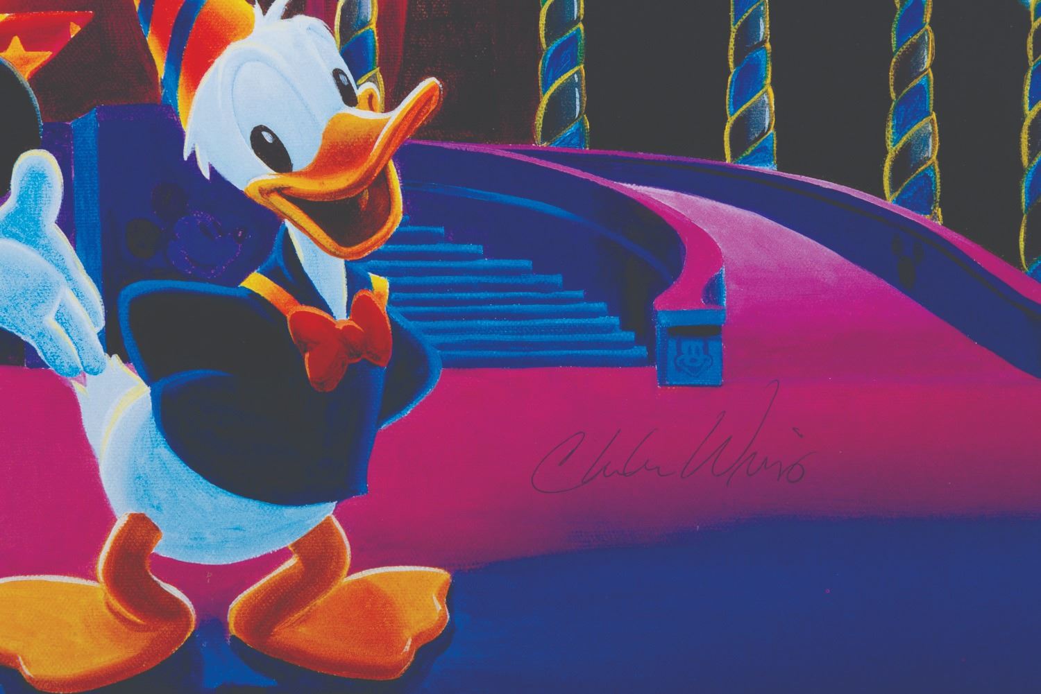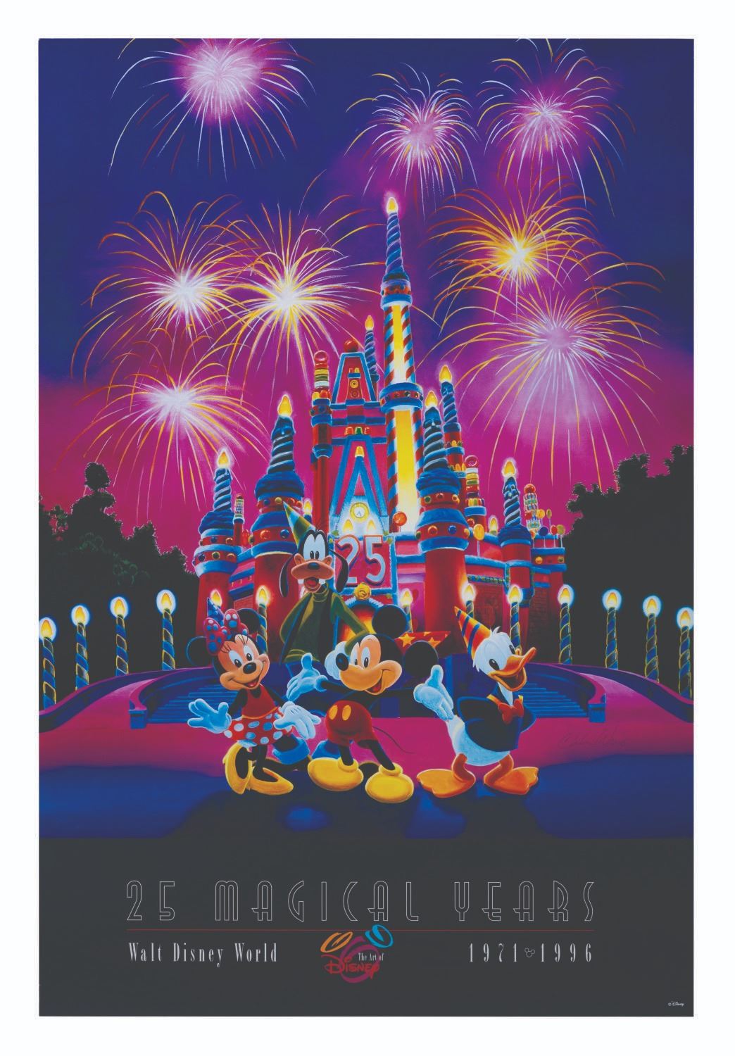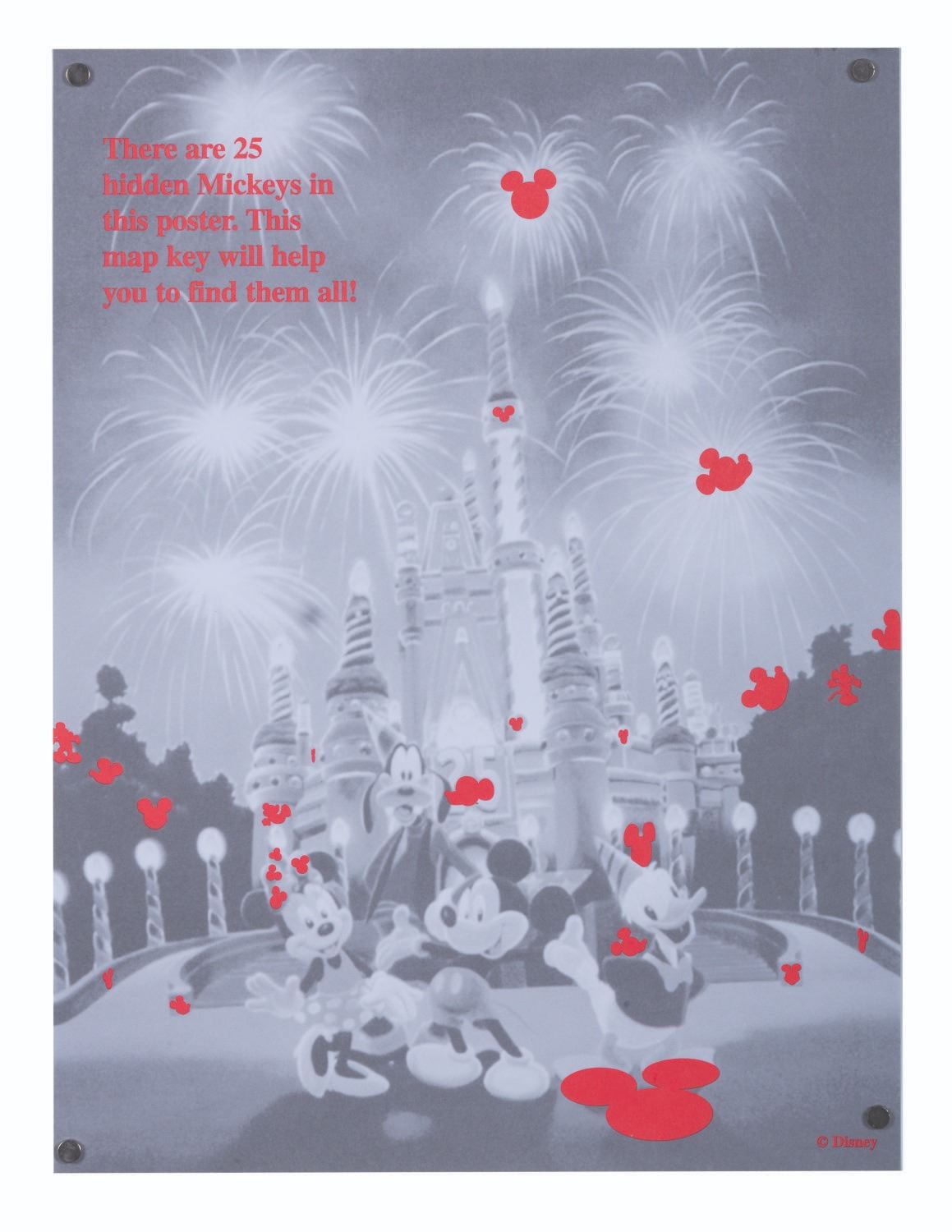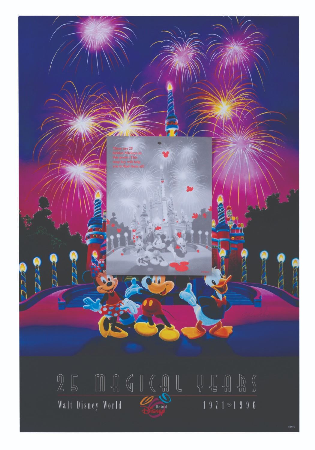 (Walt Disney World, 1996) A Walt Disney World Art of Disney 25th anniversary poster featuring 25 Hidden Mickeys and a key to help find them. This poster is signed by artist Charles Wissig. Measuring 24" x 36", the poster is in good condition with light wear from handling.
