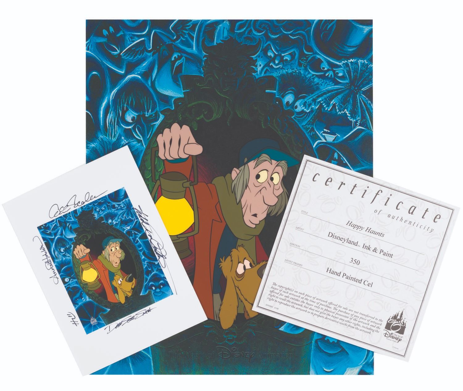 (Disneyland, 2019) A "Happy Haunts" hand-painted cel by Disneyland Ink & Paint, released in a limited edition of 350. The lot also includes the certificate of authenticity, a 5" x 7" postcard signed by four Disney artists, its original The Art of Disney 11.25" x 18" box, and a 10.5" x 13" printed image featuring imagery from The Haunted Mansion attraction. With an image size of 5.75" x 7.5" on a 10.5" x 13" cel , the art is in fine condition, while the printed image exhibits light wear.