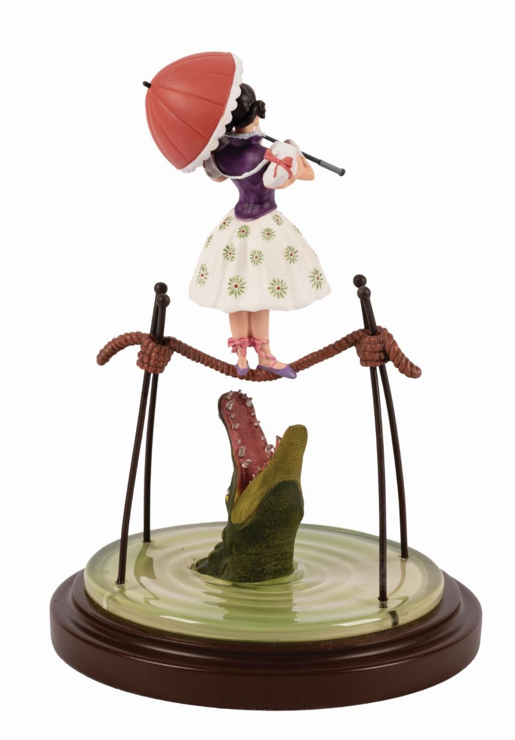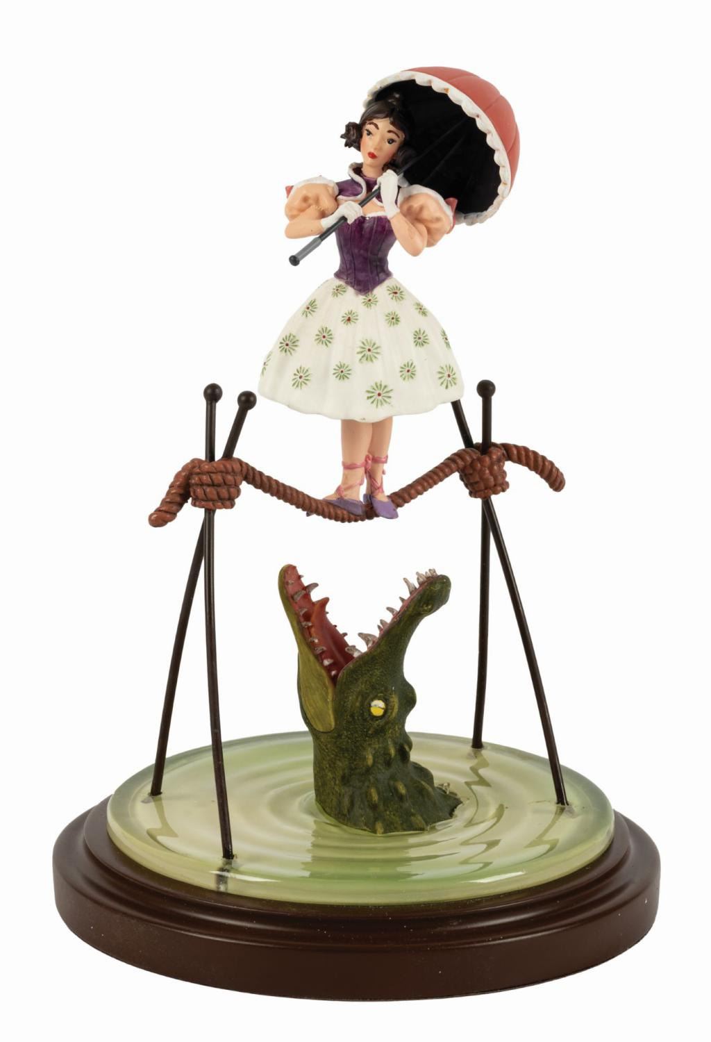 (Disneyland, 2019) A Haunted Mansion stretch painting figure by The Art of Disney. Sally Slater has been immortalized in a corruptible dimensional form as "Stretch Painting No.1" by the Disney Design Group to commemorate the 50th anniversary of The Haunted Mansion at Disneyland. Measuring under 10" with a 7" base, the resin and metal sculpture of Sally Slater and an alligator displays in very fine condition, exhibiting little apparent wear and comes complete inside original box.