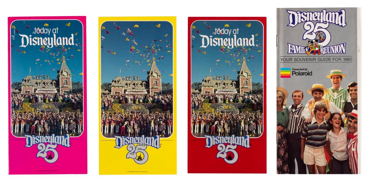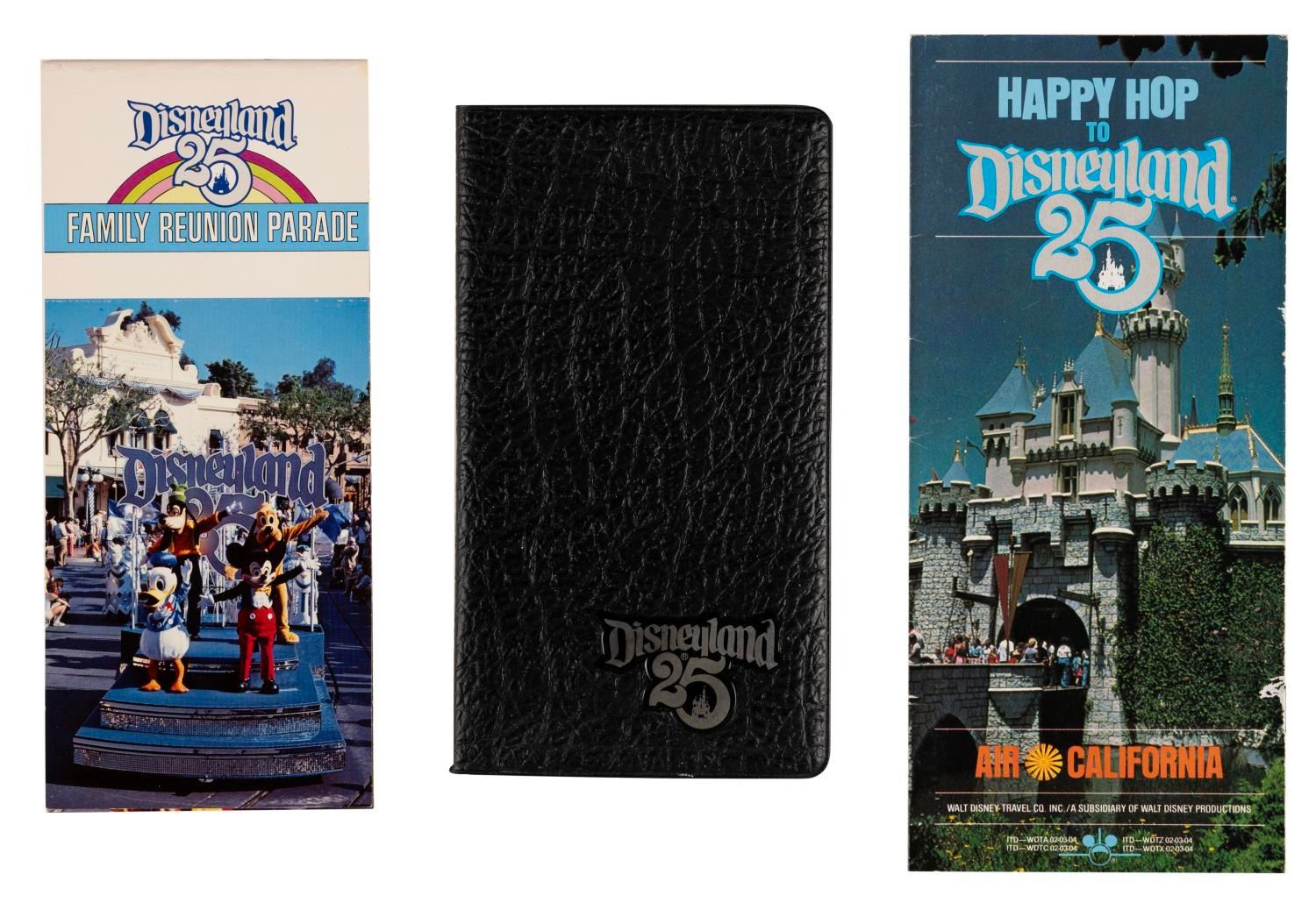 (Disneyland, 1980) An Assortment of souvenirs from the 25th Anniversary of Disneyland. Included in this collection are a bumper sticker, medallion, souvener guide, flyers, pocket calendar, an invitation to the park, parade postcards, a child's t-shirt and two Vacationland magazines. All are in very good condition with minor wear.