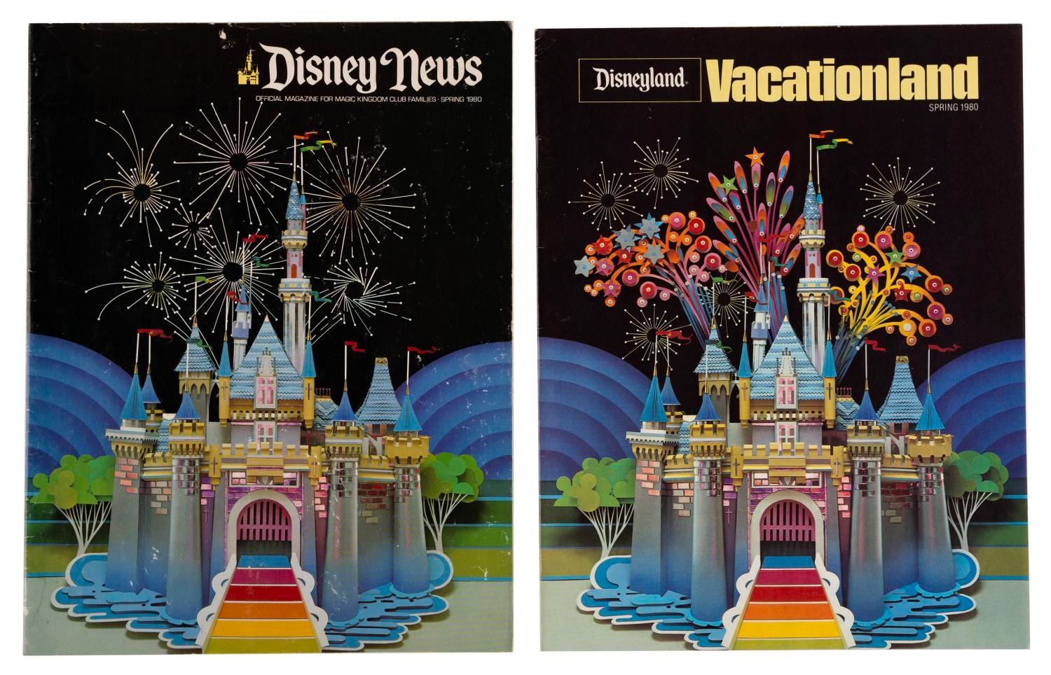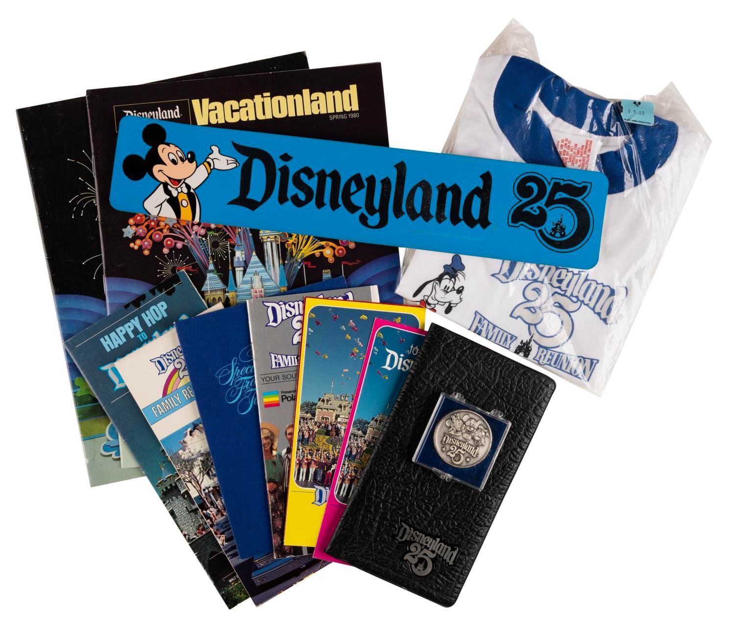 (Disneyland, 1980) An Assortment of souvenirs from the 25th Anniversary of Disneyland. Included in this collection are a bumper sticker, medallion, souvenir guide, flyers, pocket calendar, an invitation to the park, parade postcards, a child's t-shirt, and two Vacationland magazines. All are in very good condition with minor wear.