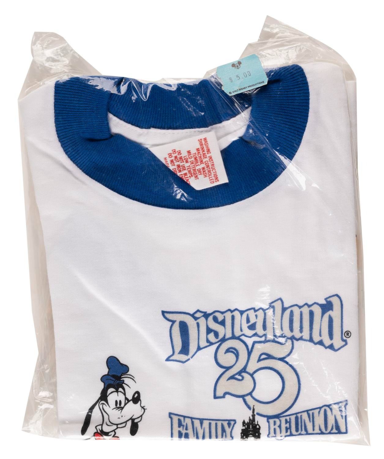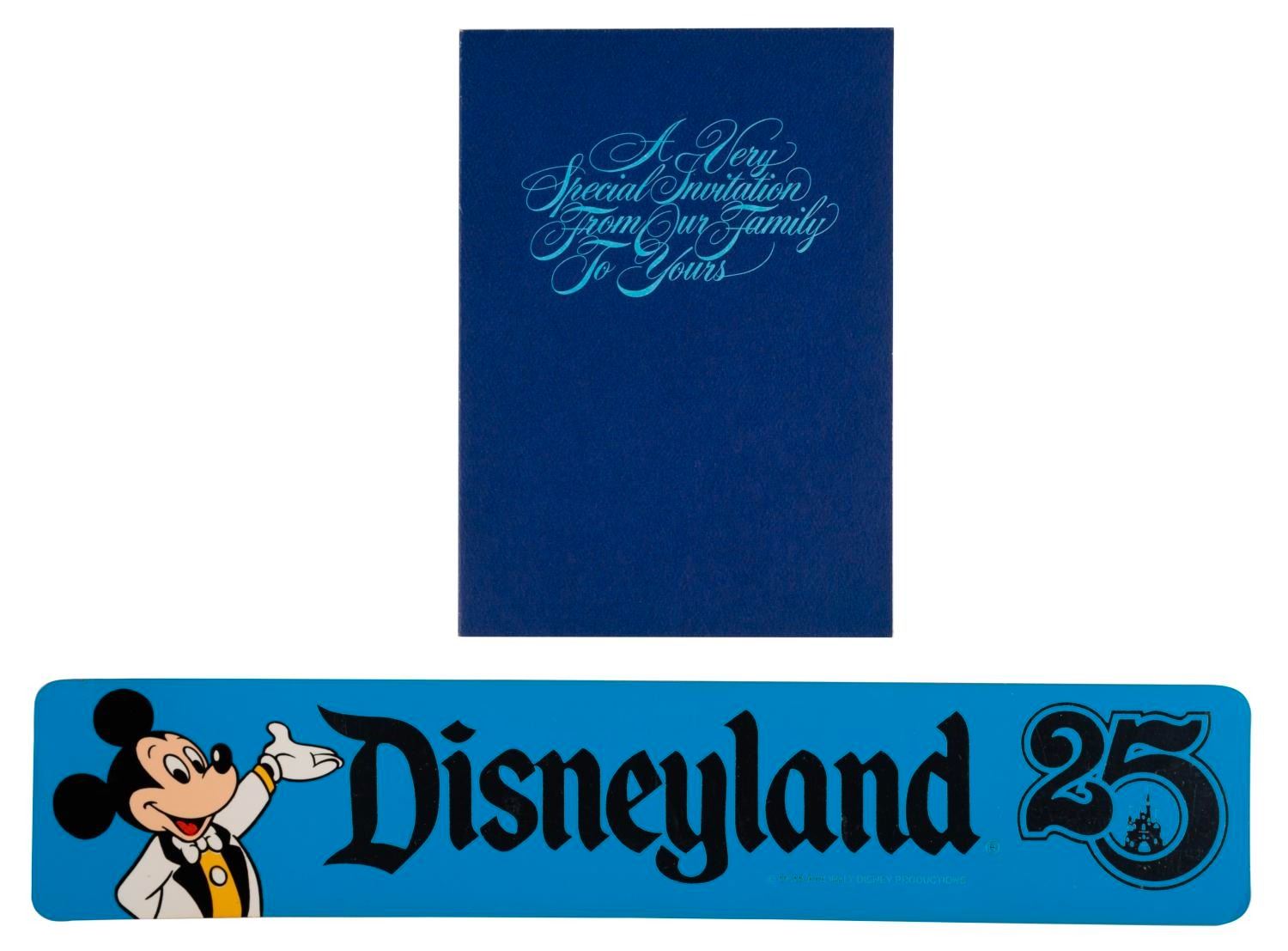 (Disneyland, 1980) An Assortment of souvenirs from the 25th Anniversary of Disneyland. Included in this collection are a bumper sticker, medallion, souvenir guide, flyers, pocket calendar, an invitation to the Park, parade postcards, a child's t-shirt, and two Vacationland magazines. All are in very good condition with minor wear.