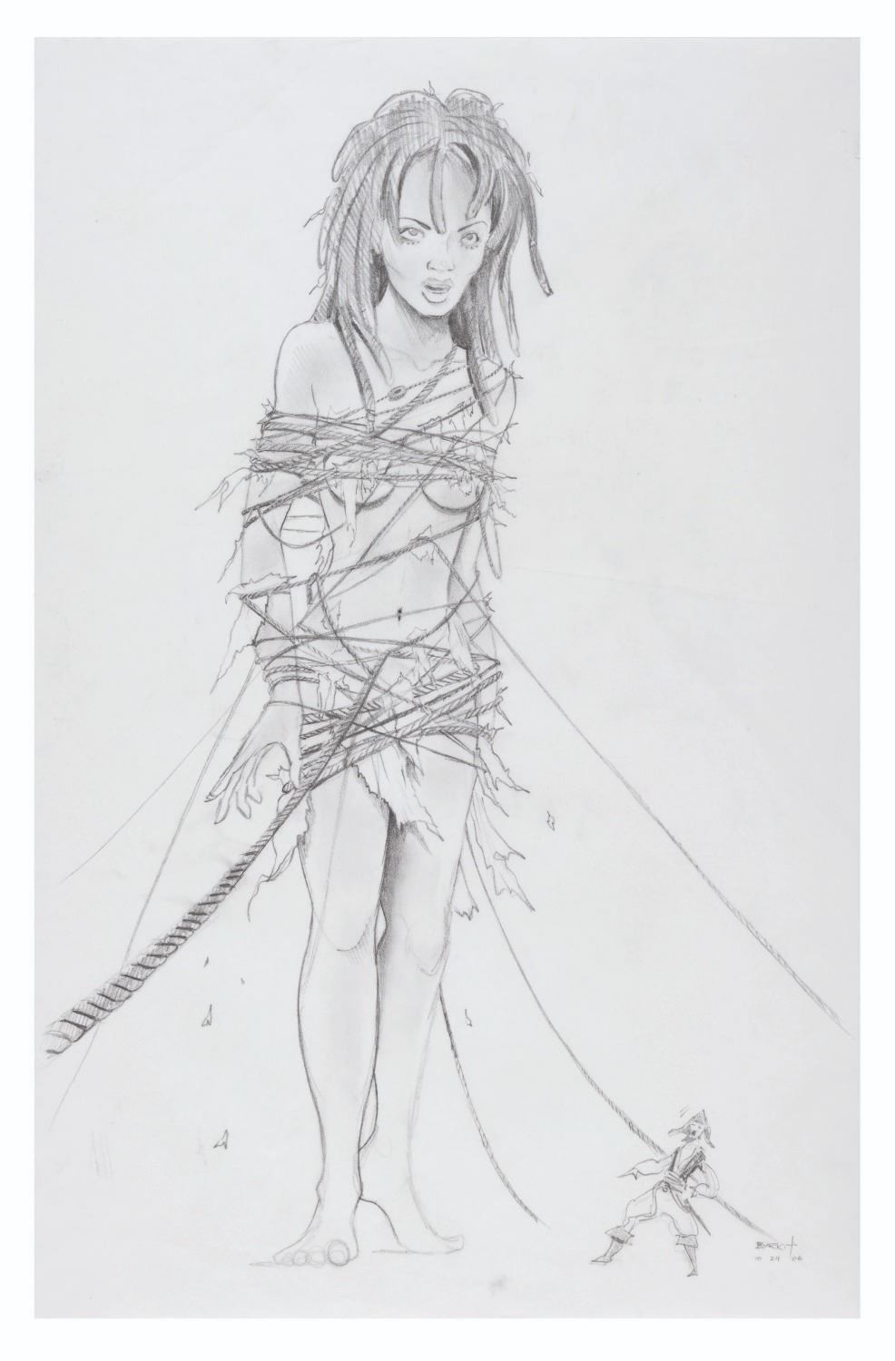 (Disney, 2006) A concept drawing of Calypso from “At World’s End.” Accomplished in graphite by conceptual artist James Byrkit, the piece depicts Tia Dalma, transformed into her gigantic goddess Calypso form, tied up and looming over a helpless pirate. With an image size of 11” x 15.5” on 11” x 17” vellum paper, the art displays in very good condition with creases.