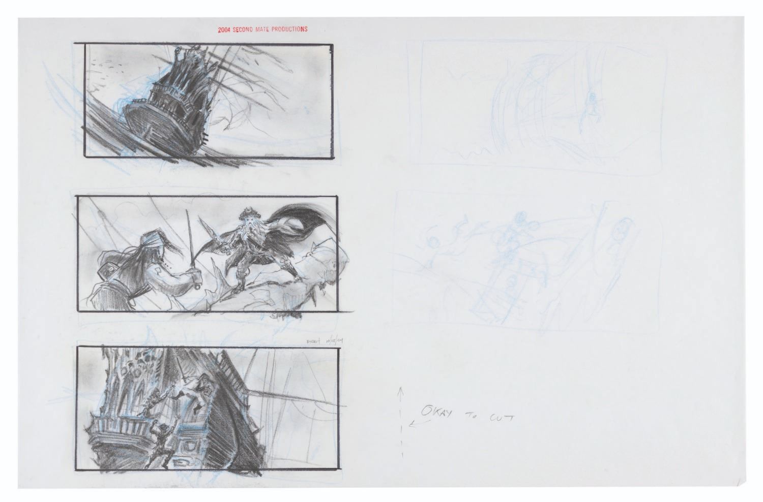 (Disney, 2005) A storyboard drawing of Captain Jack Sparrow and Davy Jones from the battle aboard the Flying Dutchman in “At World’s End” by conceptual artist James Byrkit. The middle panel can be seen published on page 151 of The Art of Pirates of the Caribbean from Disney Editions. Accomplished in graphite on velum and measuring 11” x 17”, the drawing is in fine condition.