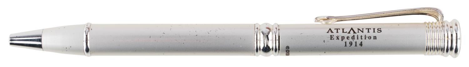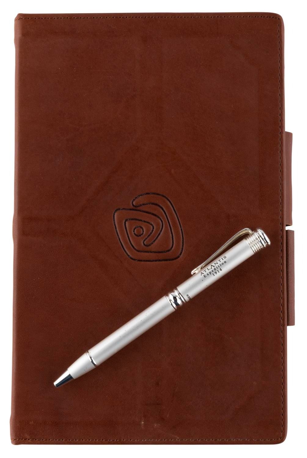 (Disney, 2001) An "Atlantis: The Lost Empire" Feature Animation crew gift set of a leather-covered journal and "Atlantis Expedition 1914" metal ballpoint pen. The set is in very good condition with light handling wear, including small scuffs to the leather and pen.