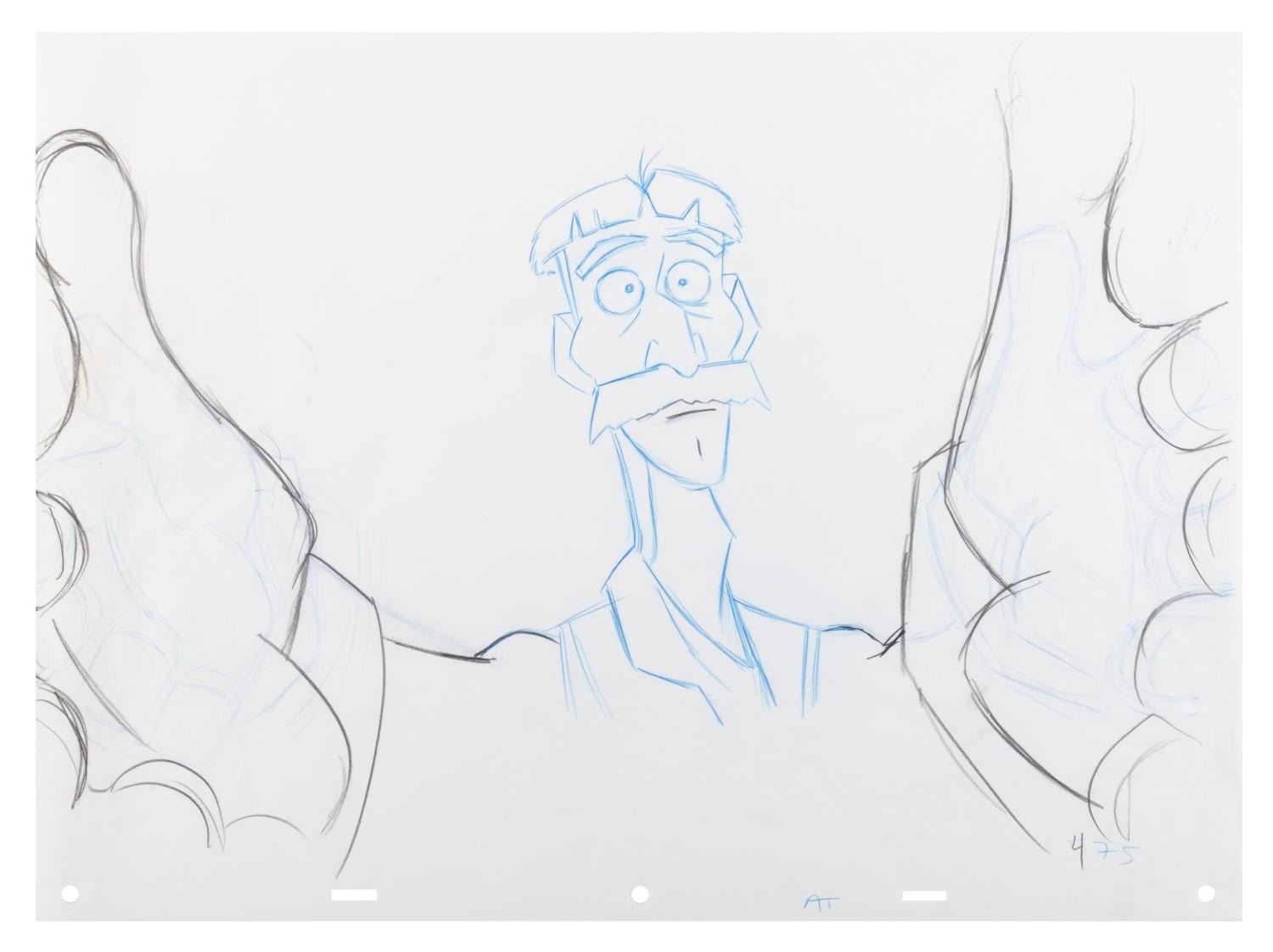 (Disney, 2001) An original production drawing of Vincent “Vinny” Santorini from “Atlantis: The Lost Empire.” Vinny has an image size of 11.5” x 17” on 12.5” x 17” animation paper. The graphite and colored pencil drawing is in good condition with edge wear and creasing from production use.