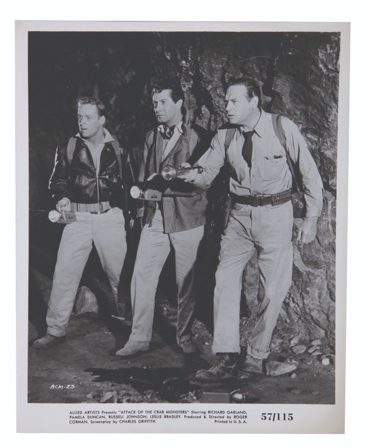 (Allied Artists, 1957) A publicity photo from Attack of the Crab Monsters. Armed with flashlights, three of the films' principal actors (including Russell Johnson, Gilligan Island's Professor) search for Crab Monsters. Measuring 8"x10", the photo is in good condition, with a 1" tear to the left edge repaired with tape.