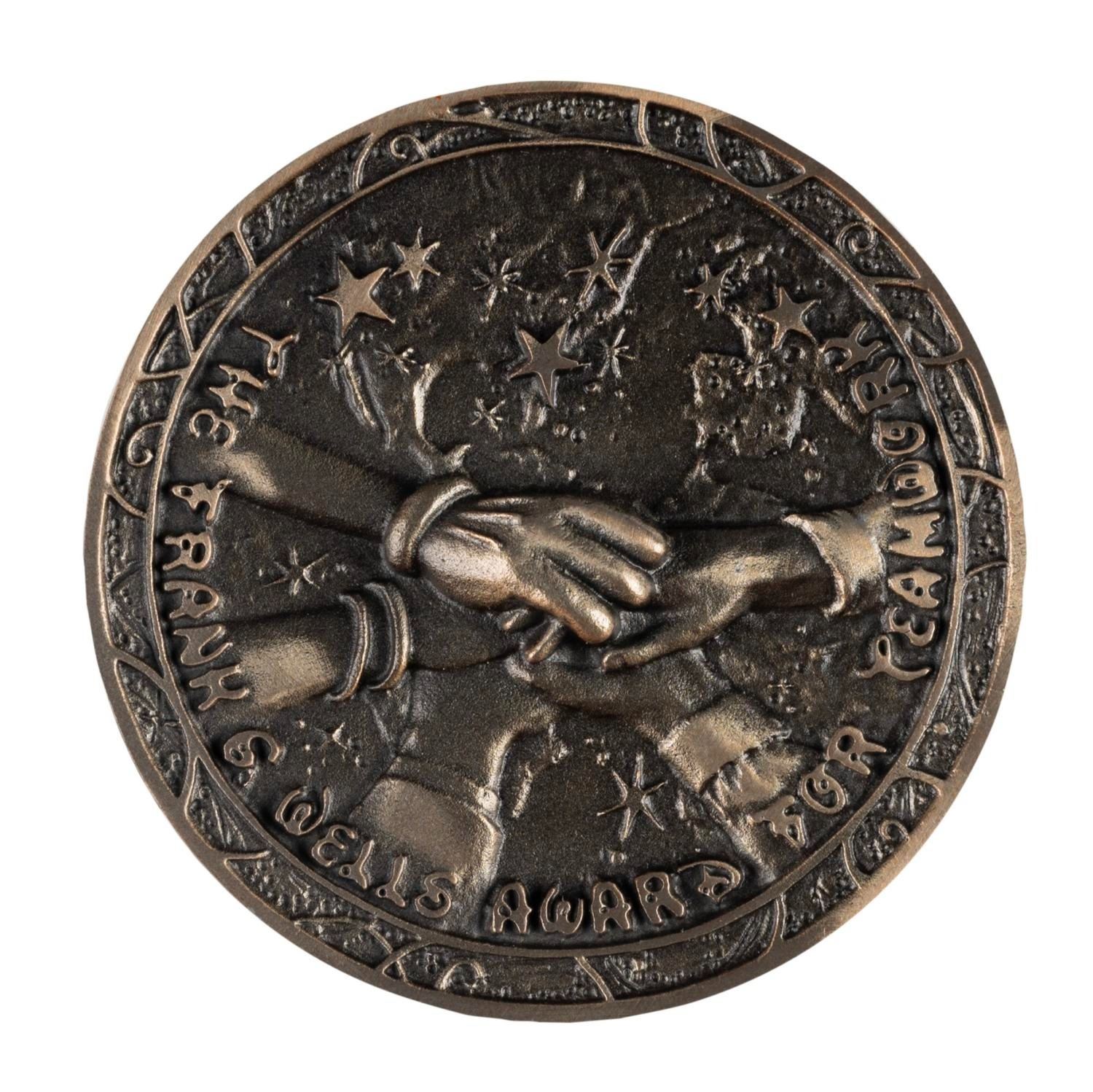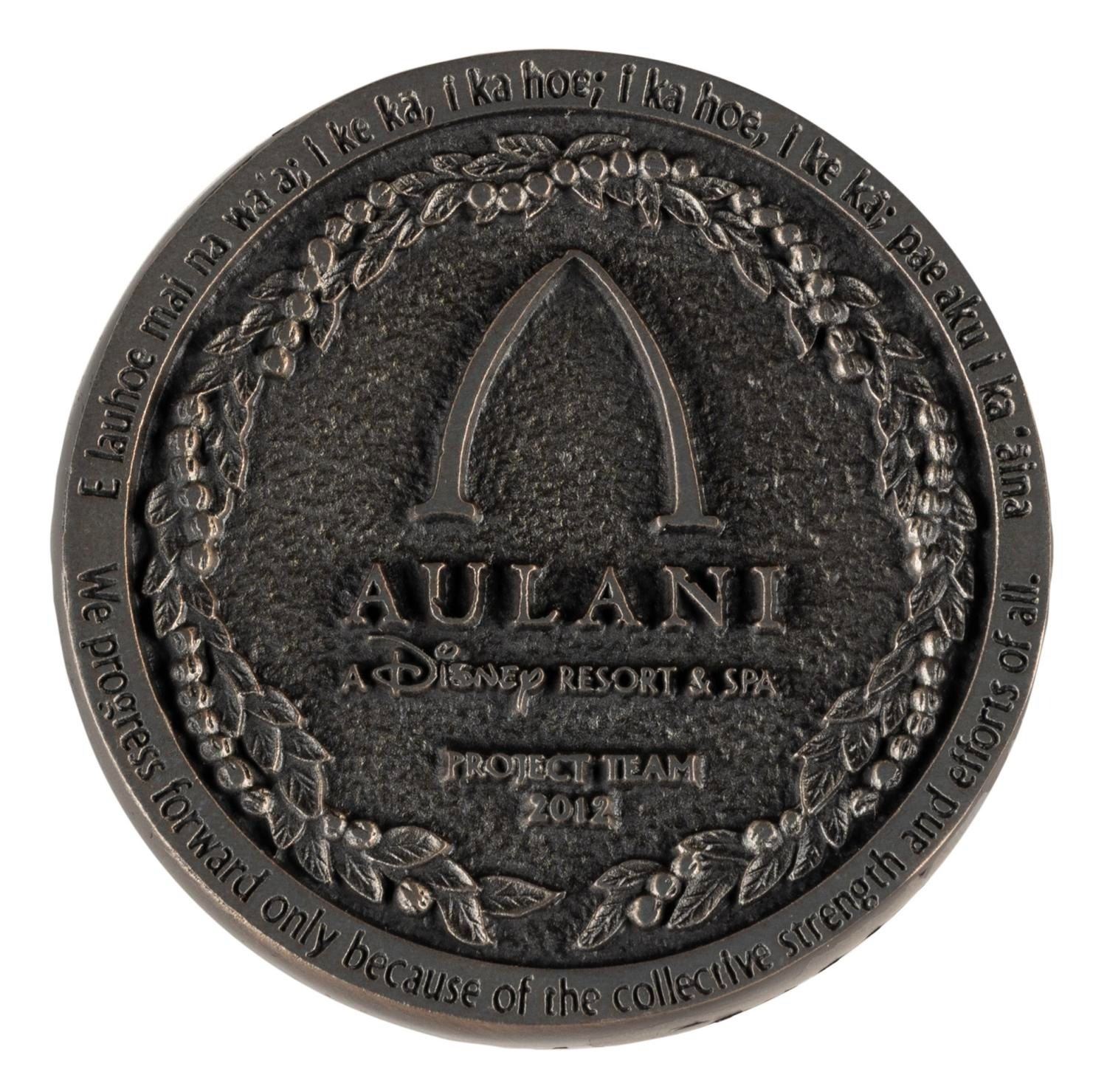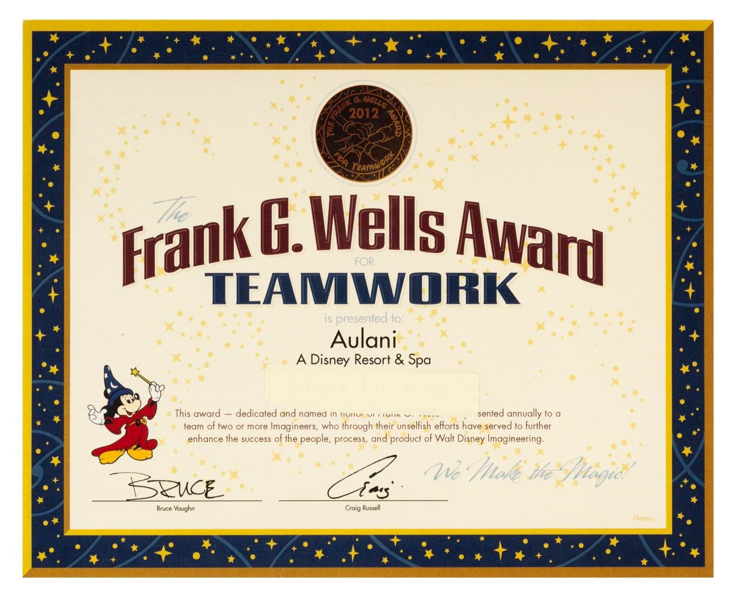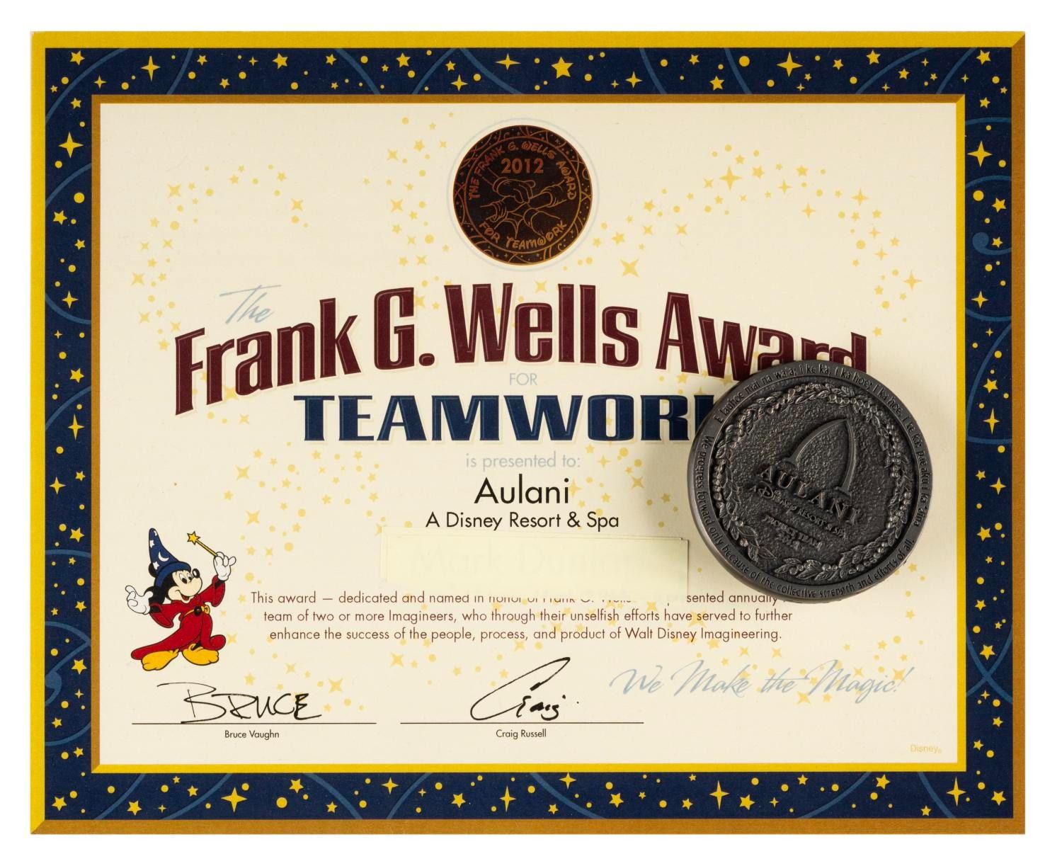 (Disney, 2012) A rare Frank G. Wells Award for Teamwork coin and certificate given to Mark Dunlap, a member of the project team for Aulani, a Disney Resort & Spa. The lot includes a 1.25” x 3.25” x 0.75” tall wooden base for displaying the coin. Ranging in size from the 2.5” in diameter coin to the 8” x 10” certificate, the items are in very good condition with wear, particularly along the edge of the coin.