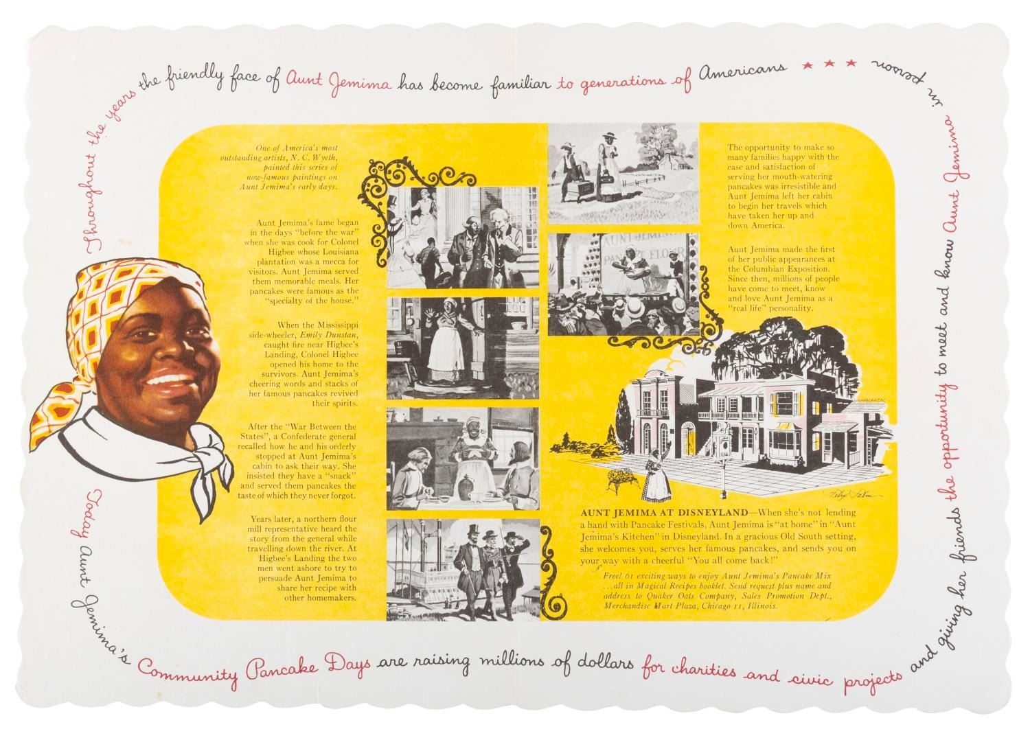 (Disneyland, 1960s) A placemat from Aunt Jemima's Kitchen in Frontierland. The placemat tells the story of Aunt Jemima with several illustrations. Measuring 9.75" x 14", the placemat is in good condition with minor edge wear, very slight spotting, and faint horizontal and vertical creases through the center.