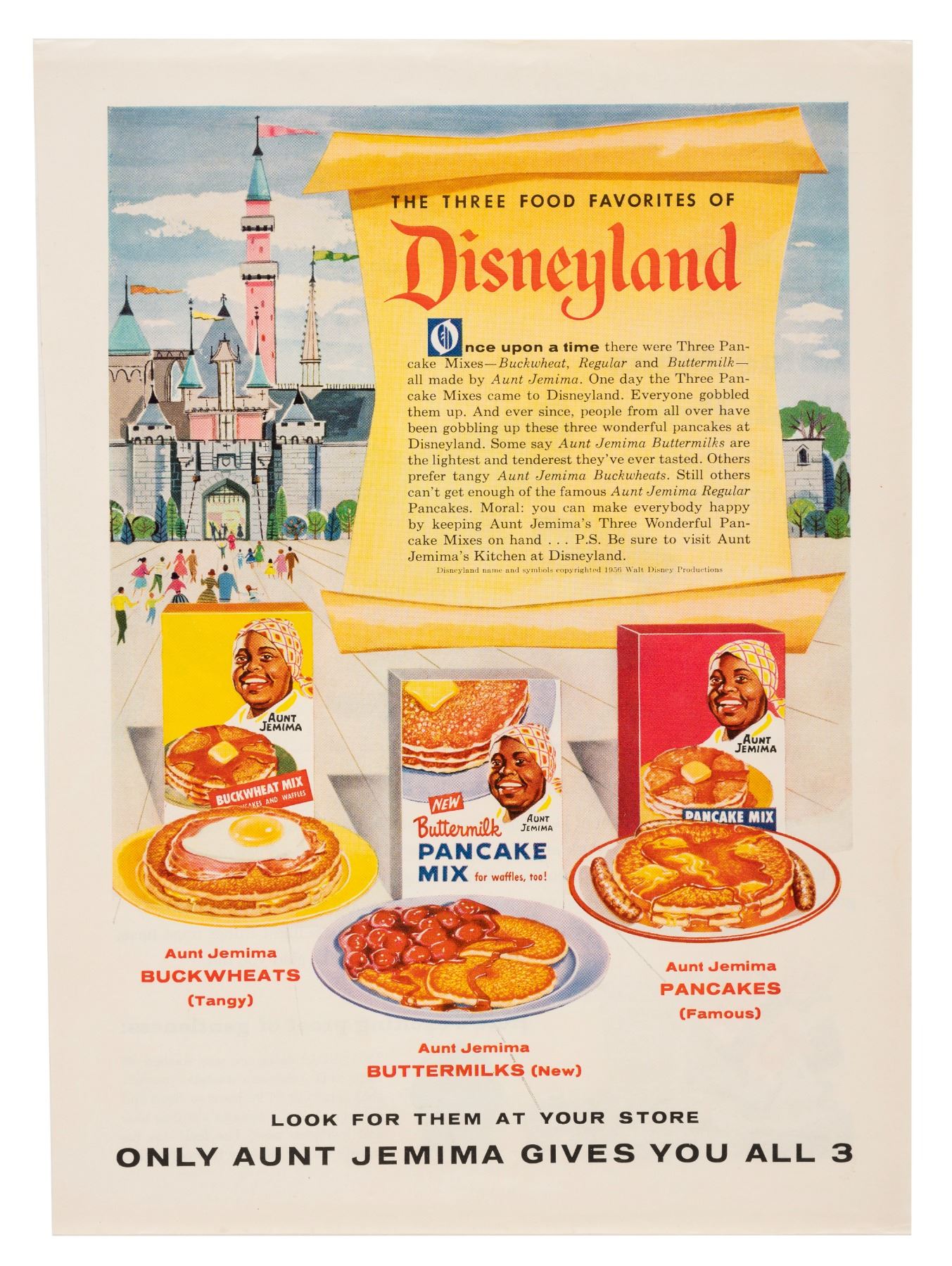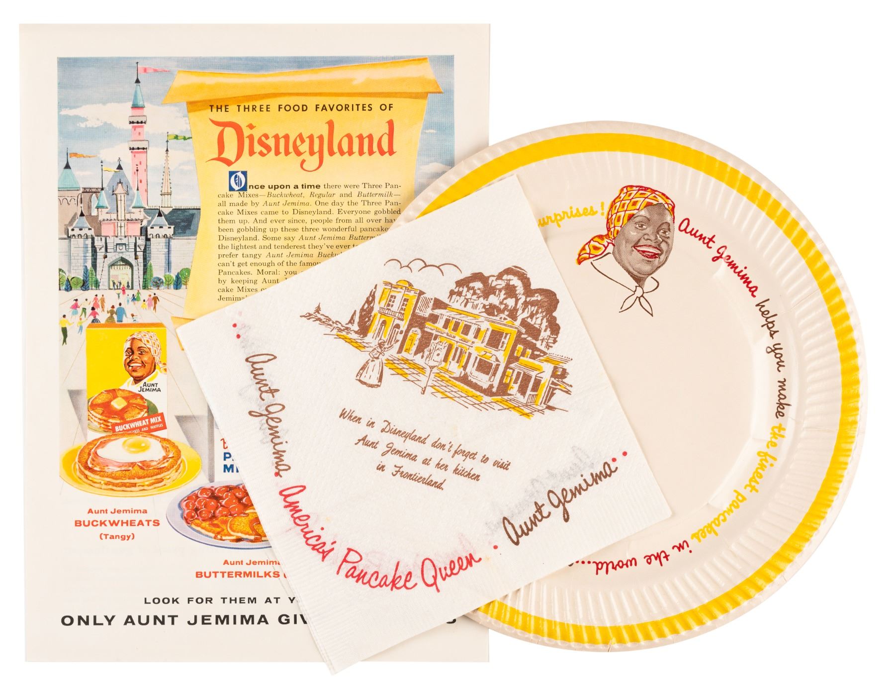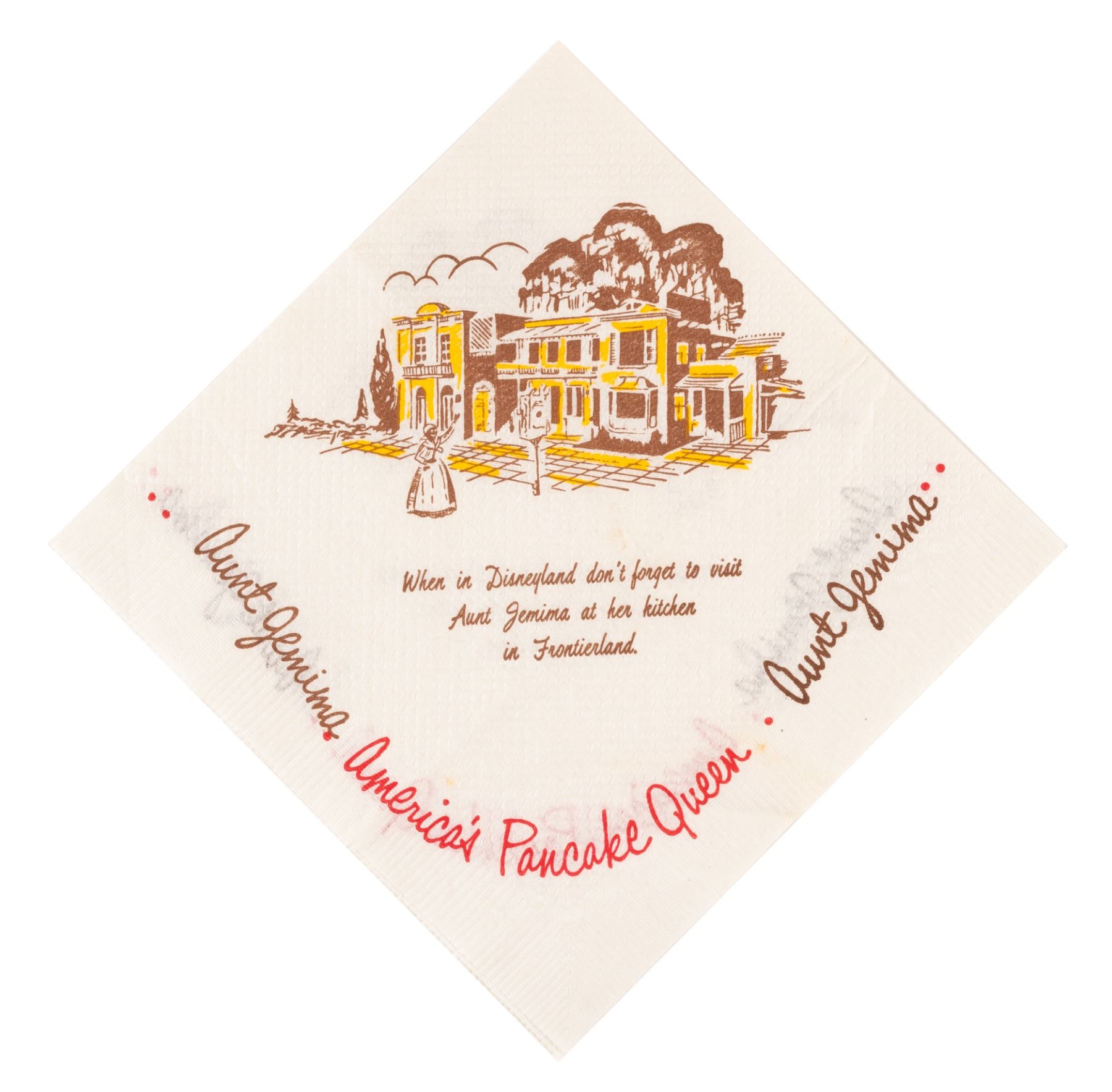 (Disneyland, 1962-1970) A plate, napkin, and magazine advertisement from Aunt Jemima’s Kitchen. Aunt Jemima’s Pancake House opened in the Park in 1955 and was renamed Aunt Jemima’s Kitchen in 1962, eventually closing in 1970. The 11” x 8” advertisement is in fine condition, the 9.25” diameter plate displays in very good condition with light creases, and the 6.5” x 6.5” napkin displays in good condition with light folds and discoloration from age.