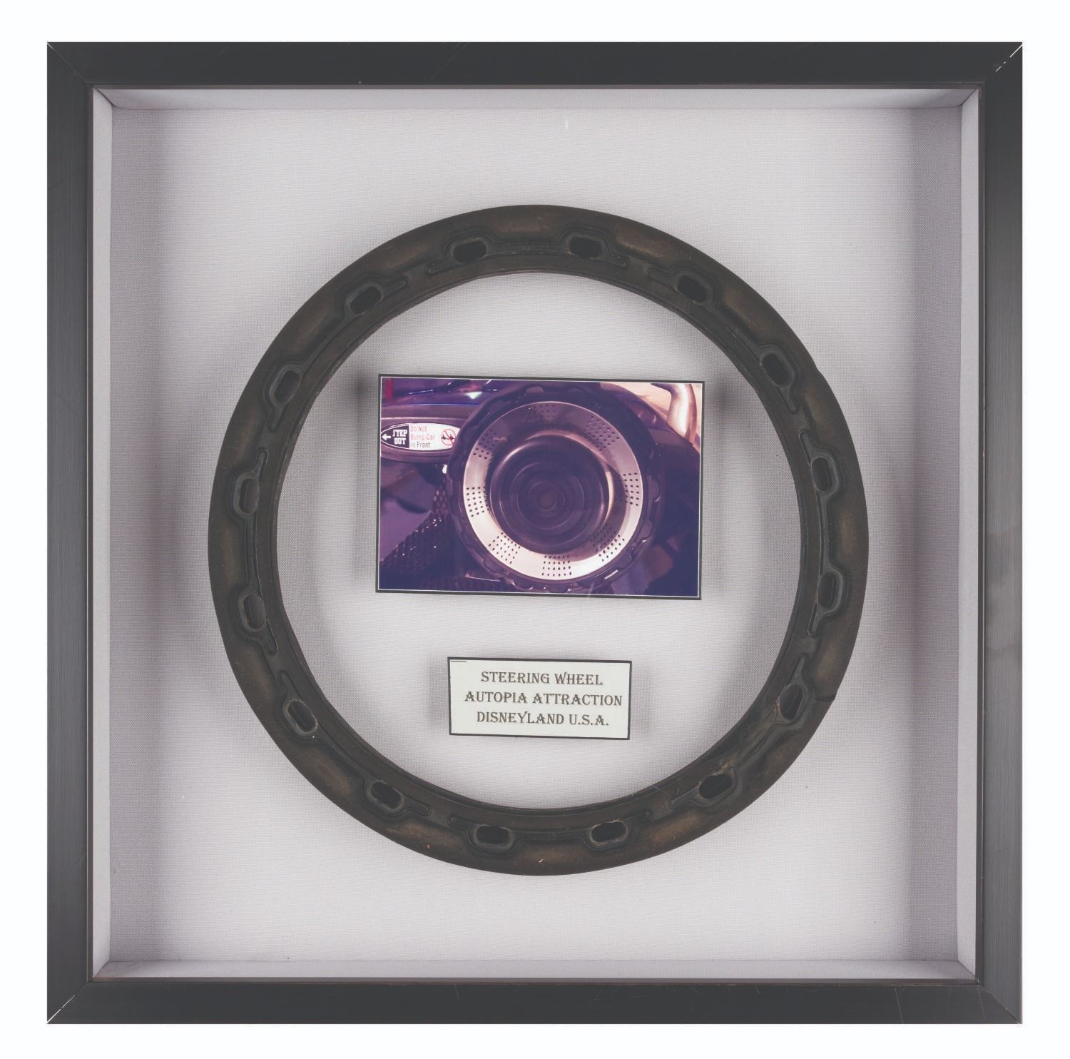 (Disneyland, 2000s) A steering wheel from an Autopia ride vehicle. Wheels like these were part of the next generation of cars that debuted in June 2000, replacing the old Autopia Mark VIIs. Measuring 12" in diameter and displayed in a 17.25" x 2" x 17.25" custom frame, the rubber wheel displays in very good condition with typical wear from Park use, while the frame is in good condition with scratches and light wear.