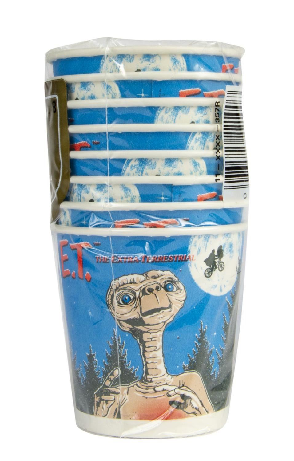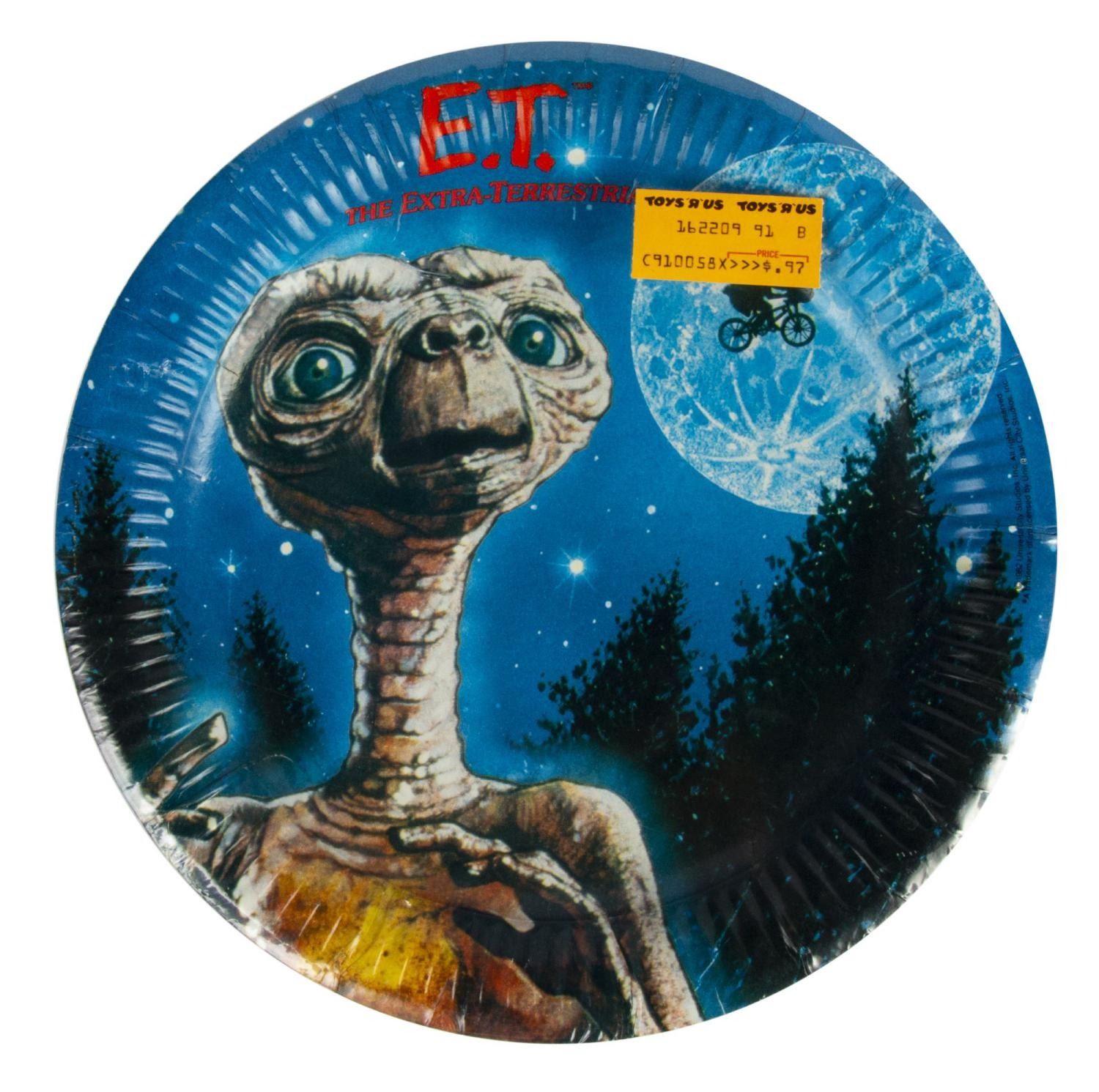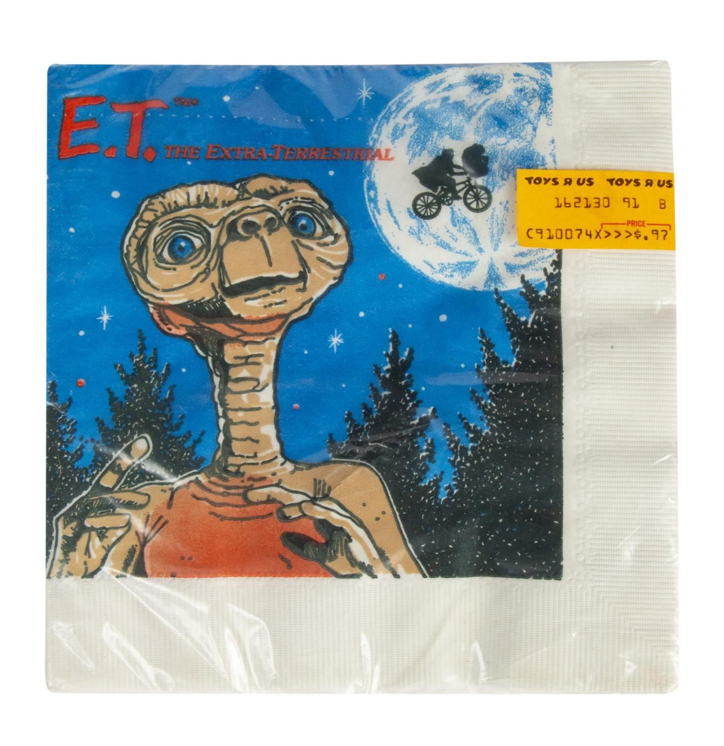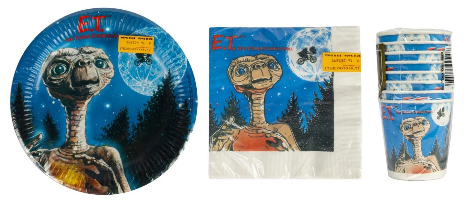 (Universal, 1982) A rare unopened set of "E.T." themed party items, including cups, plates, and napkins, created by Reed Co. with their original Toys 'r' Us sales stickers still applied. The plates measure 9" in diameter, the napkins measure 6.75" x 6.75", and the cups measure 3" tall each. The condition is very good overall with little wear.