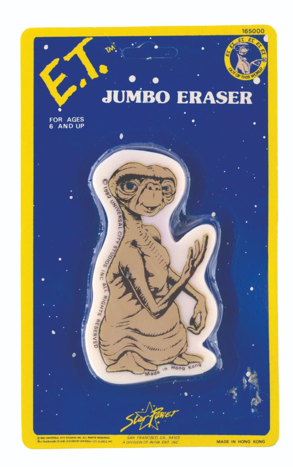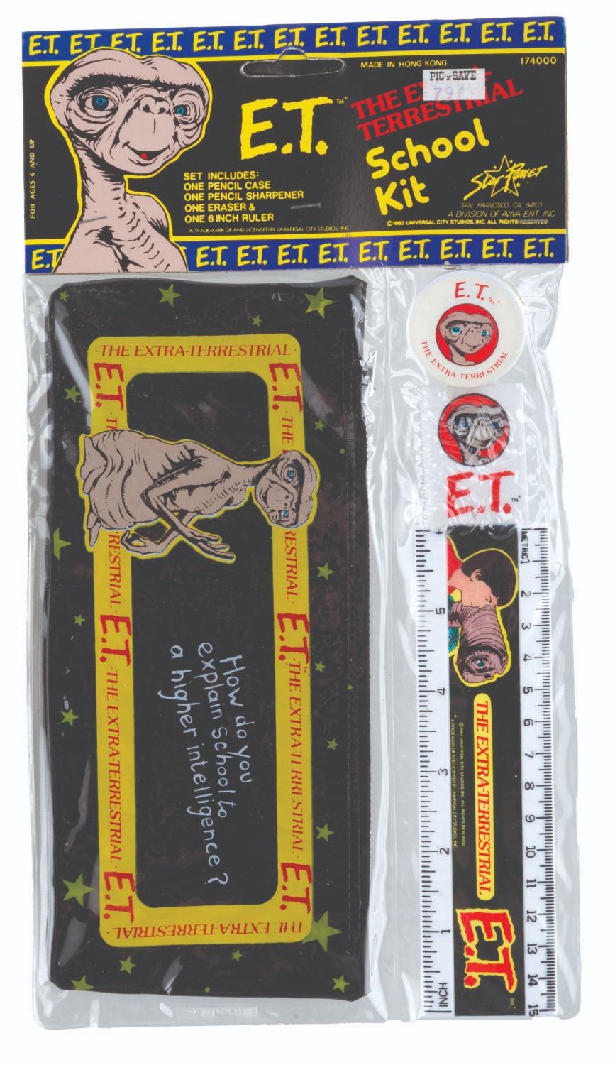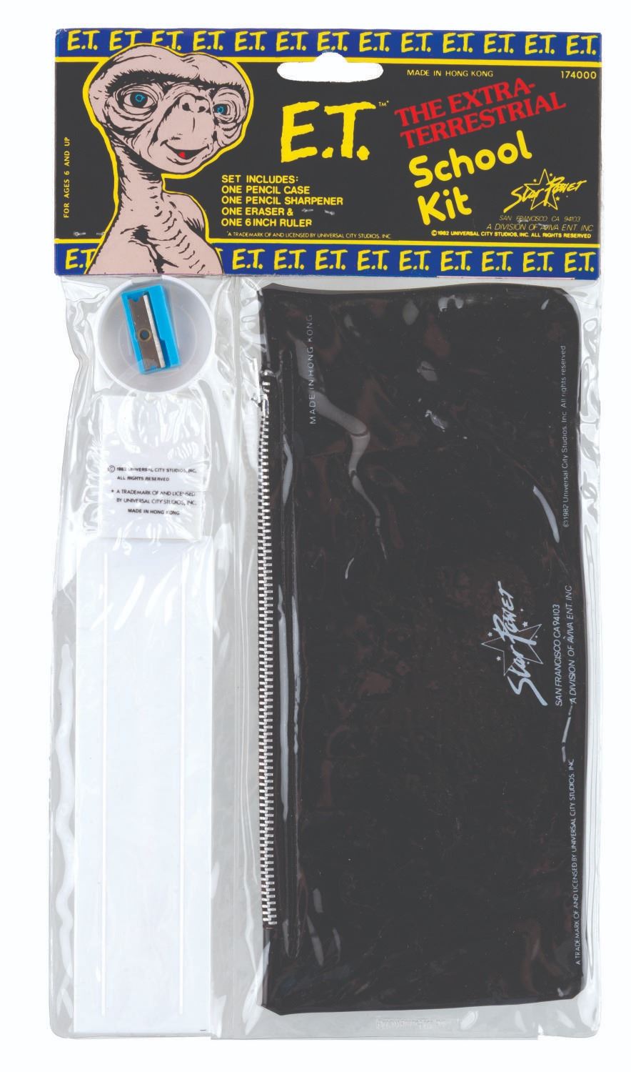 (Star Power, 1982) An “E.T.” back to school collection including a jumbo eraser of Earths most lovable alien, and a themed school kit with ruler, eraser, pencil sharpener, and pencil case all themed to the Extra-Terrestrial. The school supplies are in fine condition in the original upopened packaging.
