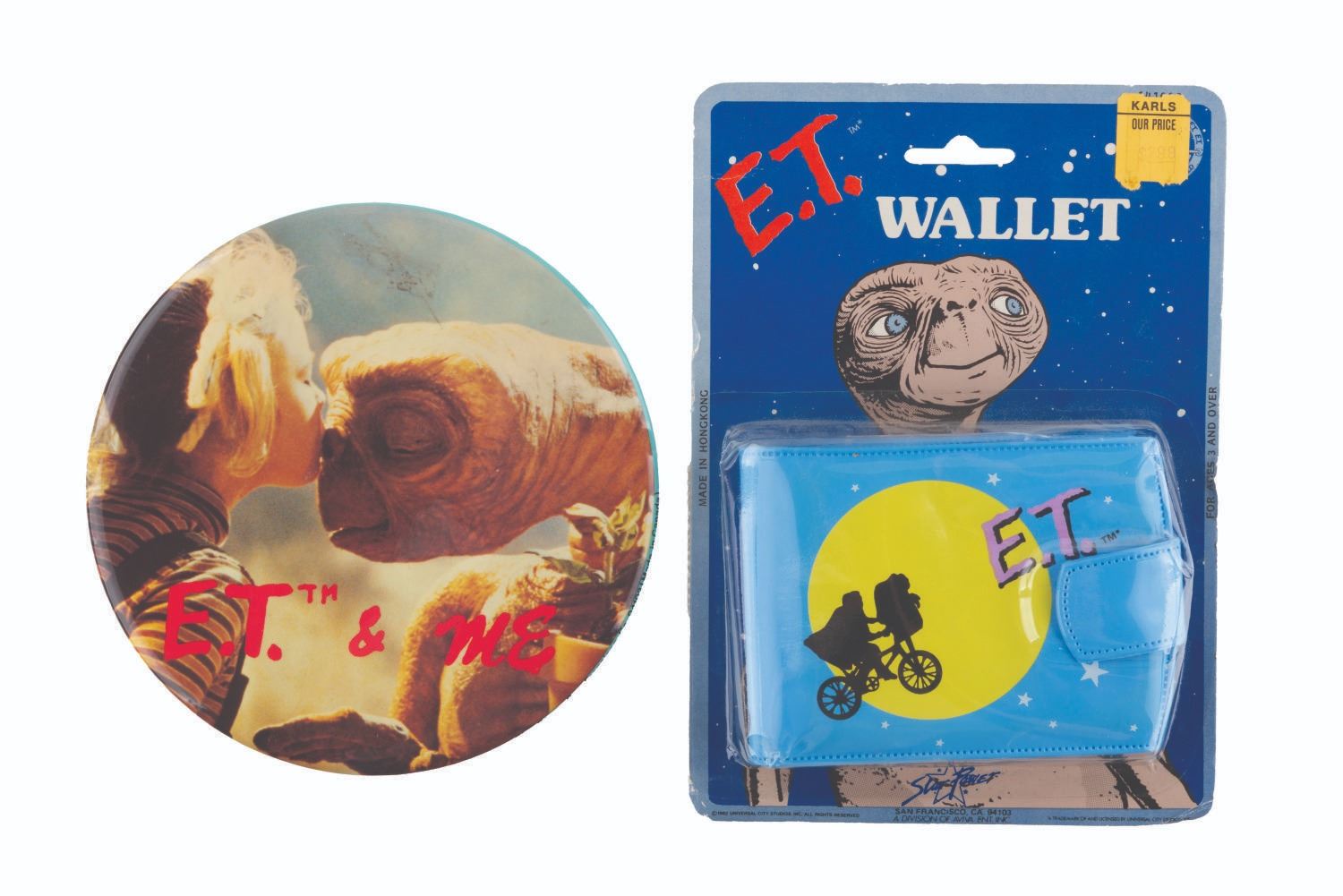 (Star Power, 1982) A vinyl “E.T.” wallet in the original packaging, with a 6” photo button of E.T. and Gertie (Drew Barrymore). The wallet is in fine condition on the original card, and the button in very good condition with small scratches and sticker residue.