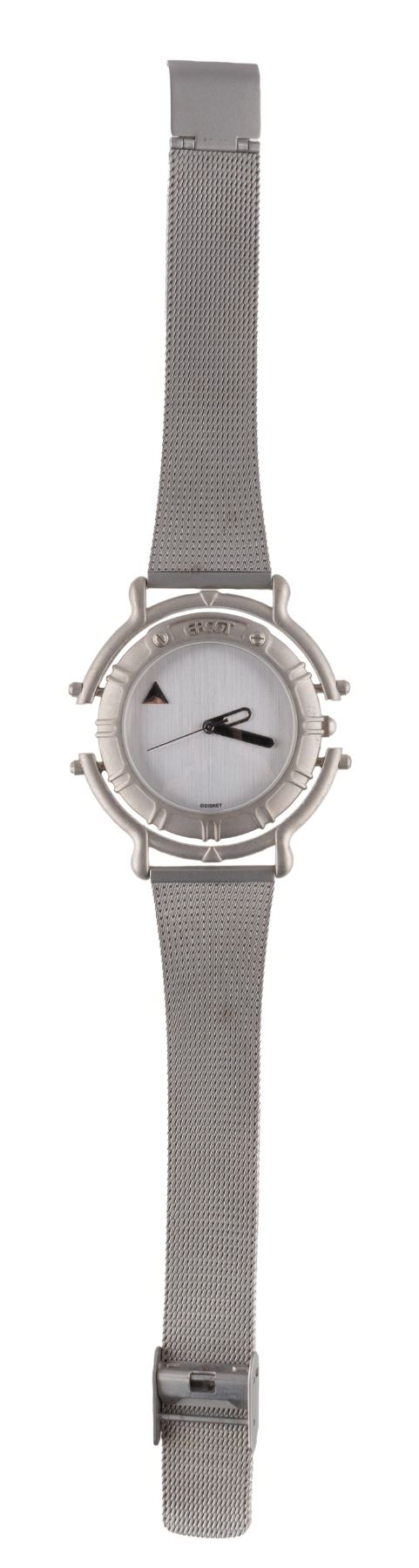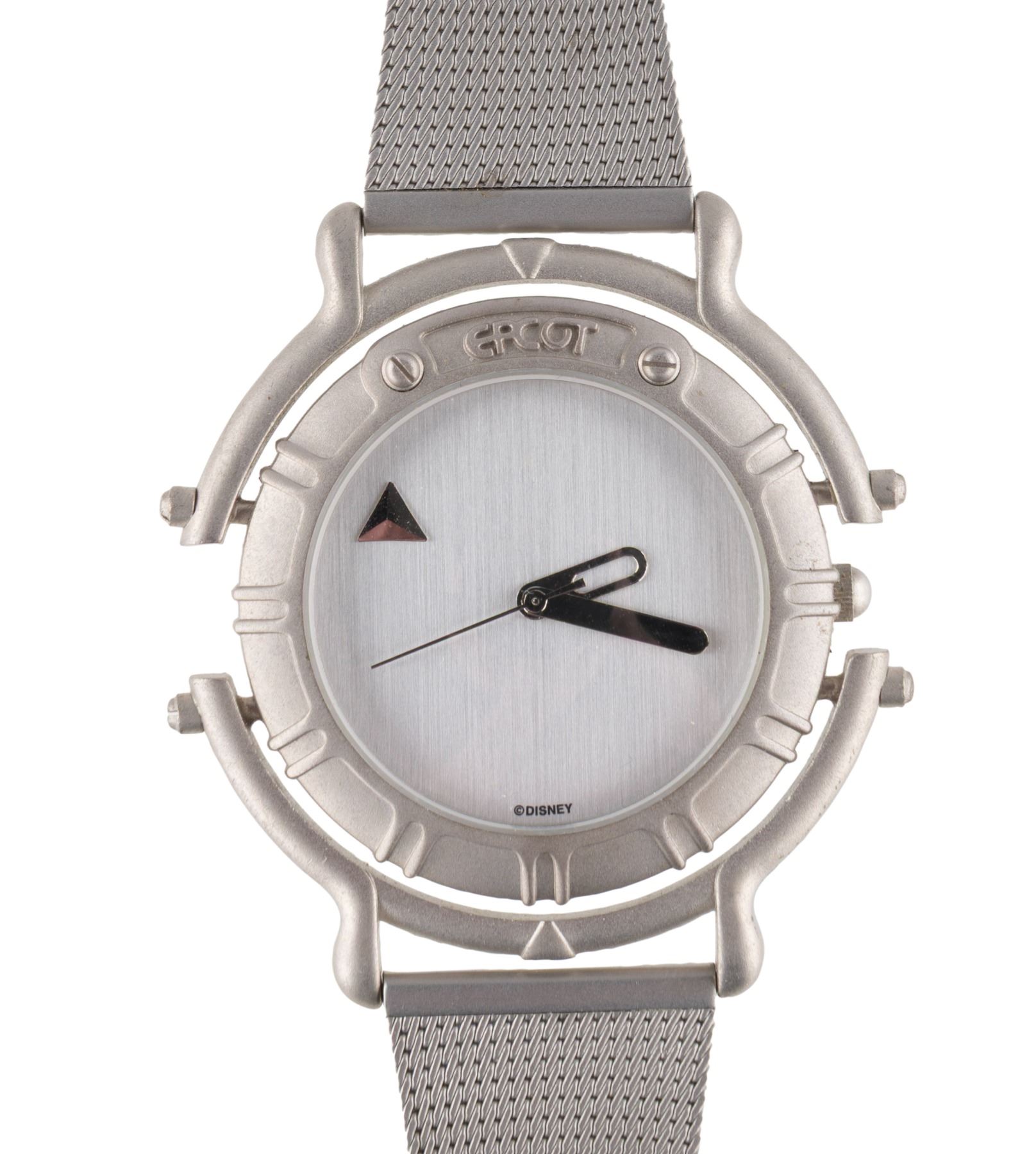 (EPCOT Center, 1992) A wristwatch commemorating the 10th anniversary of EPCOT Center. The steel-banded watch is in very good condition with light handling wear, requiring a battery and possibly service to function. The box is in fair condition with a broken hinge.