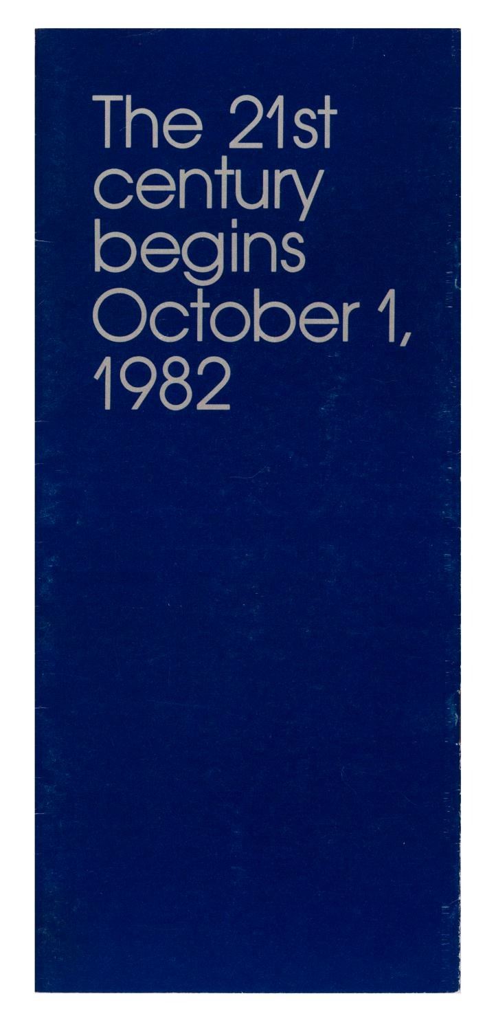 (EPCOT, 1981) An EPCOT Center “21st Century Begins” Brochure. This brochure was issued within a year prior to the Park’s opening and advertises Future World and World Showcase with images of colorful concepts and scheduled opening date of October 1, 1982. Measuring 4”x9”, this brochure is in good condition with scuffs, creases and wear along folds, edges, and corners.