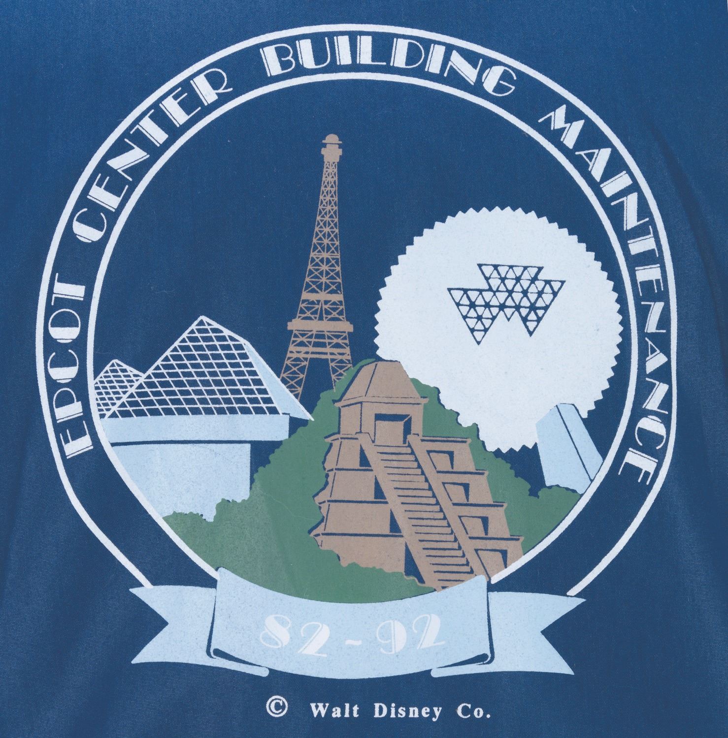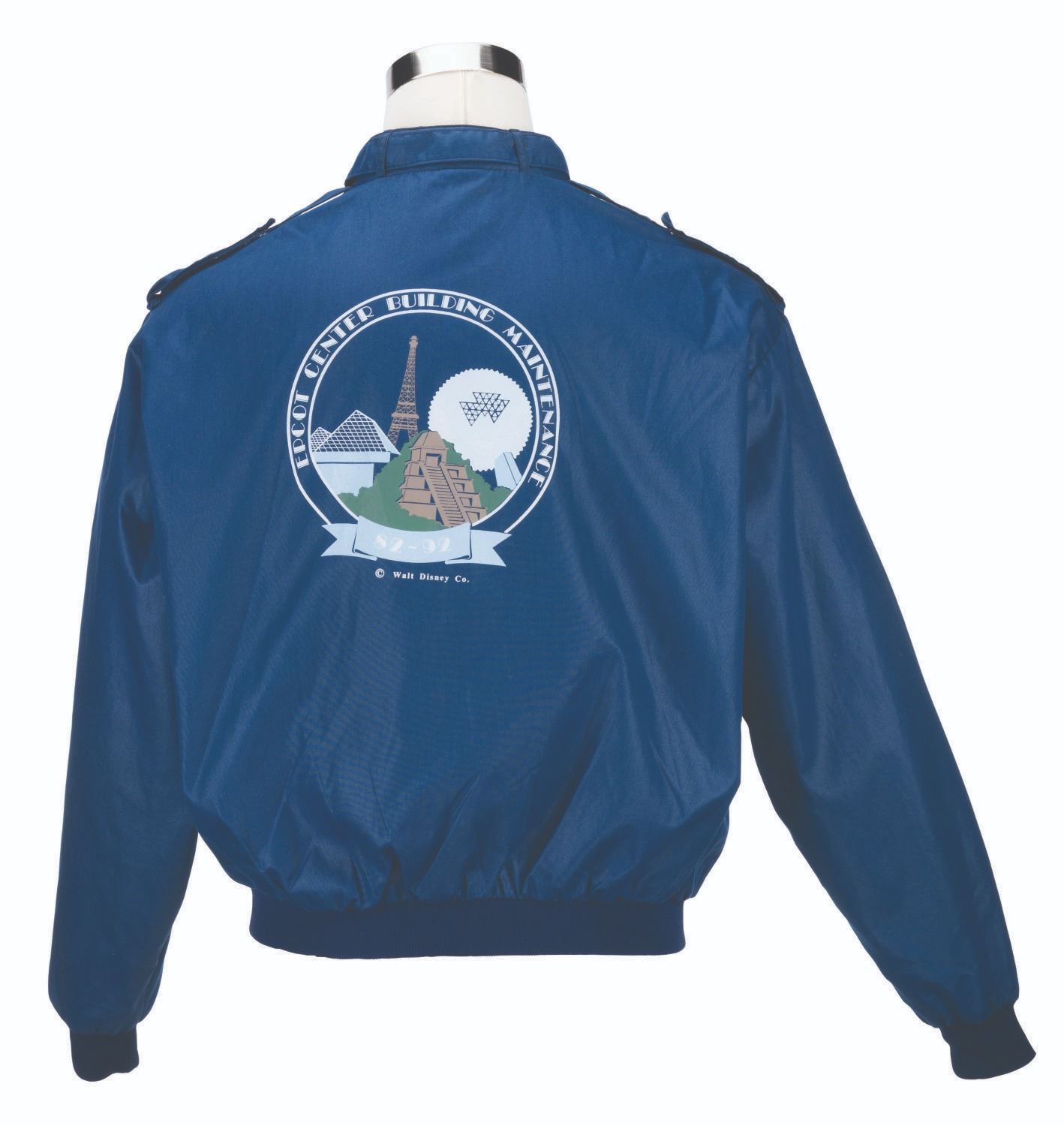 (EPCOT Center, 1992) An EPCOT Center Building Maintenance jacket, given to Cast Members for the Park's 10th anniversary. Labeled a size XL, the jacket is in very good condition with light pilling, discoloration from age, and wear.