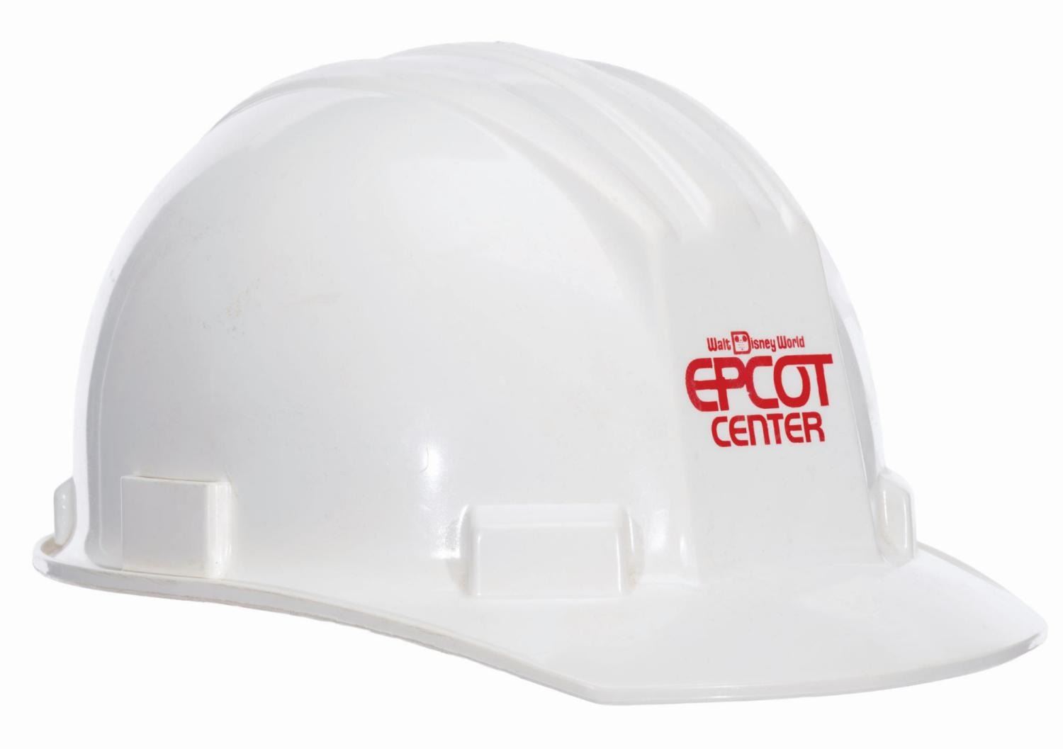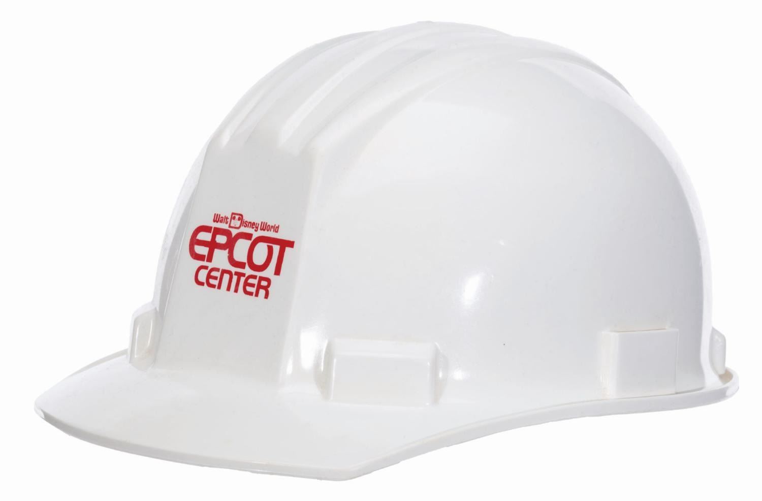(EPCOT Center, 1980s-90s) A hard hat worn by construction workers at EPCOT Center in Walt Disney World. Unlabeled, the hard hat is in good condition with typical scratches and wear from Resort use.