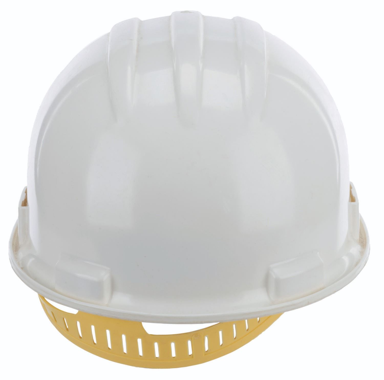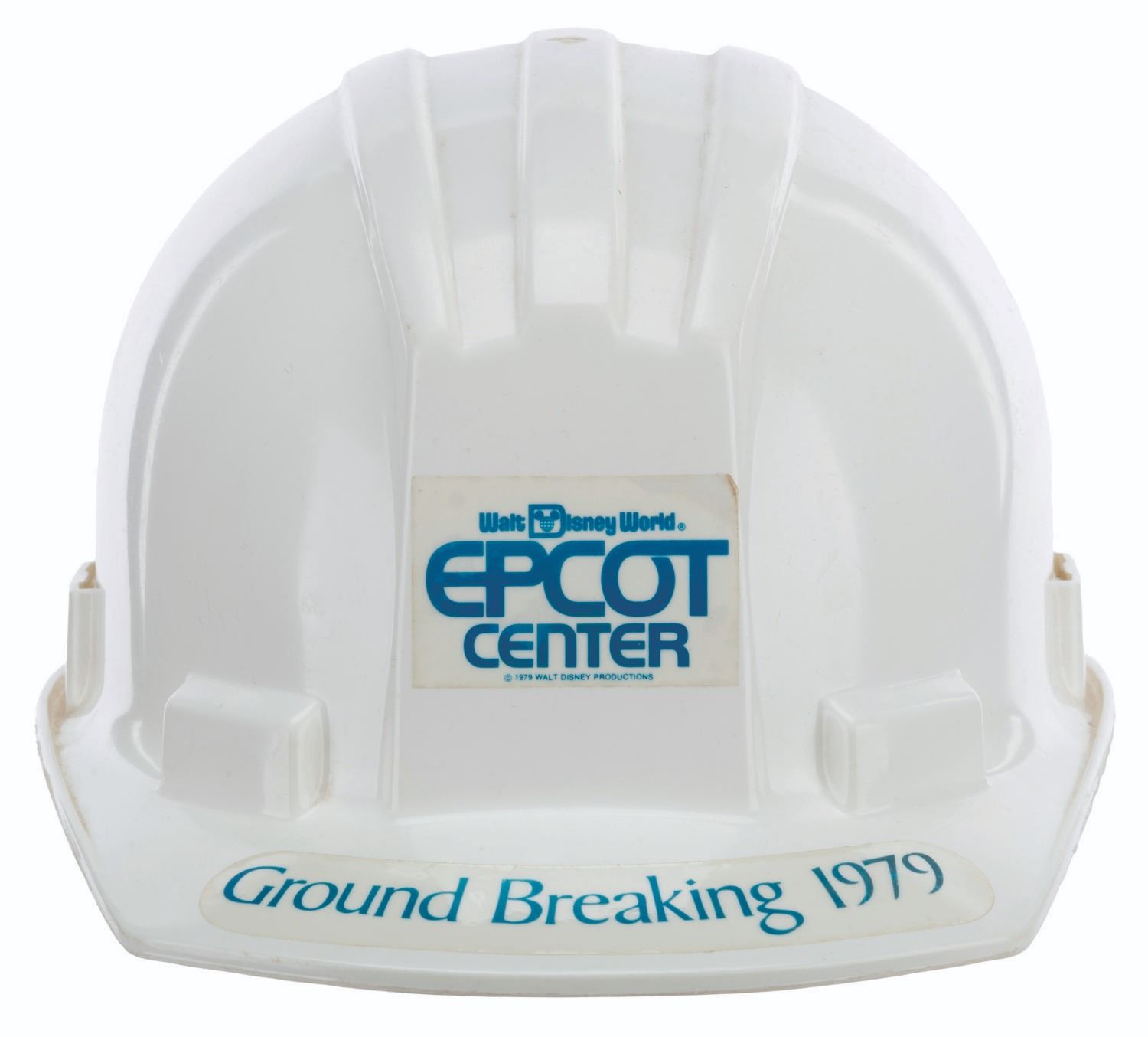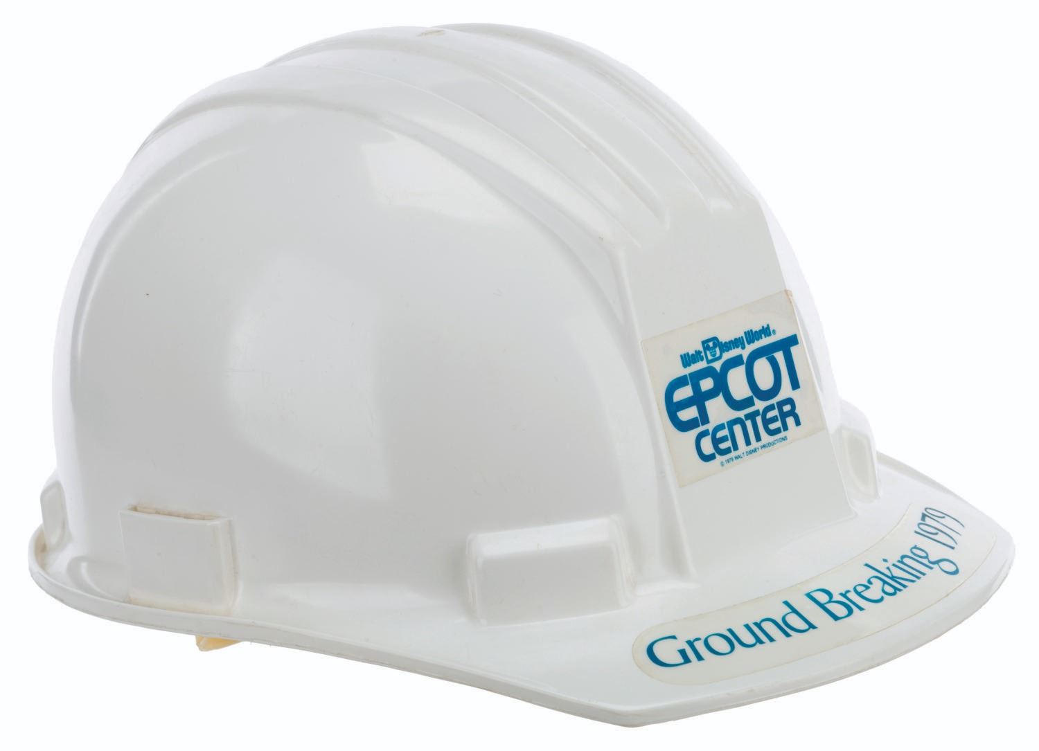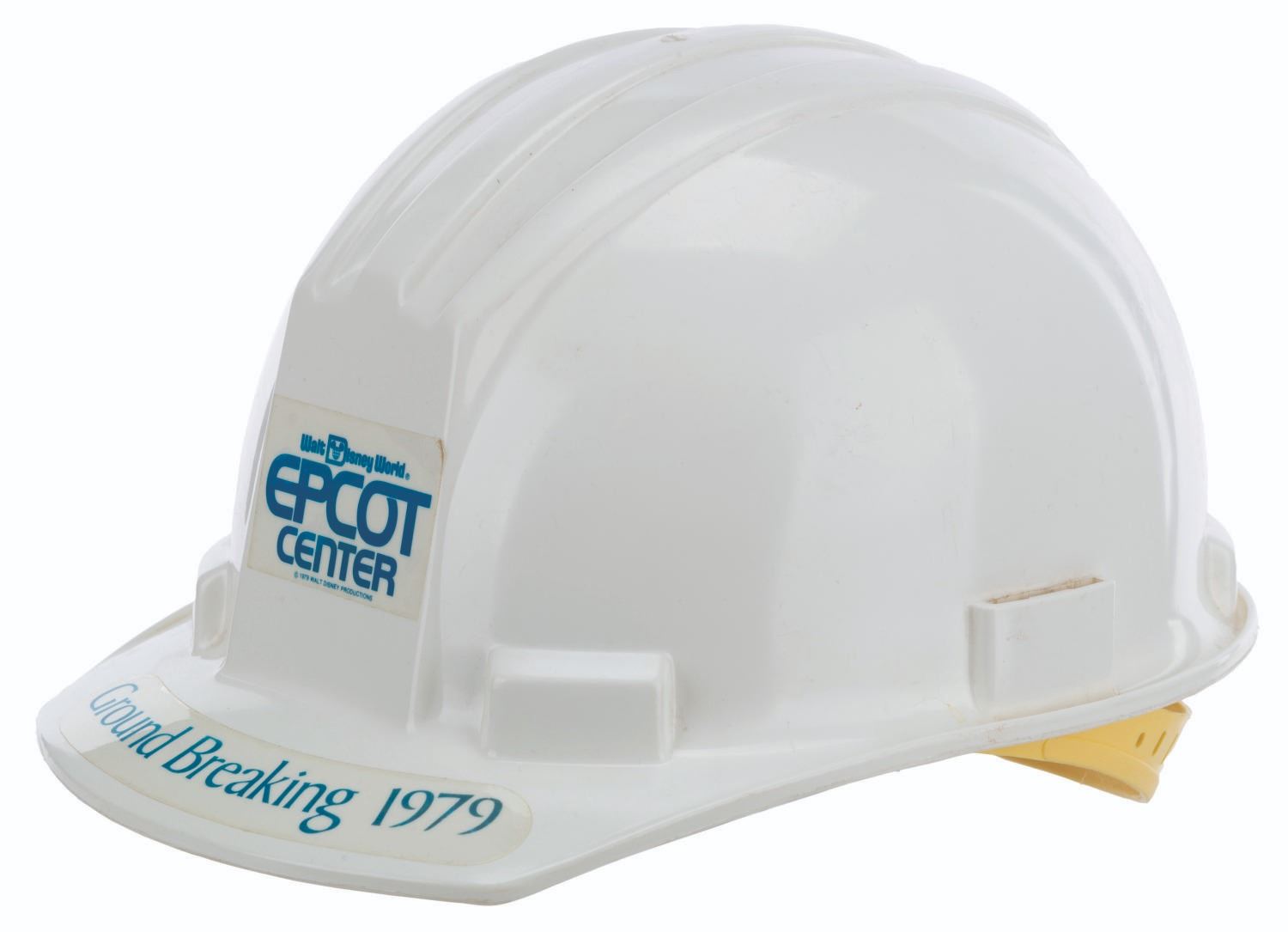 (EPCOT Center, 1979) A construction hard hat from the EPCOT Center groundbreaking in 1979. Unlabeled but likely a size medium, the hard hat displays in very good condition with scratches, light peeling on the adhesives, wear, and discoloration from age.
