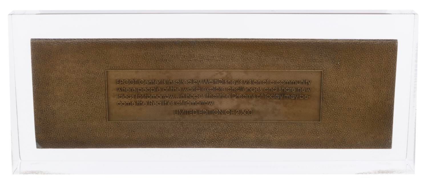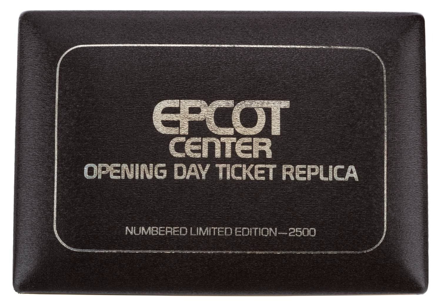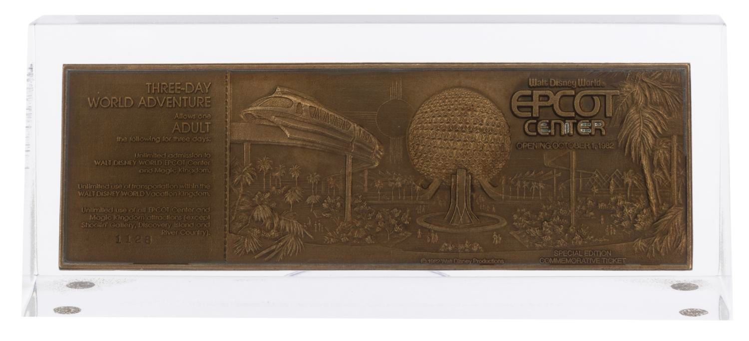 (EPCOT Center, 1982-83) A bronze replica EPCOT Center opening ticket encased in lucite. Released in a limited edition, this piece is numbered 1228. Measuring 6.5” x 1.5” x 2.5” tall with its 5.5” x 1.75” x 7.75” original box, the piece is in very good condition with light scratches and wear.