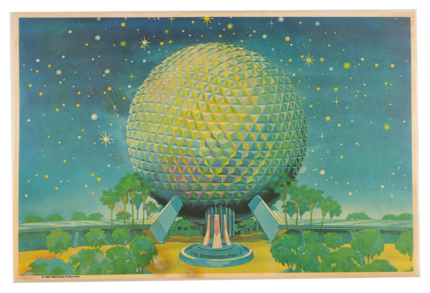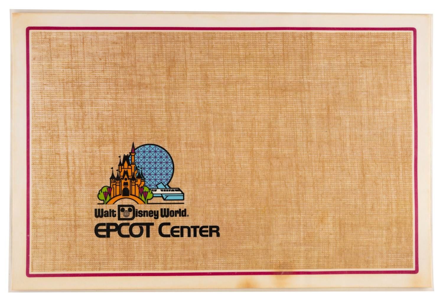 (EPCOT Center, 1982) An EPCOT Center opening year placemat featuring the Park’s logo, Spaceship Earth. Measuring 11.5” x 17.5”, the placemat displays in good condition with stains, scratches, wear, a 1” cut, and discoloration from age.
