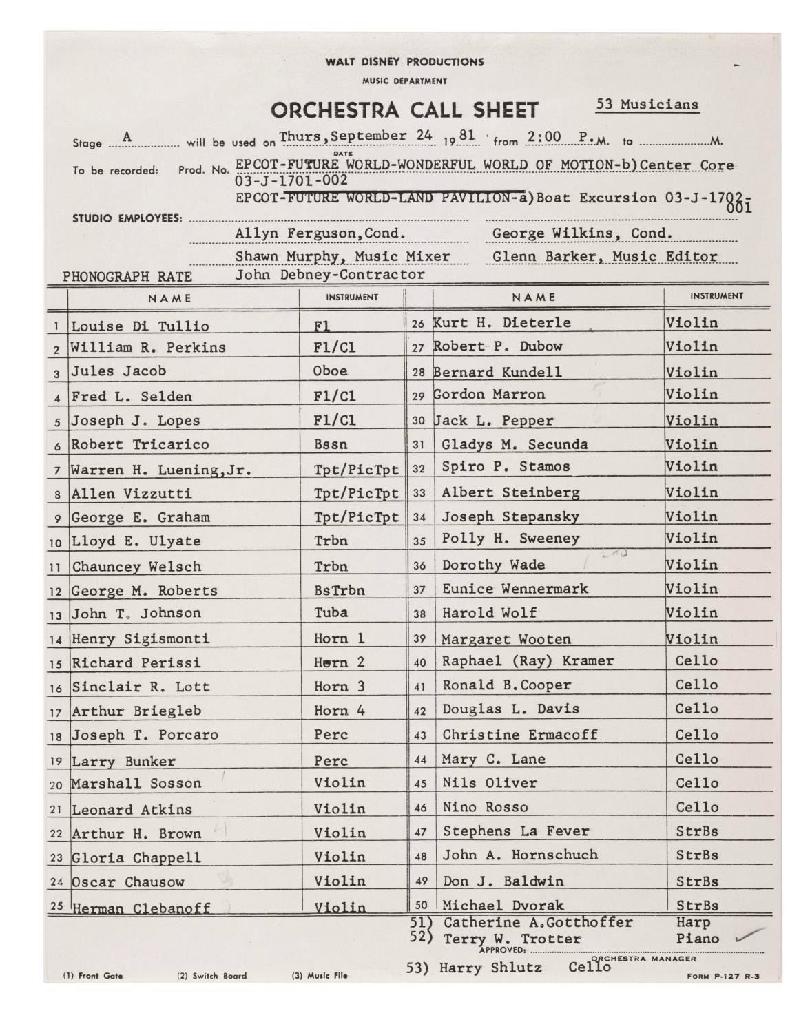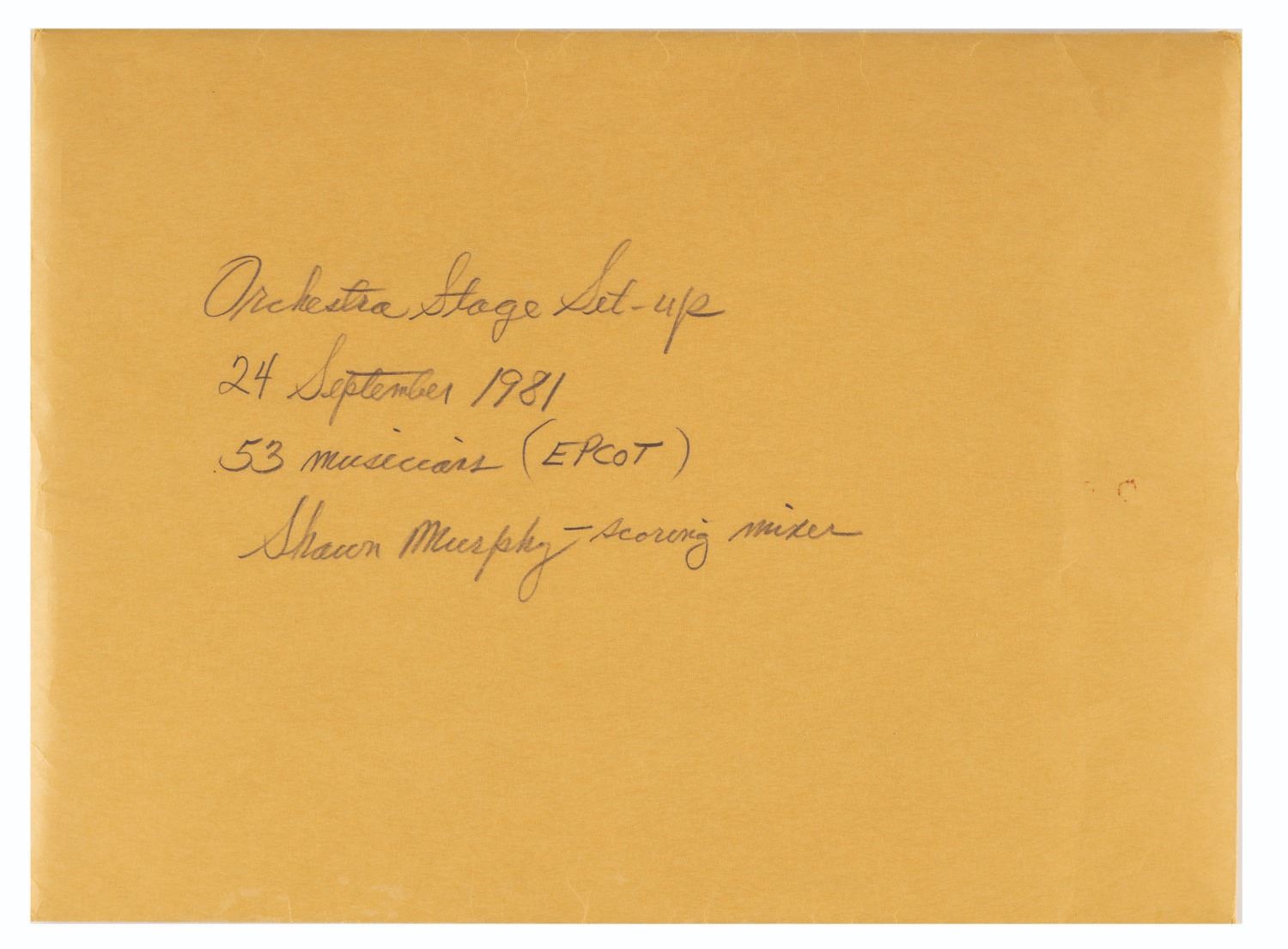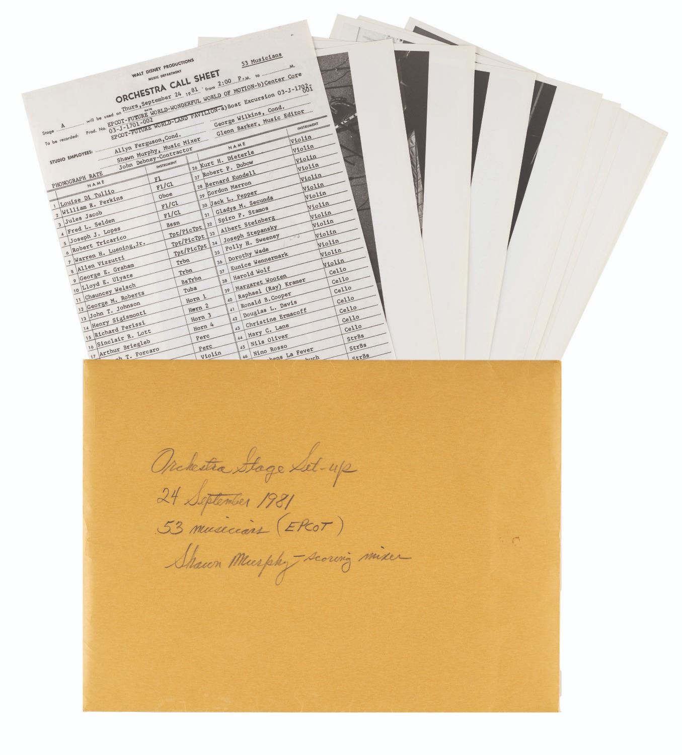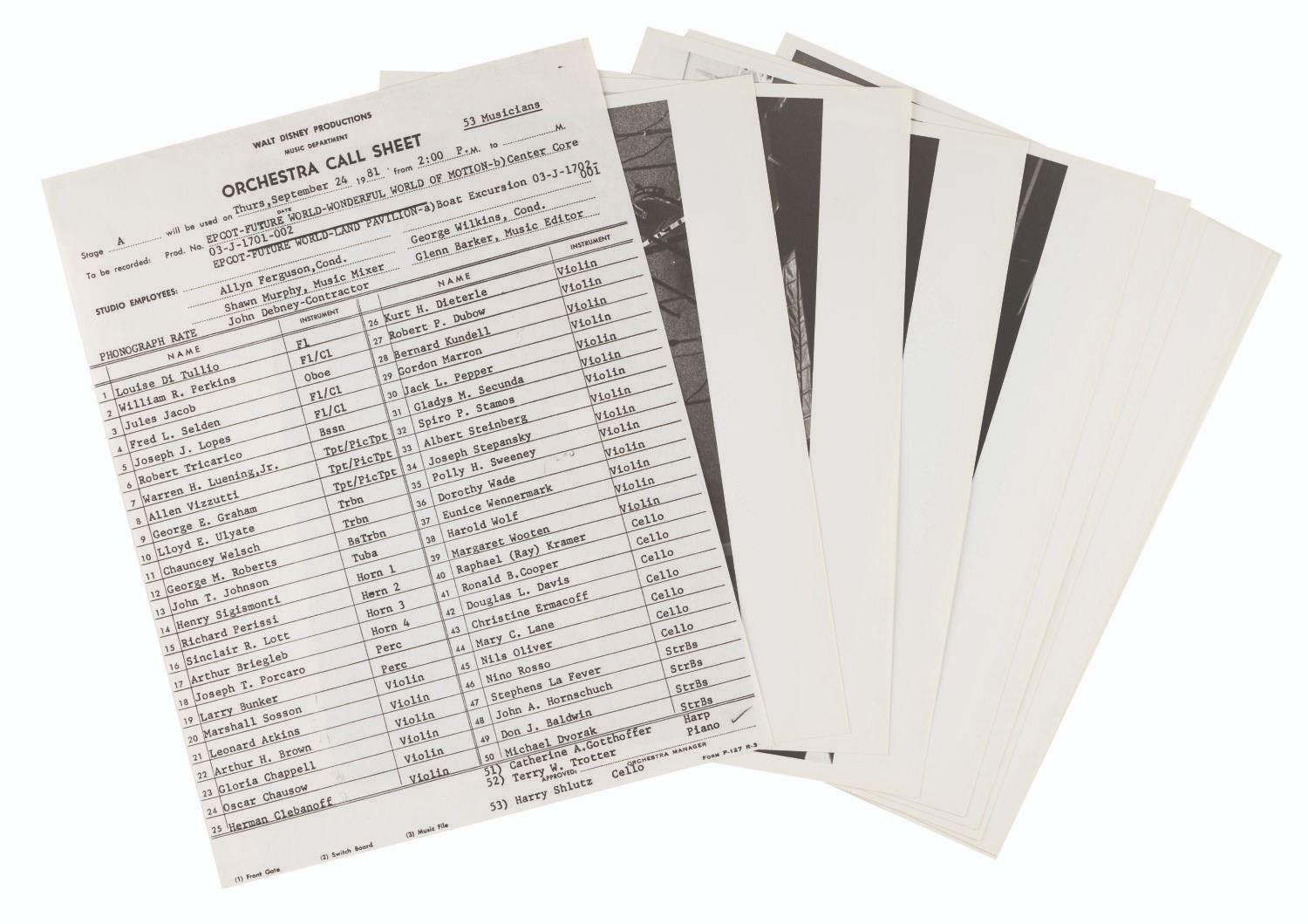 (Walt Disney Imagineering, 1981) A call sheet and 13 photographs from an EPCOT orchestra recording session for Future World. The call sheet lists 53 musicians by name scheduled to record The World of Motion Center Core and Land Pavilion Boat Excursion. The thirteen photos show the recording area being set up for the musicians' arrival. The 8.5" x 11" call sheet and 8" x 10" photos are in very good condition with light wear from production use.