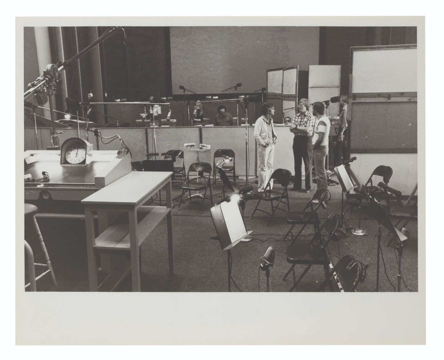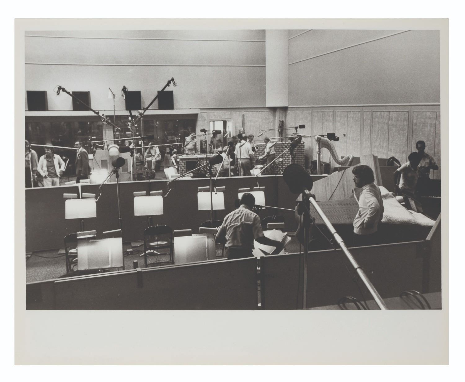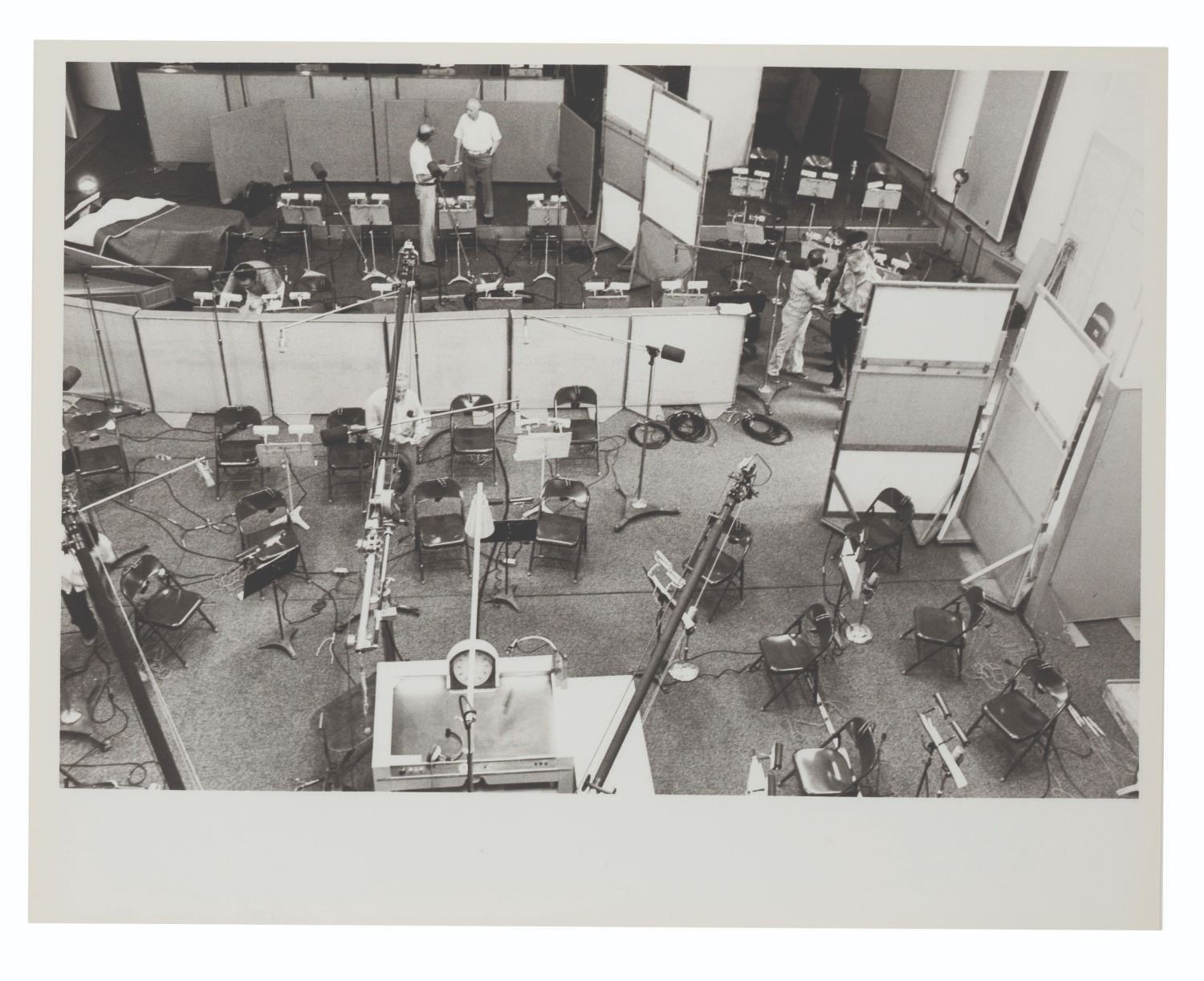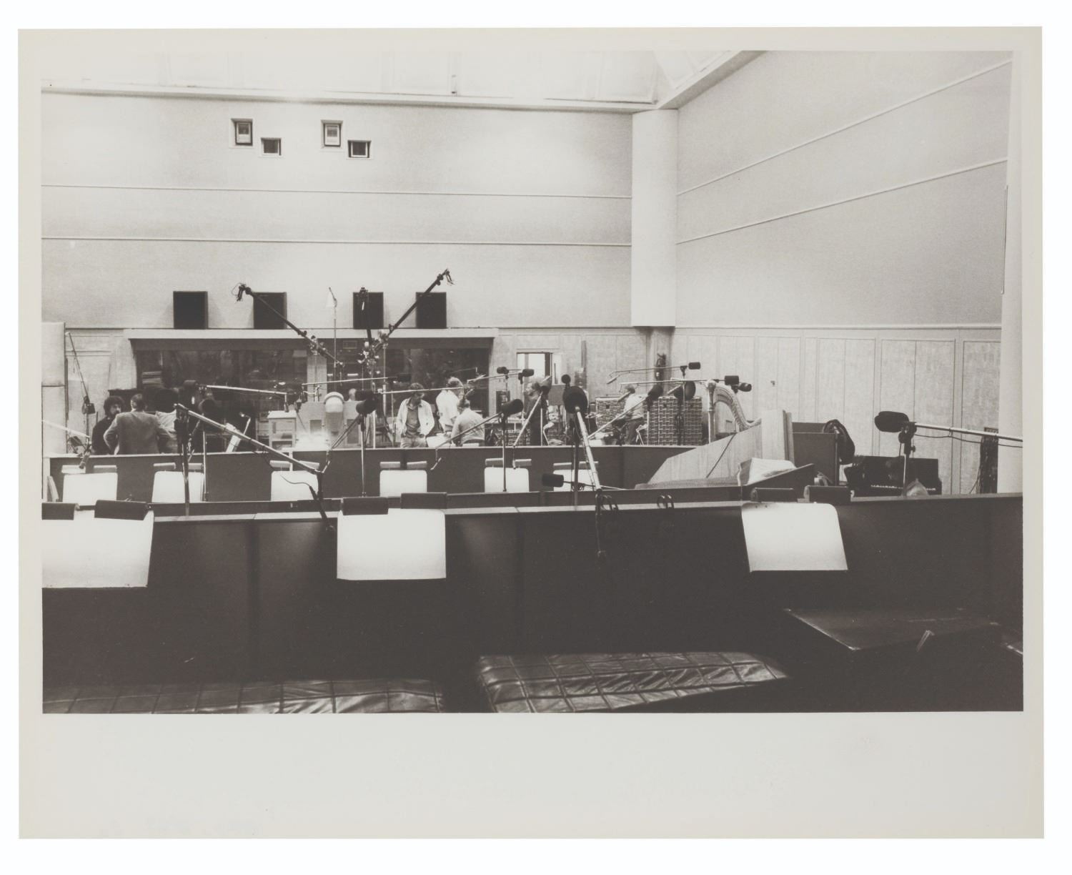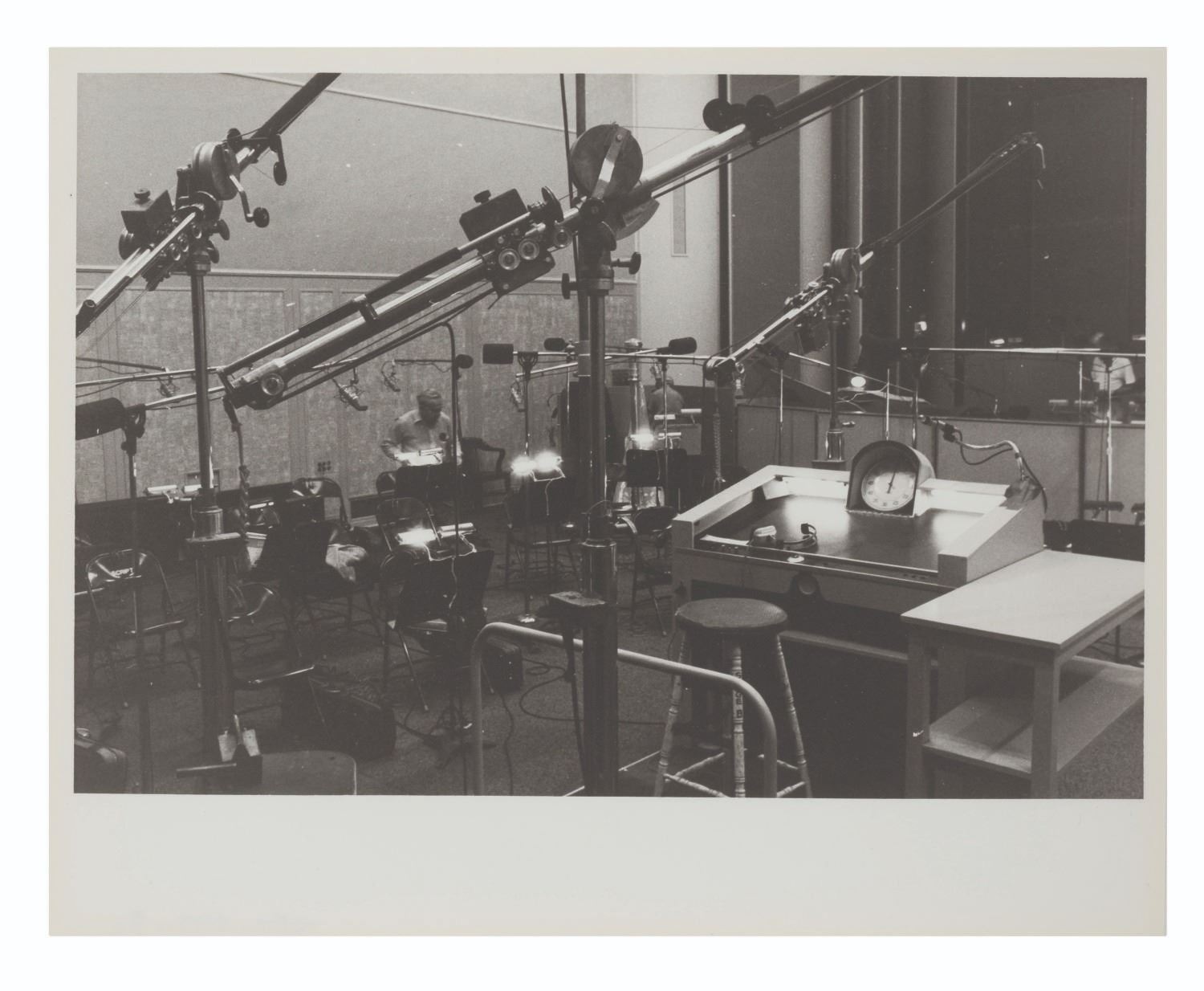 (Walt Disney Imagineering, 1981) A call sheet and 13 photographs from an EPCOT orchestra recording session for Future World. The call sheet lists 53 musicians by name scheduled to record The World of Motion Center Core and Land Pavilion Boat Excursion. The thirteen photos show the recording area being set up for the musicians' arrival. The 8.5" x 11" call sheet and 8" x 10" photos are in very good condition with light wear from production use.