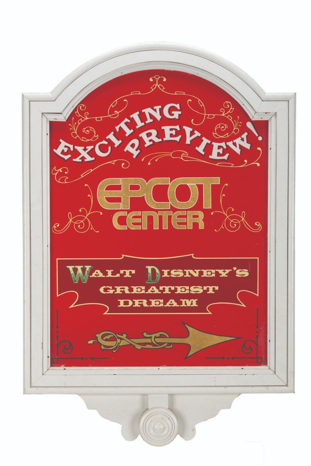 (Walt Disney World, 1981) A sign from the EPCOT Preview Center, located on Main Street, U.S.A. at the Magic Kingdom. Measuring 24.25" x 35.25", the wooden sign is in good condition with stains, scuffs, spotting, and wear from Park use.