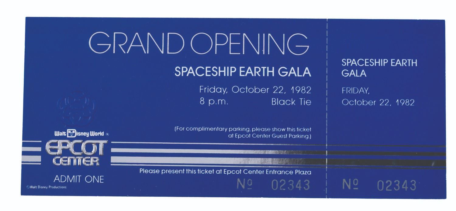 (EPCOT, 1982) A ticket for the October 22, 1982, Spaceship Earth Gala, held as part of the three-day EPCOT Grand Opening Celebration. The black-tie event for VIPs and guests of Walt Disney Productions was held in Future World and featured performances by some of America's greatest jazz bands, including Count Basie and his orchestra, Woody Herman, Lionel Hampton, Harry James, and the Glenn Miller Orchestra. Measuring 3" x 7", the ticket is in fine condition.