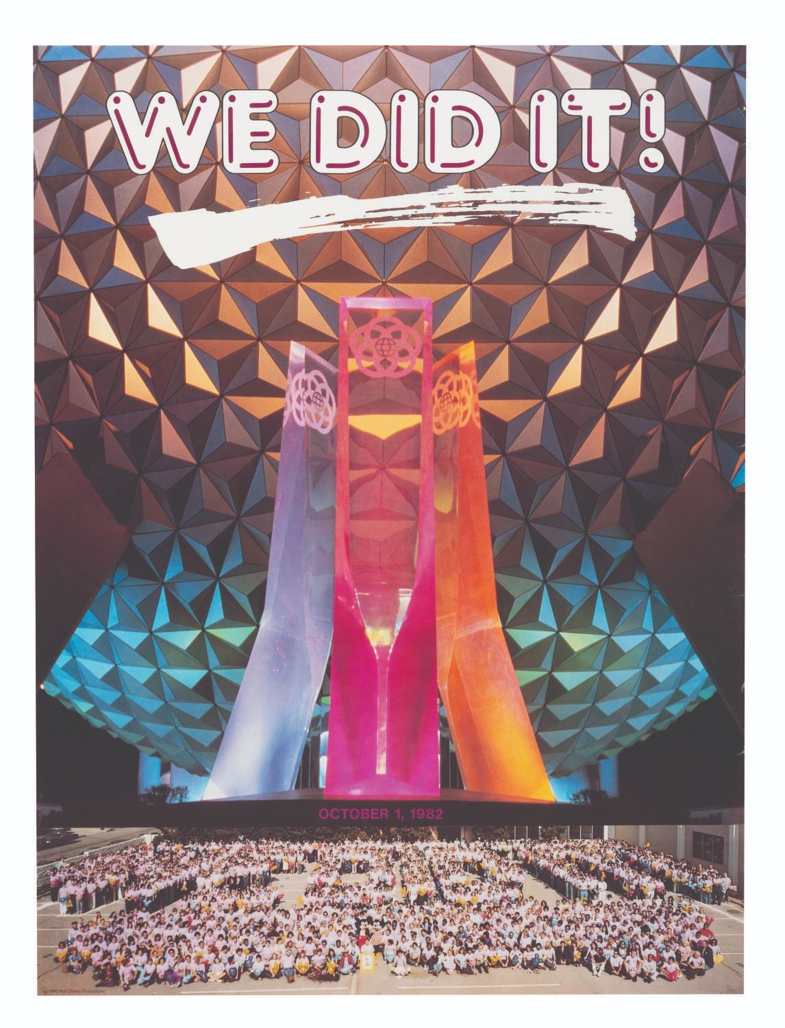 (EPCOT, 1982) An Imagineer exclusive poster created to commemorate the completion of EPCOT Center and its opening on October 1, 1982. Measuring 18" x 24", the poster displays in good condition with edge wear and creasing, and areas of tape and adhesive residue on the reverse.