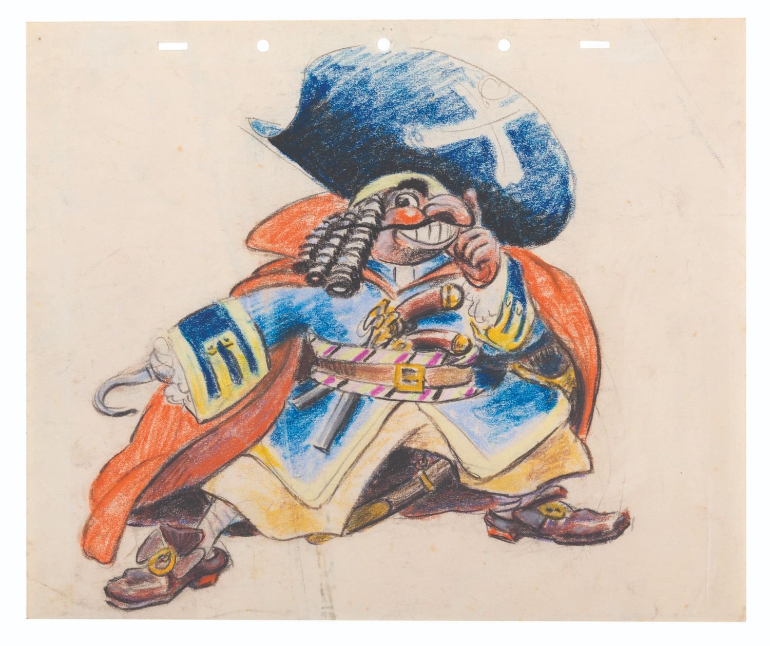 (Disney, 1930s-40s) An early character development sketch of Captain Hook for “Peter Pan.” Walt and his team of animators began working on the film during the 1930s but had to put it on hold until the late 1940s because of World War II. With a character image size of 8" x 9.25" on 9.25” x 11” paper in a 12.5” x 14” matte, the drawing, accomplished in graphite and colored pencil displays in good condition with creases, upper right corner folds, and stains, while the matte exhibits spotting and discoloration from age.