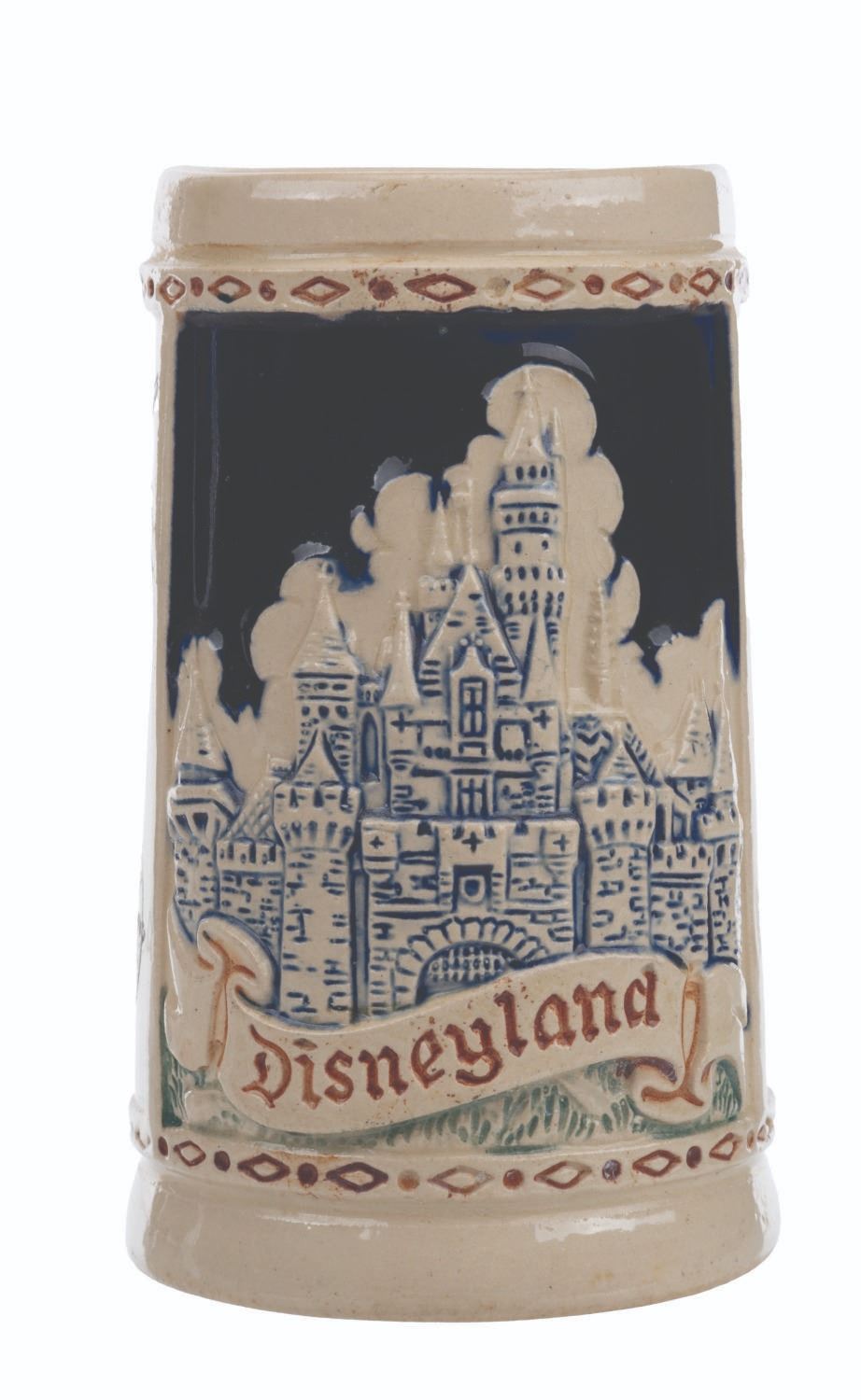 (Disneyland, 1956) An early ceramic Disneyland stein produced in Germany. Around the sides are a beautiful hand-painted relief of Sleeping Beauty Castle and imagery from the Park's lands. Measuring 5.5” tall and 3.25 in diameter, the ceramic stein is missing its original lid and is in good condition with paint loss from age, heavy crazing, stains, scuffs, and a crack near the top of the handle.