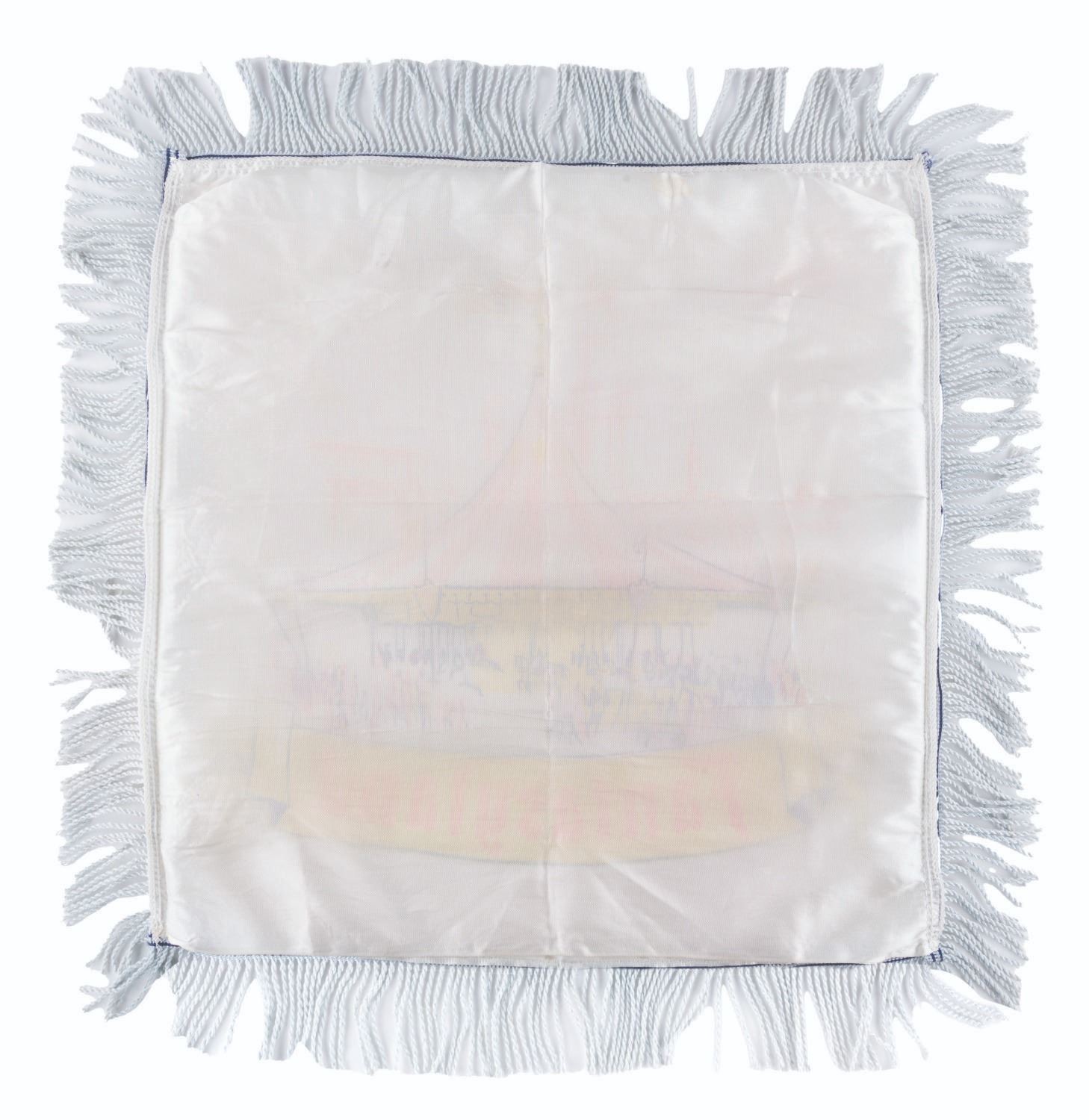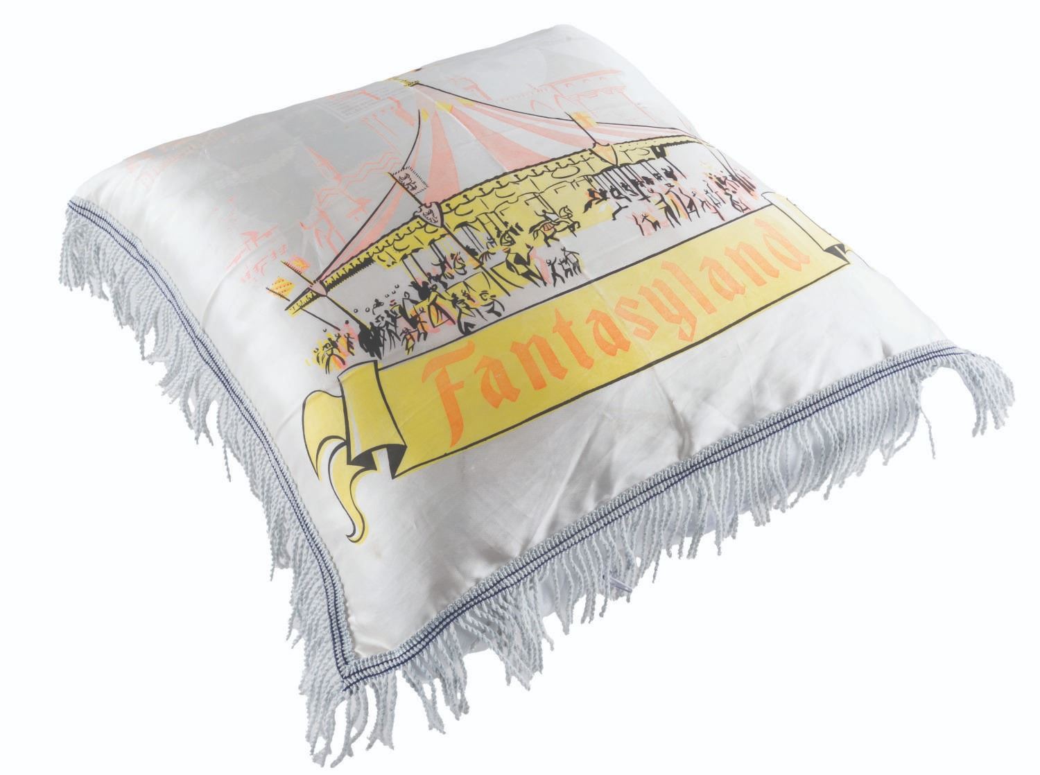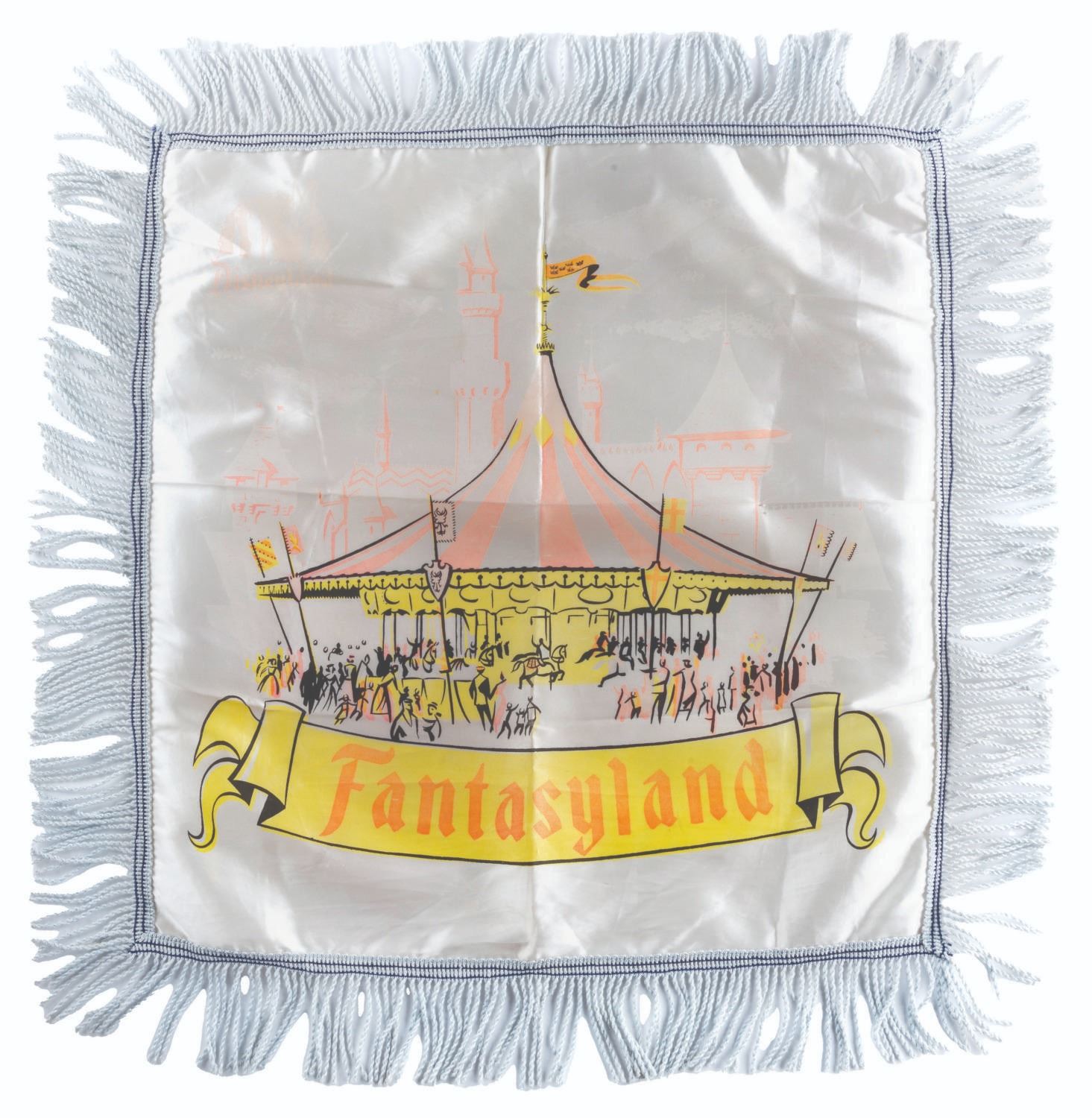 (Disneyland, 1954-55) A souvenir of Disneyland pillowcase featuring Fantasyland's King Arthur Carrousel. Dated as 1954 and measuring 17” x 17”, the pillowcase is in good condition with fading and fold lines from storage.